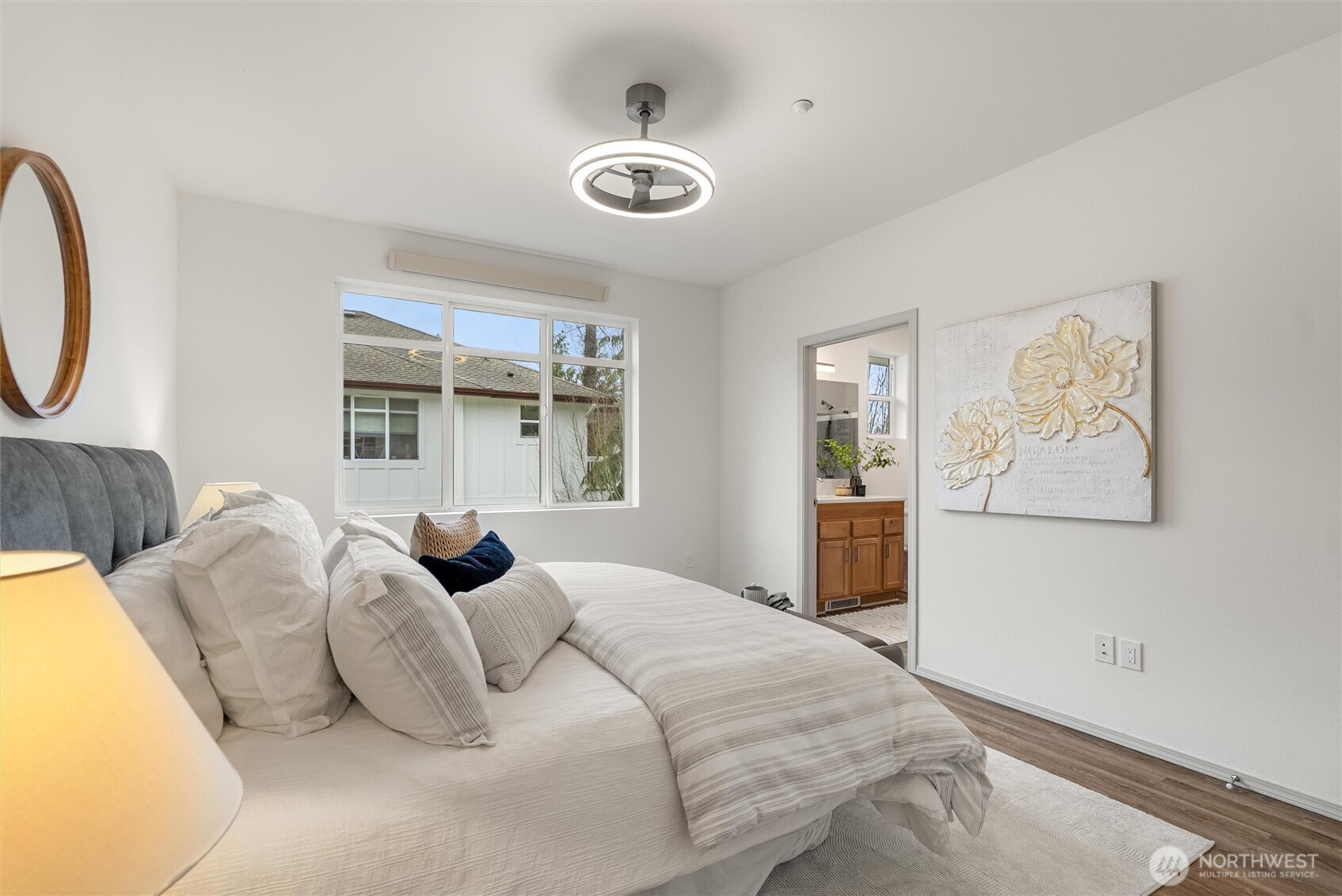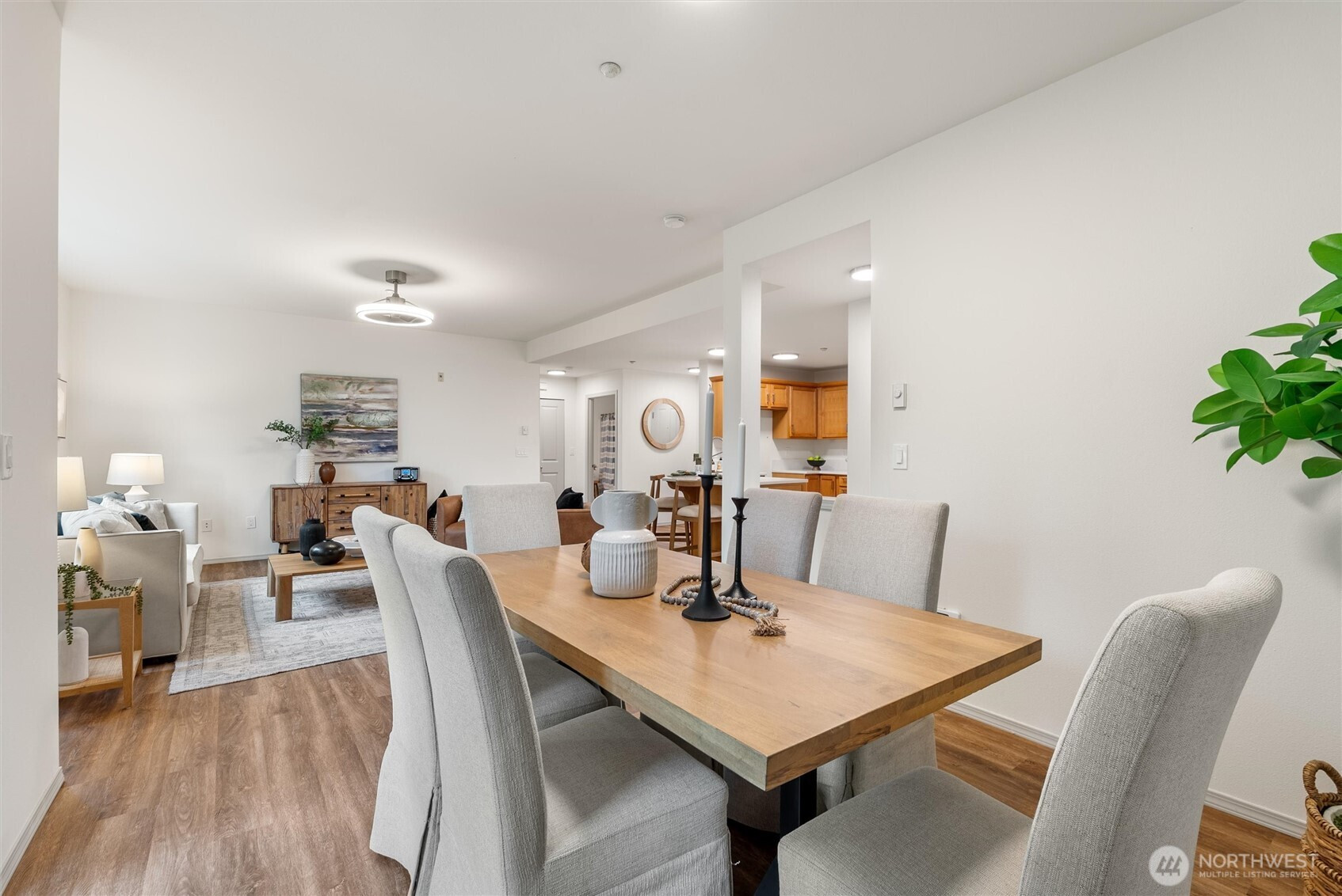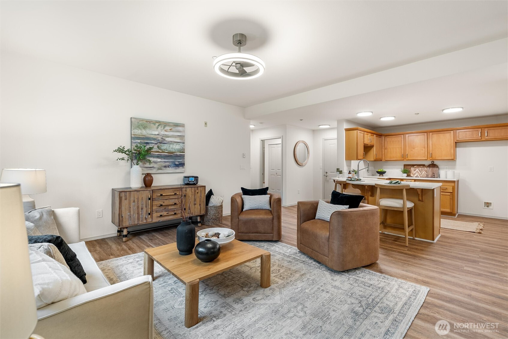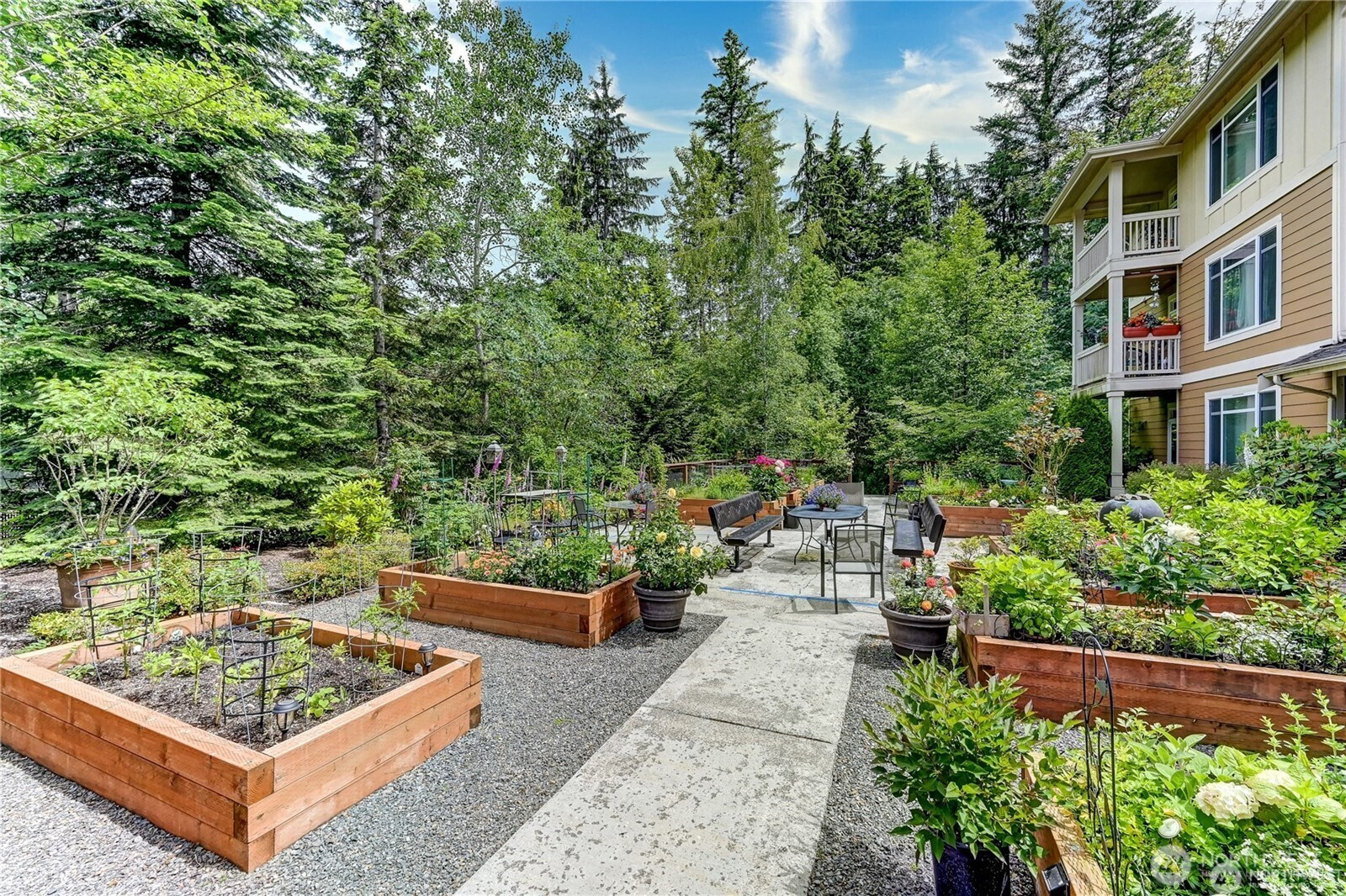 Upper-Floor Corner Retreat at Sundance Glen – Move-In Ready! Welcome to peaceful, easy living in this bright and spacious upper-level 2-bedroom, 1.75-bath residence, offering the perfect blend of comfort, convenience, and a low-maintenance lifestyle—complete with a private one-car garage and elevator access for true zero-stair living. The open-concept layout connects the kitchen, dining, and living areas seamlessly, while large windows fill the home with beautiful natural light. The kitchen features quartz counters and a convenient seating bar, perfect for casual meals or chatting with friends while you cook. Plus, enjoy a $5,500 credit at closing for new appliances—a great opportunity to add your own style. Slide open the door to your private deck surrounded by mature trees—an ideal spot for morning coffee, a good book, or simply relaxing after a long day. This secure, pet-friendly community offers controlled building access, shared gardens, and welcoming gathering spaces where neighbors connect. Guests will appreciate the abundant parking and the community’s flexible age policy (primarily 55+ with up to 20% of homes available for residents 18–54). Walk to Trilogy Redmond Town Center, coffee shops, shopping, restaurants, and nearby trails; the golf club course at Redmond Ridge; major tech campuses; and convenient commuter routes. Appliance package available: washer/dryer, dishwasher, fridge, range/oven, microwave $5,500. The seller will select, or the buyer may choose.