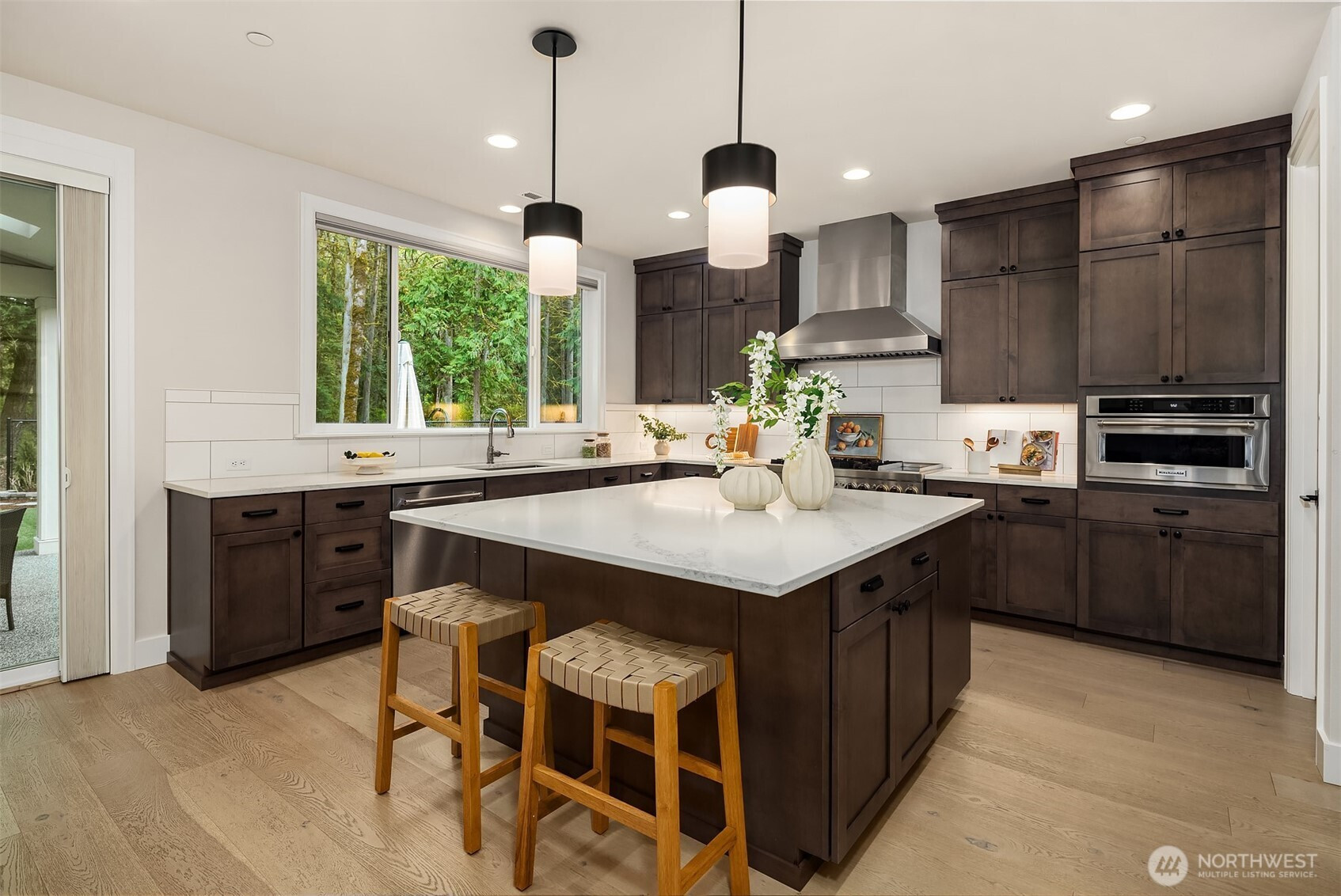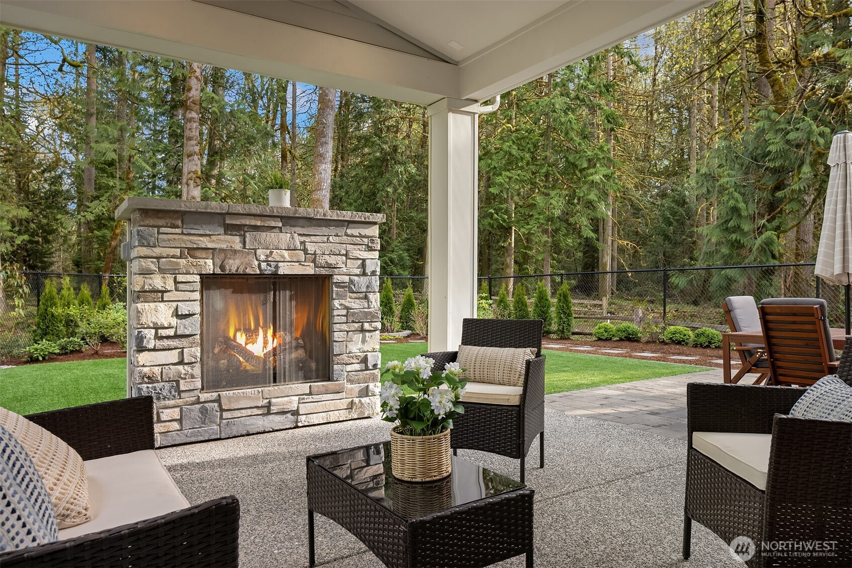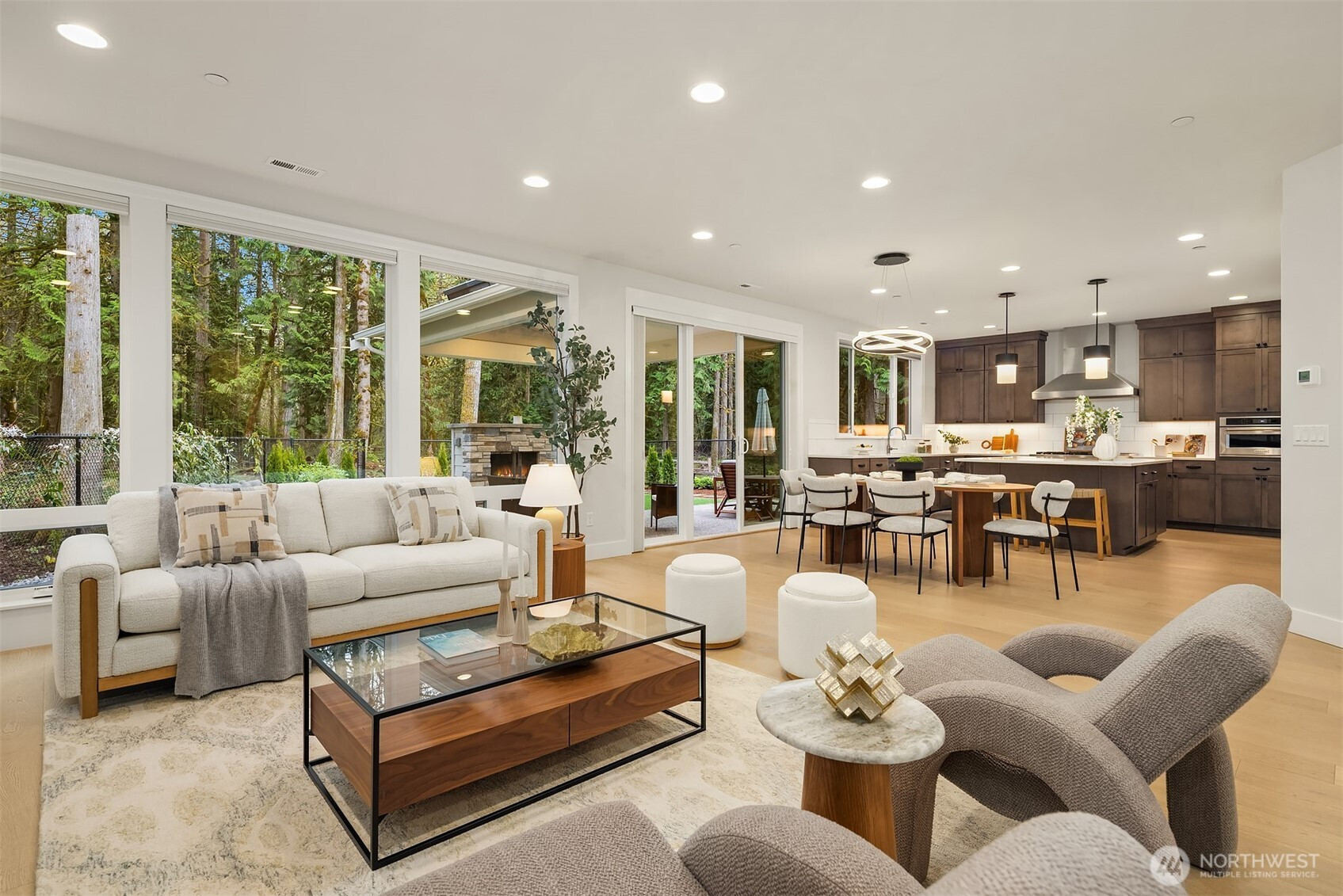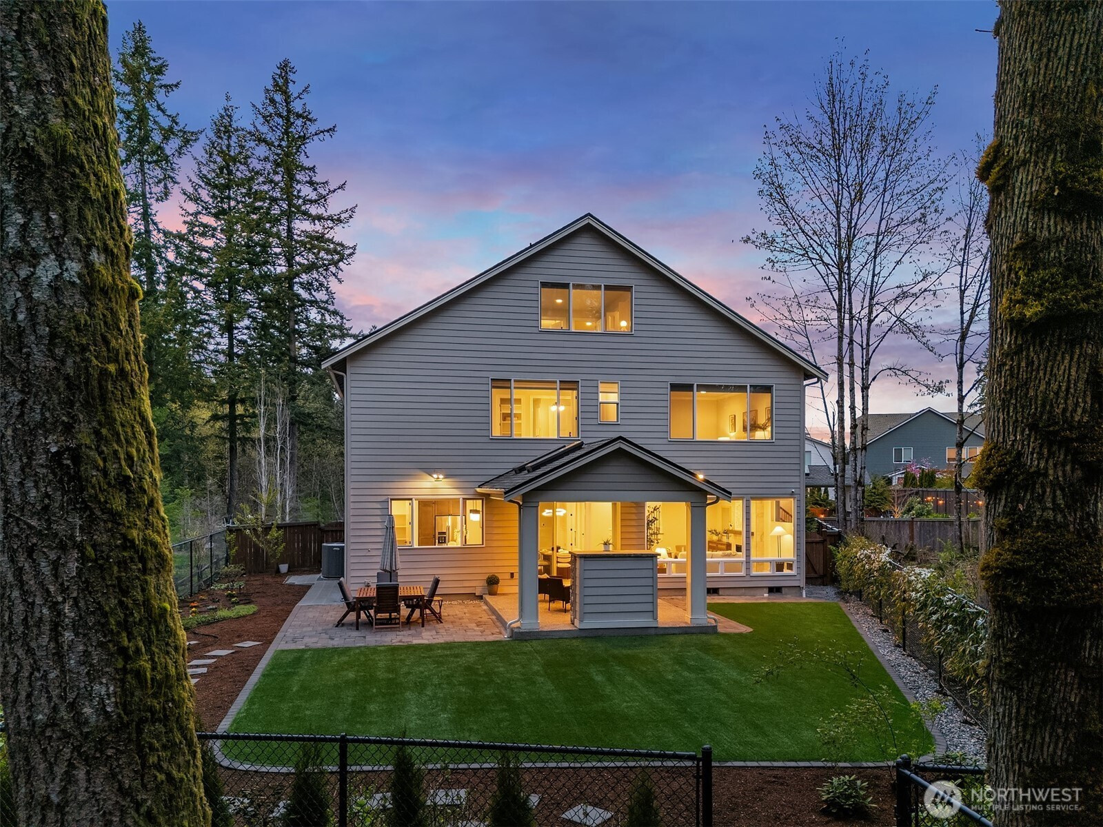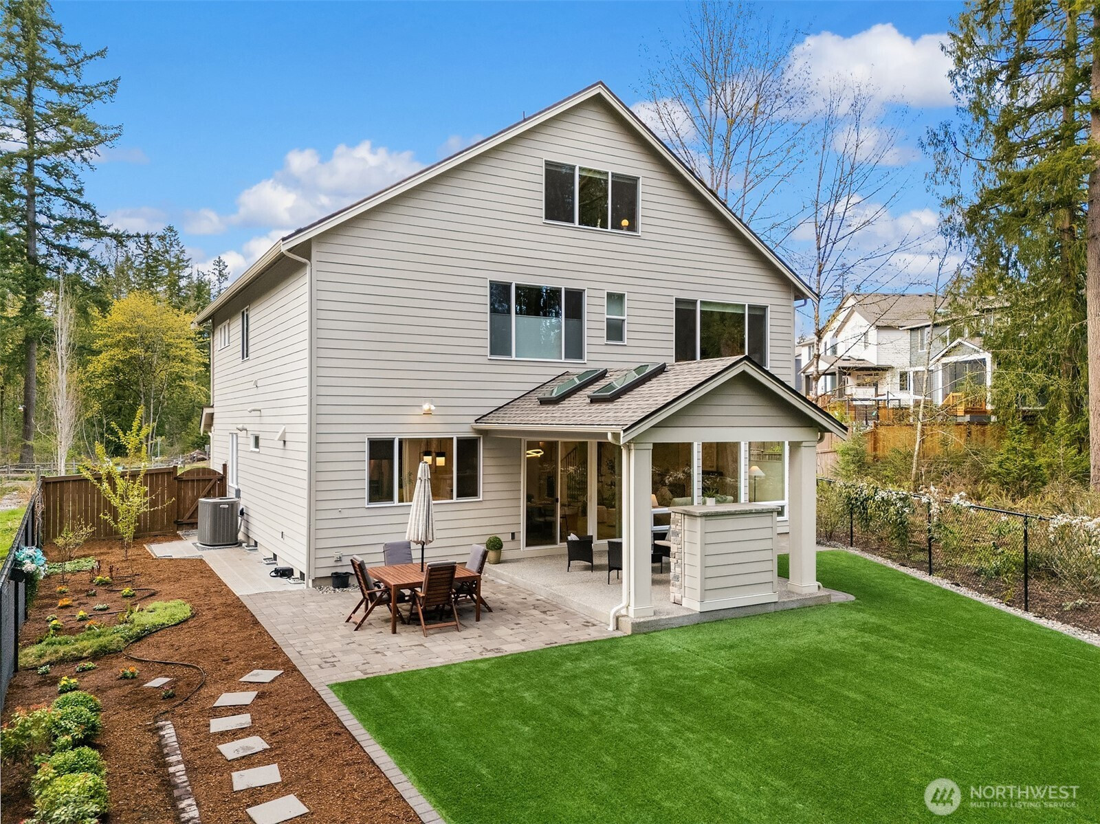 Better than new Murray Franklin resale in a beloved Sammamish neighborhood, offering the perfect blend of sophisticated design and natural serenity. Tucked away at the end of a quiet drive and bordered by protected green belts on three sides, this exceptional 4-bedroom, 3.5-bath home provides rare privacy and peace of mind. Step inside to an open-concept layout filled with high-end finishes and effortless comfort. The chef’s kitchen shines with premium appliances, ideal for everyday living and entertaining. Enjoy year-round comfort with central A/C, while the luxurious primary suite serves as a true retreat, complete with a spa-inspired bath featuring heated floors. Designed for modern living, this Smart Home-ready residence includes Ethernet in every room, ultra-fast Fiber internet, and whole-house blinds with motorized and automatable treatments across the main level. The garage is equipped with a dedicated EV charging outlet. Outdoor living is effortless with professionally designed, low-maintenance landscaping and premium artificial turf for year-round greenery. Located within the highly rated Lake Washington School District and less than a mile to WA-202 for easy access to Redmond and Bellevue, this home offers an unmatched combination of privacy, convenience, and lifestyle.