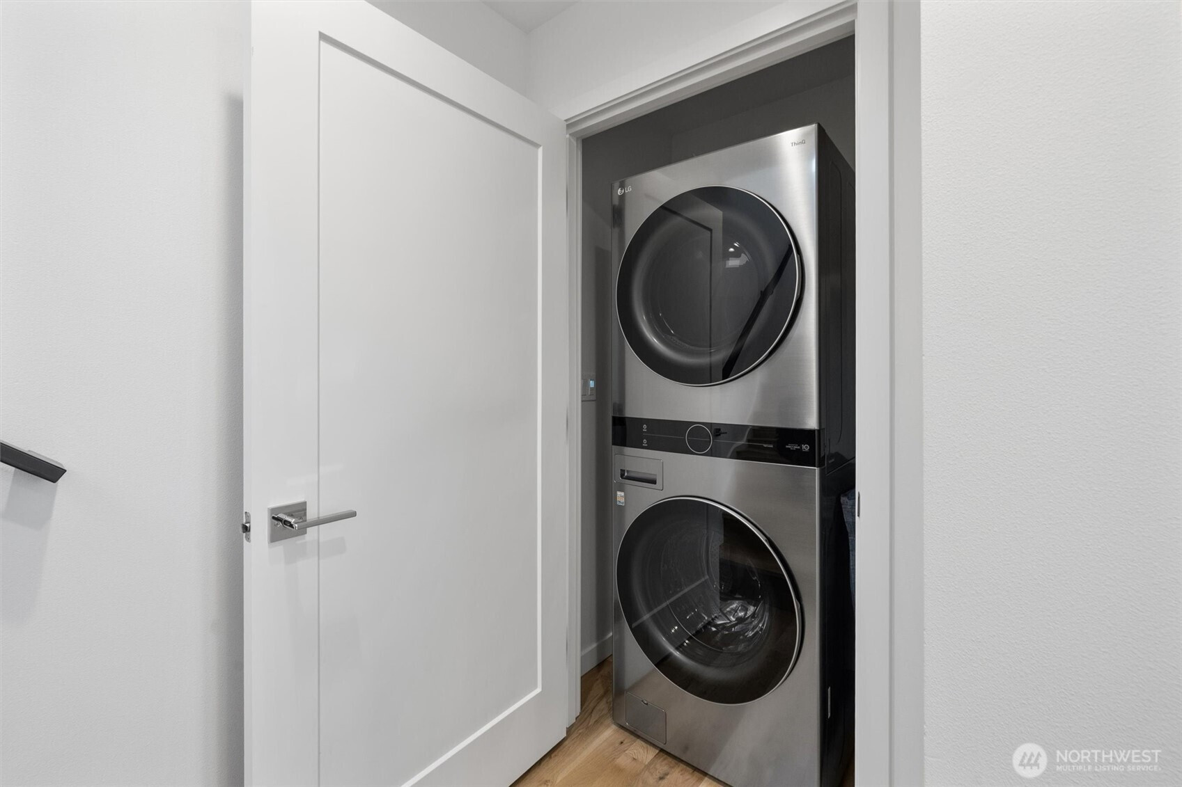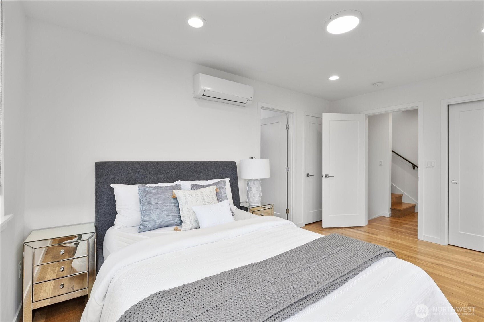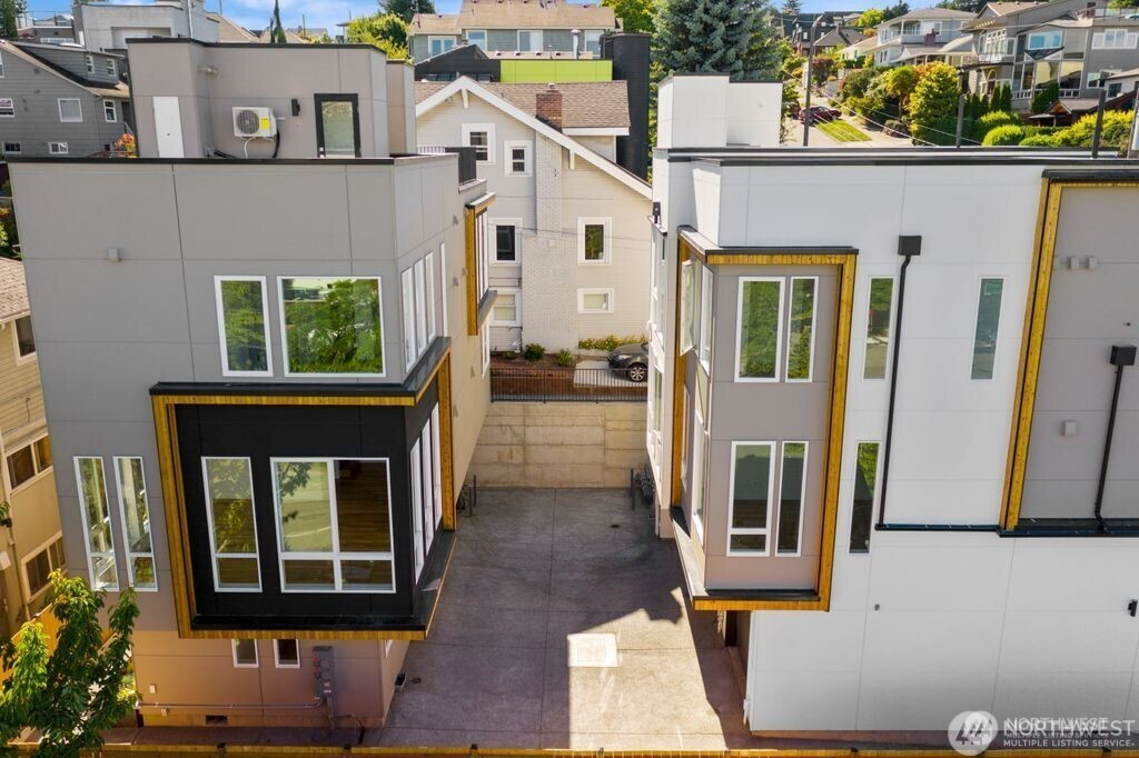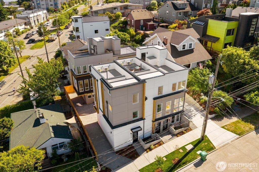 Beautifully designed end-unit home showcasing sweeping views of Downtown Seattle and Mount Rainier. This immaculate, move-in ready residence is nestled in a highly desirable neighborhood and offers the perfect blend of style, comfort, and convenience. The inviting open-concept floorplan is enhanced by designer finishes, rich hardwood floors, and abundance of natural light throughout. Expansive living room windows with motorized blinds frame the stunning views. Sleek kitchen features stainless steel appliances, custom cabinetry, and contemporary touches ideal for both everyday living and entertaining. Retreat to the luxurious primary suite complete with spa-inspired bath and walk-in closet. Rooftop deck provides breathtaking panoramic views-perfect for relaxing or hosting guest. Additional highlights include dedicated off-street parking with EV charger ready to go, an easy commute to downtown and just a few blocks from Magnolia Town Center's shops and amenities. No HOA dues. Potential assumable VA loan at 2.625%.