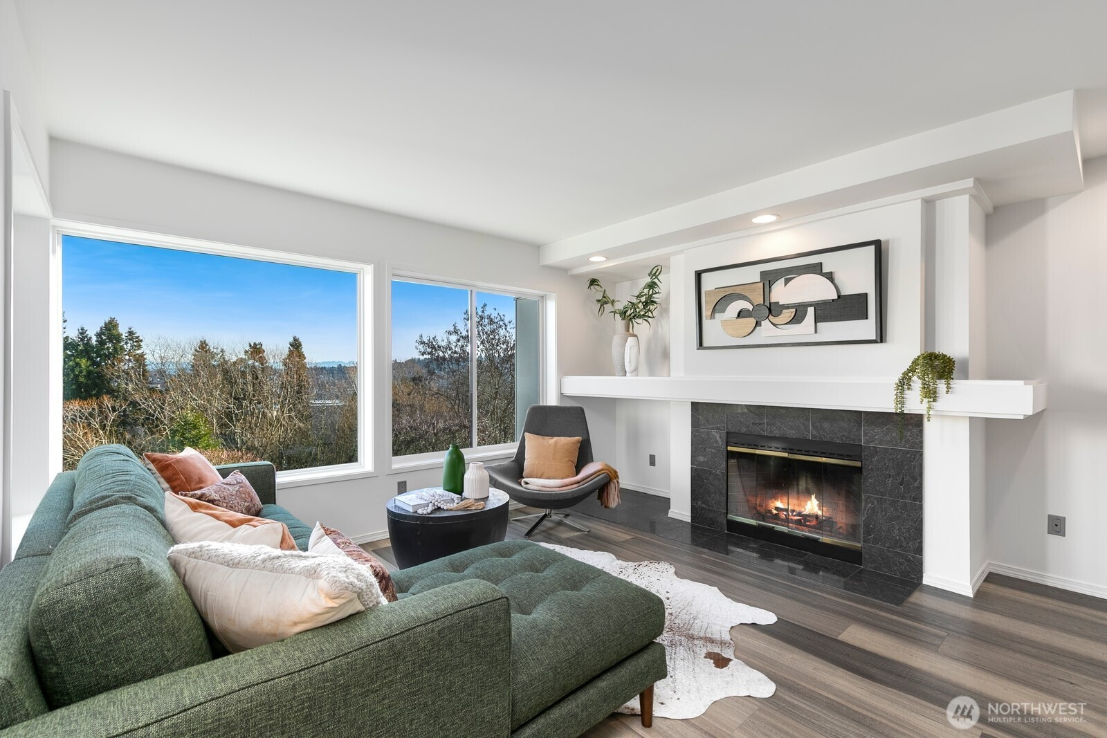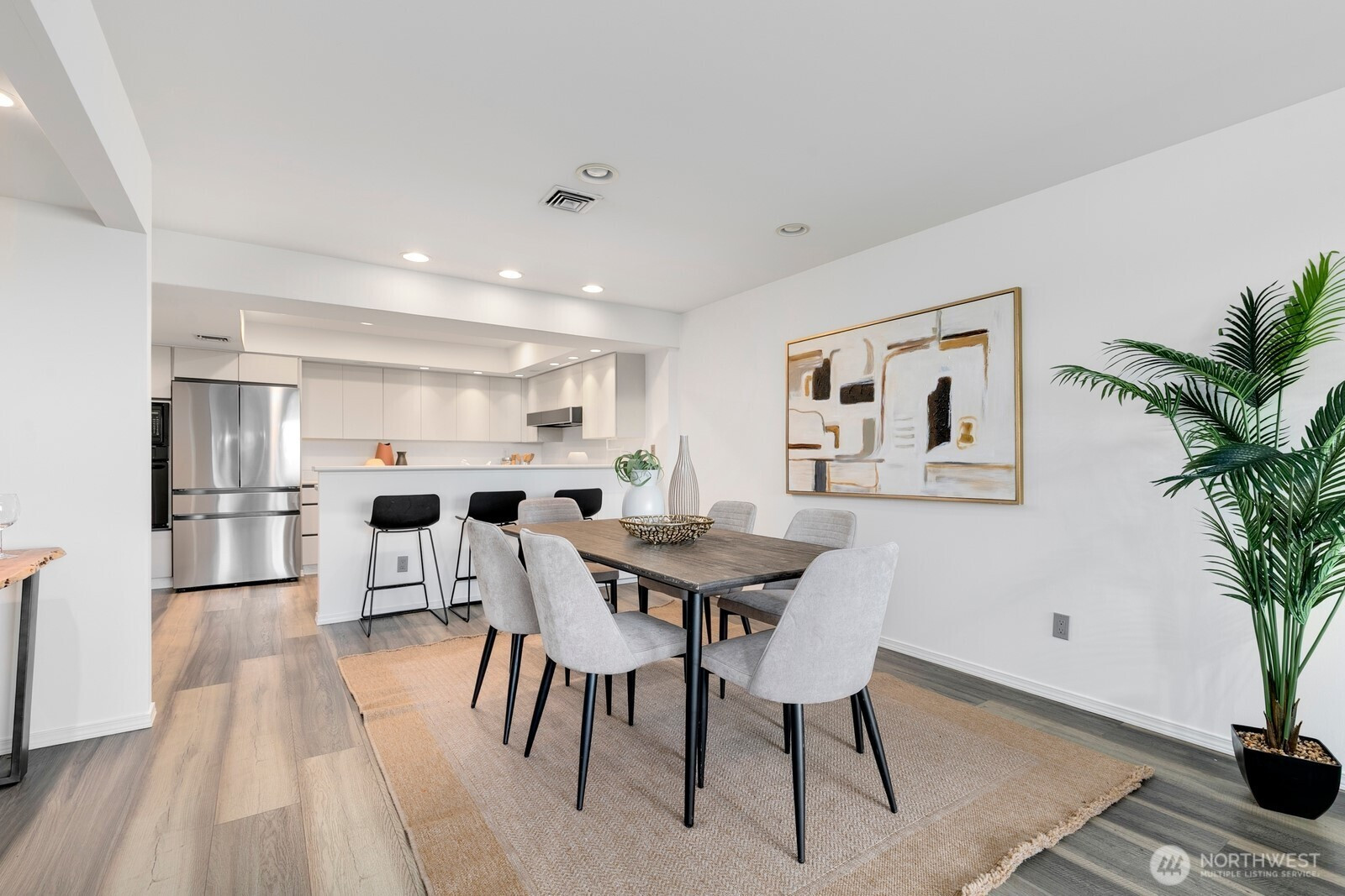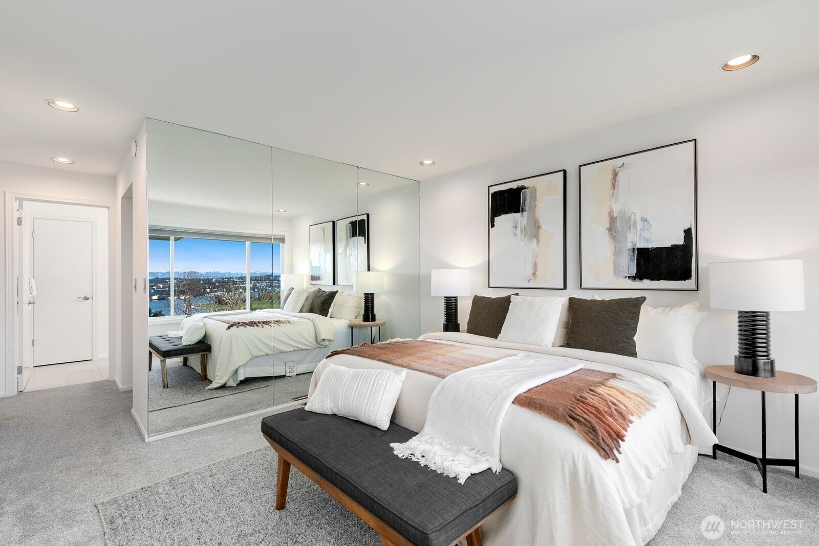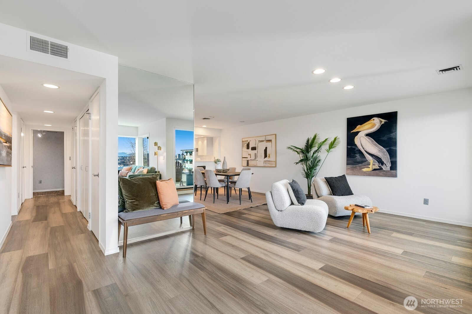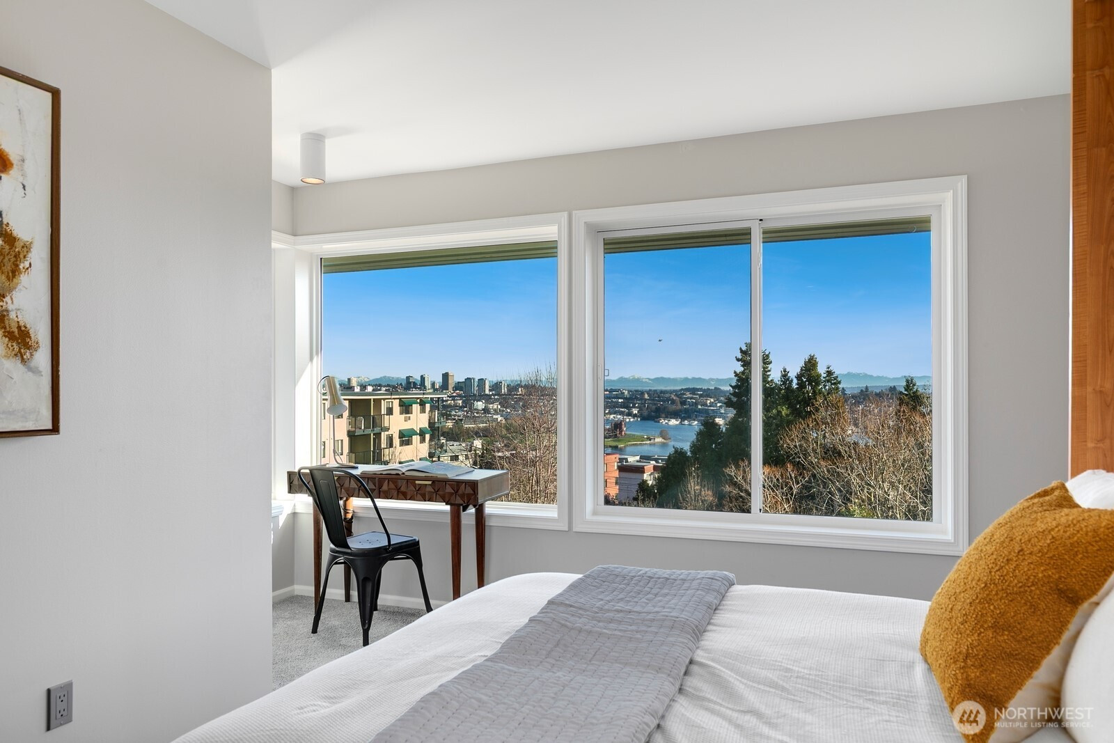 Welcome to the newly reimagined Windwatch, where urban living blends with a sense of quiet seclusion. This two-bedroom, two bath residence lives like a town home, complete with its own private entrance and an attached two-car garage. Enjoy sweeping views of Lake Union and the Cascade Mountains from both levels. The main floor features an open kitchen that flows seamlessly into generous dining and living spaces—ideal for everyday living and entertaining. The upstairs offers a generously sized primary with built-in storage, an enormous walk-in closet and attached bath with a large shower and linen closet. Additionally, you will find a second bedroom and 3/4 bath. Recent updates include fresh interior paint, a new heating/ac unit and epoxy-coated garage floors. Move in with confidence knowing the building has undergone extensive renovations, including a durable Ceraclad exterior envelope, all-new windows, a new roof, and updated decks. Pet-friendly with no rental cap, the Windwatch offers both lifestyle and long-term peace of mind.