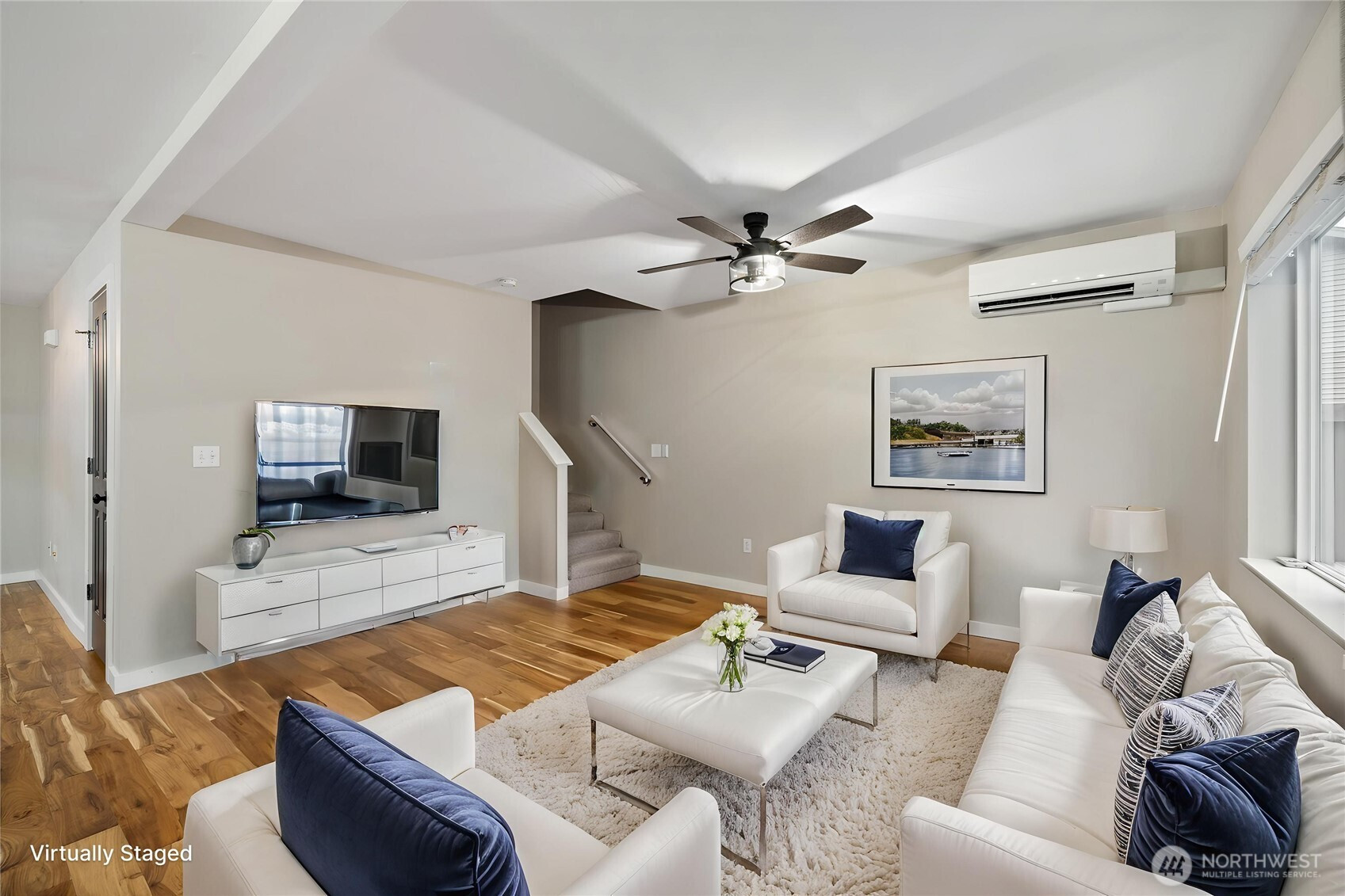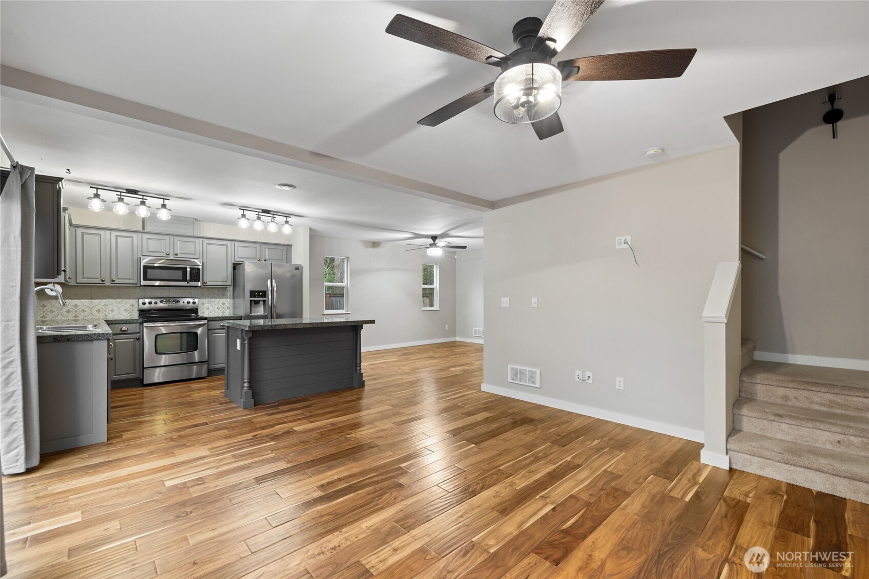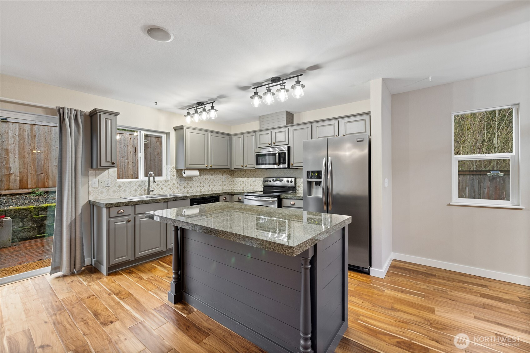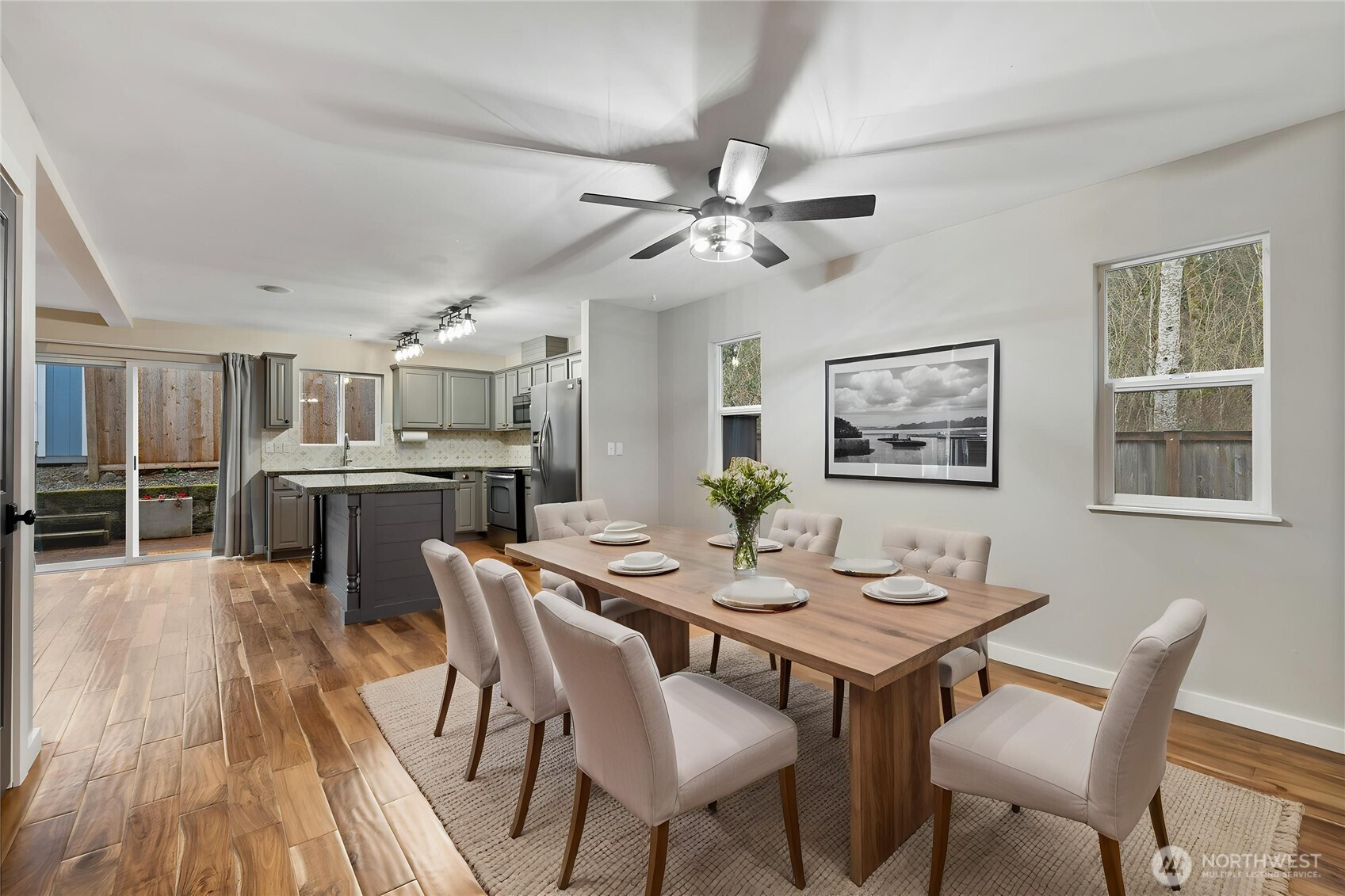 Welcome to the highly sought-after Glacier Valley community! This beautifully maintained home features an open-concept layout designed for comfortable living and easy entertaining. The spacious kitchen is the heart of the home, featuring tile granite countertops, a custom tile backsplash, stainless steel appliances, a large kitchen island, and easy access to the pantry.Updated wood flooring and four overhead fans add comfort and style throughout the home, while three mini-split systems provide efficient heating and air conditioning year-round. Open floor plan provides spacious feel to large dining room and living room zones all beautifully connected to the kitchen space. Upgrades throughout the home include custom tile, updated paint colors, and wood flooring. Upstairs, both bedrooms offer private en-suite bathrooms, creating ideal separation and convenience. The attached garage and long driveway offer excellent parking and storage options. Step outside to enjoy the fully fenced backyard situated on a peaceful corner lot backing to a greenbelt. The outdoor space is perfect for relaxing or entertaining with an expansive deck, patio area, garden beds, and three storage sheds. Park and trails are just minutes away, making it easy to enjoy the outdoors.Located in the desirable Tahoma School District, this home offers privacy, thoughtful upgrades, and a larger lot in one of the area's most welcoming communities. Ideal location with larg lot and custom details. This is it!
