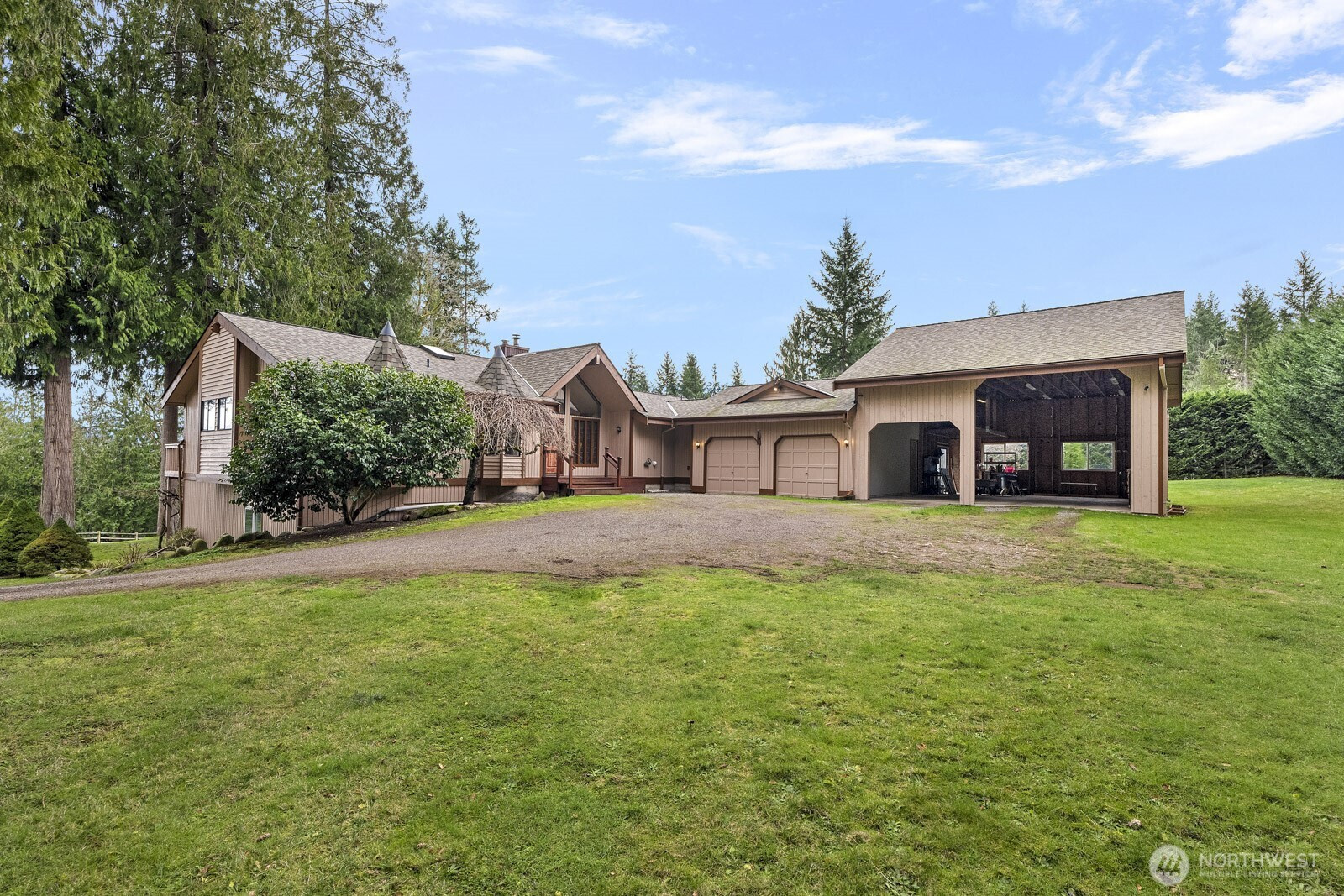 Tolt Hill standout! Beautiful lodge style home with mountain and valley views. Enter to soaring ceilings and wall of windows that frame the views. 2 car attached garage plus an extra large RV garage/shop. Plenty of space for all of your toys and projects. Fully daylight lower level. Excellent floor plan with 3 bedrooms plus multiple other rooms with closets and flex spaces. Primary suite on main with vaulted ceilings, views, and en-suite bath. Main floor office. Spacious acre lot with ample room for play, gardening, relaxation, or entertaining. Oversized view deck. Convenient location with easy access to 202 for quick access to Redmond, Bellevue, Issaquah. Highly rated Snoqualmie Valley schools. No HOA. Welcome home!