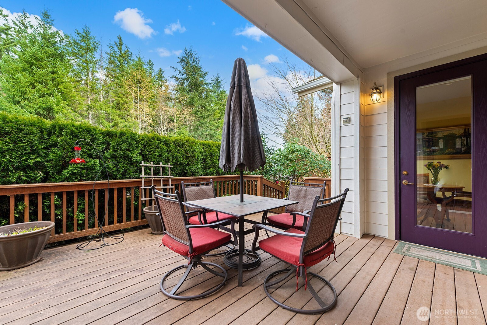 Welcome to Trilogy at Redmond Ridge, a premier 55+ Community. The desirable Bainbridge flooorplan showcases a bright, spacious great room with high ceilings, large windows, gas fireplace, and built-in speakers-perfect for both relaxing or entertaining. Rich Hardwood floors flow throughout the living spaces. The formal Dining room with an over-sized skylight is ideal for hosting memorable gatherings. The open Kitchen features a large island with eating bar, stainless-steel appliances, and Granite countertops, plus a sunny breakfast nook for casual dining. Step outside to the large, private Deck perfect for morning coffee or al fresco dining. The generous primary suite is bathed in natural light and offers a spacious walk-in closet and a private Bath with dual sink vanity. A guest bedroom with a Murphy Bed and adjacent full bath ensures comfort and flexibility for visitors. A versatile Den or Office near the entry includes glass-panel French doors, a large picture window, and custom built-in shelving with workstation-ideal for working from home or hobbies. Situated on a prime, sunlit corner lot in a quiet cul-de-sac, this home is just steps from two Trailheads making it perfect for outdoor enthusiasts. Additional highlights include a 2-car garage & central AC. Residents enjoy resort-style amenities including a clubhouse, bistro, indoor pool and spa, walking track, fitness center, Pickleball & Tennis courts, plus miles of walking trails to embrace the outdoors.