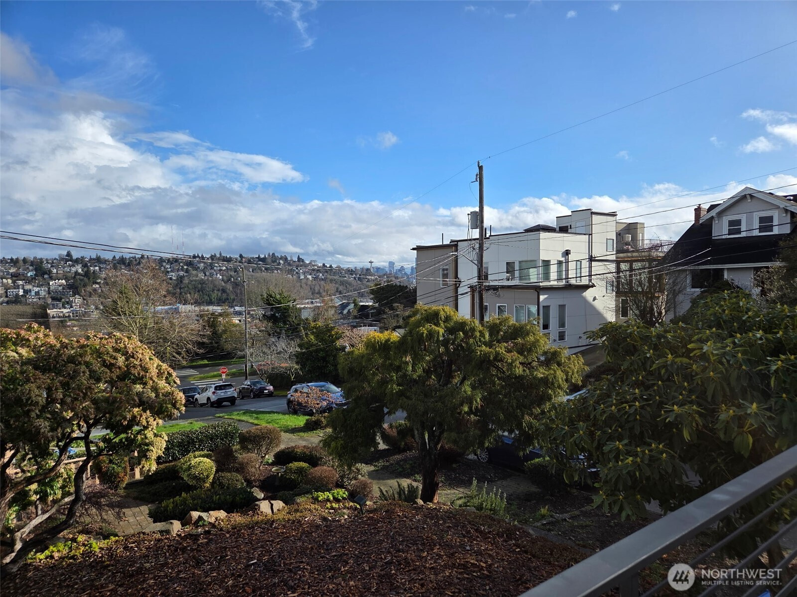 1940's charmer combines classic details with modern updates including renovated kitchen and bathroom. Hardwood floors throughout! Right sized living room with wood burning fireplace and south facing windows that bring the light in. The adjacent dining space includes built-in bench seating and corner windows that show off Space Needle and city scape. Extensive kitchen cabinets and countertop space; all major appliances and seating for two with a view. Bedrooms are up a short flight of stairs, both overlooking yard and garden. The lower level is daylight walkout, has plumbing for an additional bathroom and is fully finished. It's a great space for Mariner and Seahawk viewing. Would also work great as home office or conversion to a 3rd bedroom. The private yard is generous in size, is level and fully fenced, making it secure for play and pets with low-maintenance garden space and mature plantings, including Venus Dogwood, Japanese Bell tree, Persian Parrotia, Corkscrew Hazel, multiple Japanese Maples and 4 varieties of producing blueberry shrubs! The south facing deck with custom wrought iron railings boasts city and territorial views with plenty of room for everyone. Detached one car garage fits most mid-sized cars along with additional storage. Efficient mini-split HVAC and reliable Hardy Board siding with new exterior paint in 2020 & new fencing. A 20 minute walk (1/2 mile) to Magnolia Village, 15 minutes to downtown Seattle by car or the 33 bus line at end of street.