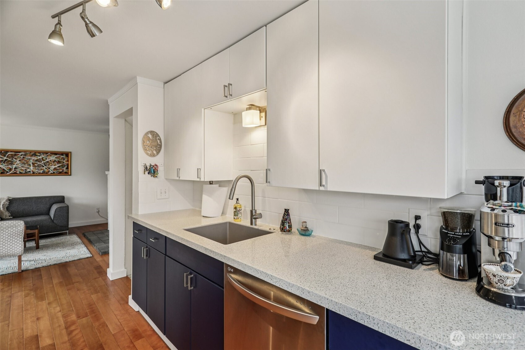1940's charmer combines classic details with modern updates including renovated kitchen and bathroom. Hardwood floors throughout! Right sized living room with wood burning fireplace and south facing windows that bring the light in. The adjacent dining space includes built-in bench seating and corner windows that show off Space Needle and city scape. Extensive kitchen cabinets and countertop space; all major appliances and seating for two with a view. Bedrooms are up a short flight of stairs, both overlooking yard and garden. The lower level is daylight walkout and fully finished; a great space for a Seahawk sized TV area or home office or pehaps a 3rd bedroom. The private yard is generous in size, is level and fully fenced with garden space and mature plantings including Venus Dogwood, Japanese Bell tree, Persian Parrotia, Corkscrew Hazel, multiple Japanese Maples, 4 varieties of producing blueberry shrubs! The south facing deck with wrought iron railings boasts city and territorial views with plenty of room for everyone. A detached one car garage with opener safely fits most mid-sized cars with room for additional storage. Efficient mini-split heating and cooling (2018) and a new compressor in 2023. Reliable Hardy Board siding with new exterior paint in 2020. New cedar fence (2020). A 20 minute walk (1/2 mile) to Magnolia Village and 15 minutes to downtown Seattle by car or little longer on the 33 busline at the bottom of Boston. Or ride your bike!