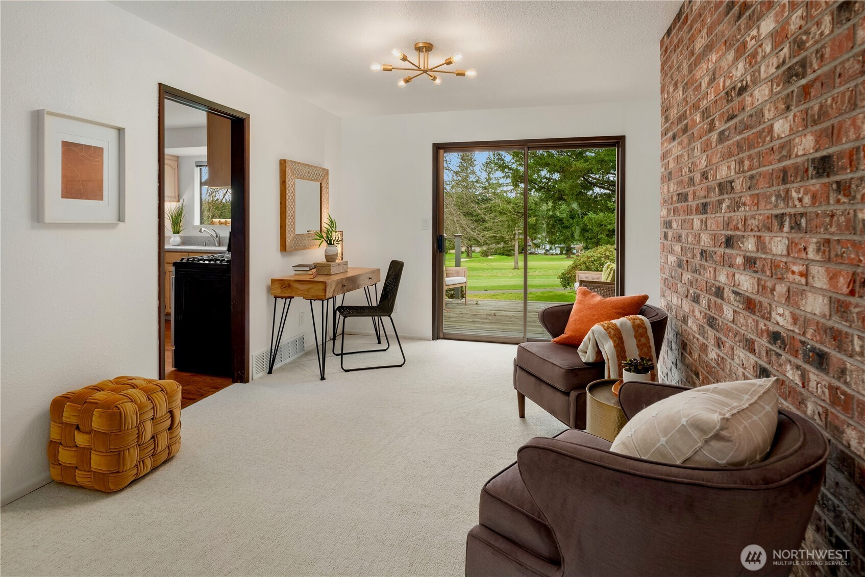 Perfectly positioned on the 14th hole at Meridian Golf & Country Club, this light-filled residence offers effortless one-level living, thoughtfully designed with nearly 2,000 square feet on the main level. The home features a sunken living room anchored by a cozy gas fireplace, creating a warm and inviting gathering space. Freshly painted interior, new carpet and rich hardwood floors blend seamlessly to deliver a move-in ready experience. Downstairs, an expansive lower level provides the perfect setting for entertaining with a dedicated bar area, along with additional storage and workshop space. A 2-car attached garage adds everyday convenience, while the golf course backdrop enhances the home’s sense of tranquility and connection to the outdoors. Meridian Valley Country Club is one South King County's premier private clubs, offering a rare blend of championship golf, natural beauty and a vibrant, community-driven lifestyle. Original owner and first time on the market in 50+ years - bright, spacious and ideally located, this is country club living at its best!