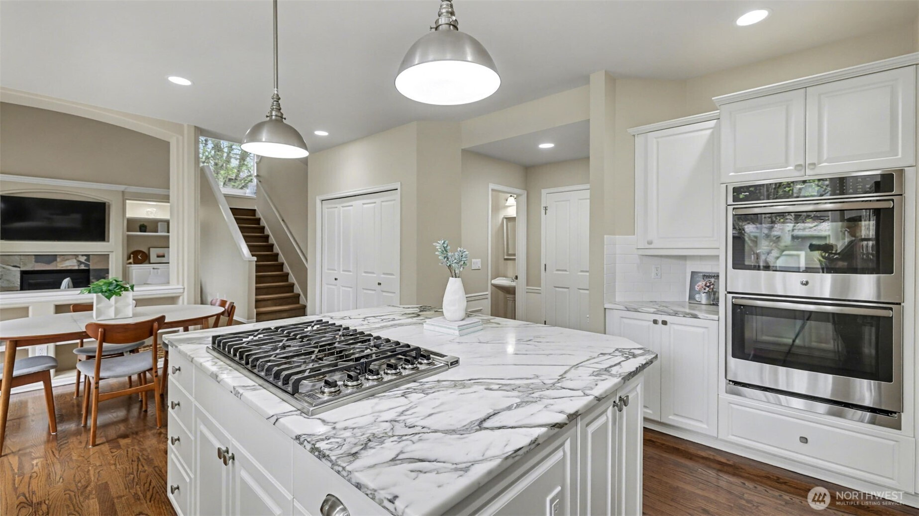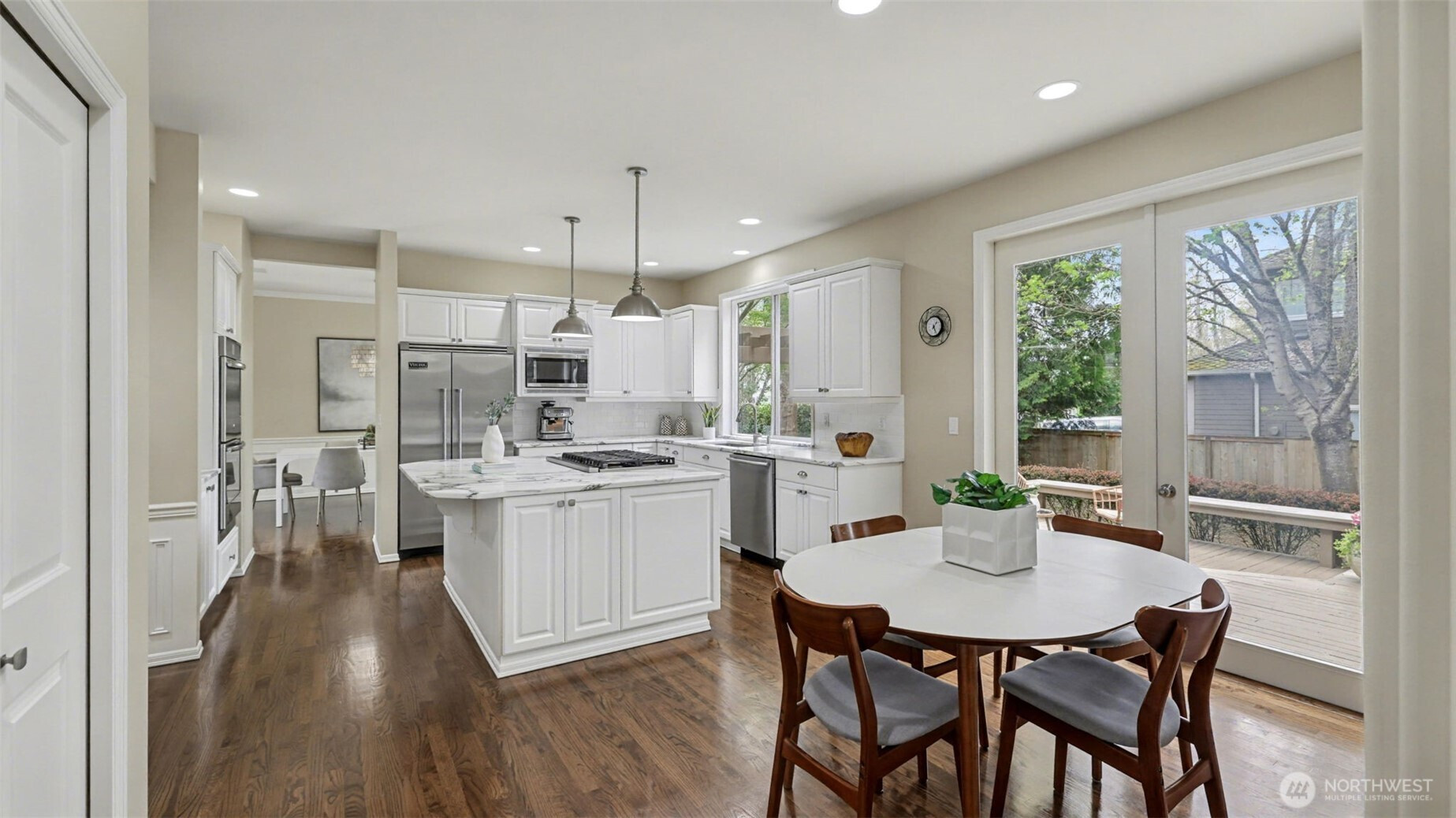 Gracefully sited on a meticulously maintained corner lot in a sought-after Sammamish neighborhood, this exceptional Murray Franklyn home blends timeless architecture with elevated modern updates - truly move-in ready. A welcoming foyer opens to refined formal living and dining spaces alongside a handsome den with custom built-ins, ideal for work or a quiet retreat. The beautifully updated chef's kitchen features creamy marble surfaces, subway tile, abundant cabinetry, and an impressive oversized island, all flowing seamlessly into the expansive family room with slate gas fireplace and integrated surround sound. Upstairs, the private primary suite offers a serene escape with a spa-inspired bath featuring a Maax soaking tub, custom tile shower, and heated floors. A separate wing provides versatility with a generous bonus room, additional bedrooms, and bath - perfect for guests and multi-generational living. Rich hardwood, detailed millwork, California Closets, and dual staircases showcase the homes thoughtful design and quality craftsmanship. Enjoy a private backyard oasis with a generous deck, pergola, and built-in seating. Ideally located within the award-winning Lake Washington School District, including Rachel Carson Elementary, and moments to parks, trails, the Plateau Club, and everyday amenities.