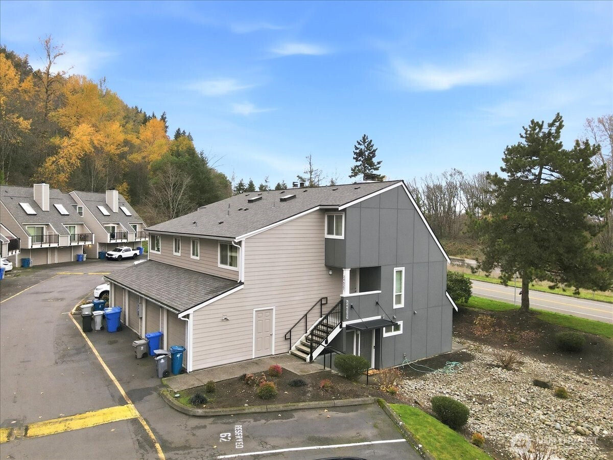 Enjoy peaceful, private living in this ground-floor end unit tucked against a serene natural backdrop.Open-concept living & dining area features a breakfast bar, pantry, and a cozy wood-burning fireplace. Single-car garage PLUS assigned uncovered spot, and in-unit laundry adds everyday convenience. Large windows fill the space with light, and a sliding door leads to a patio overlooking a lush lawn and stone-covered landscaping. Luxury vinyl plank floors. The community received major upgrades in 2020, including NEW roofs, gutters, windows, siding, patios, porches, garage doors, railings, exterior paint, & lighting. Low HOA dues. Pet-friendly. Close to shopping, parks, golf, & trails with easy access to I-5 &167. Great alternative to renting.