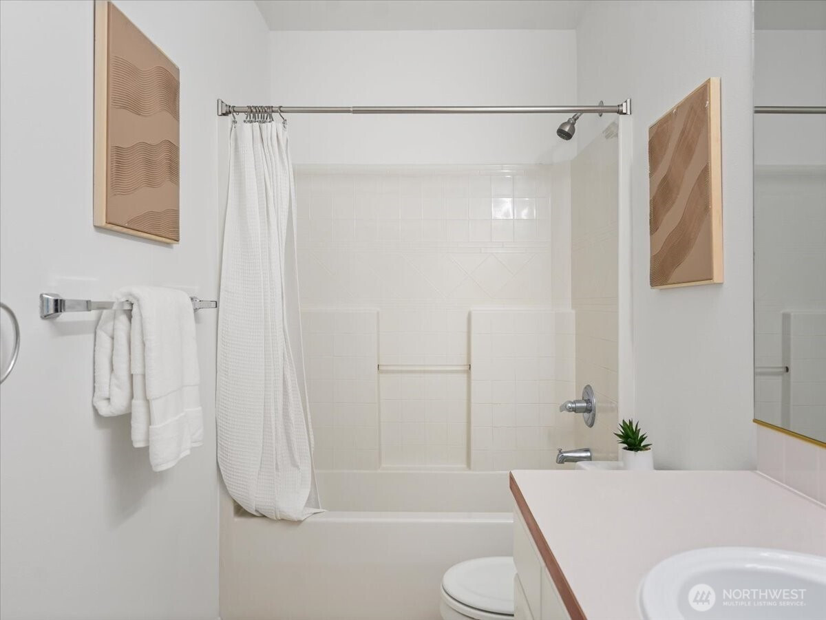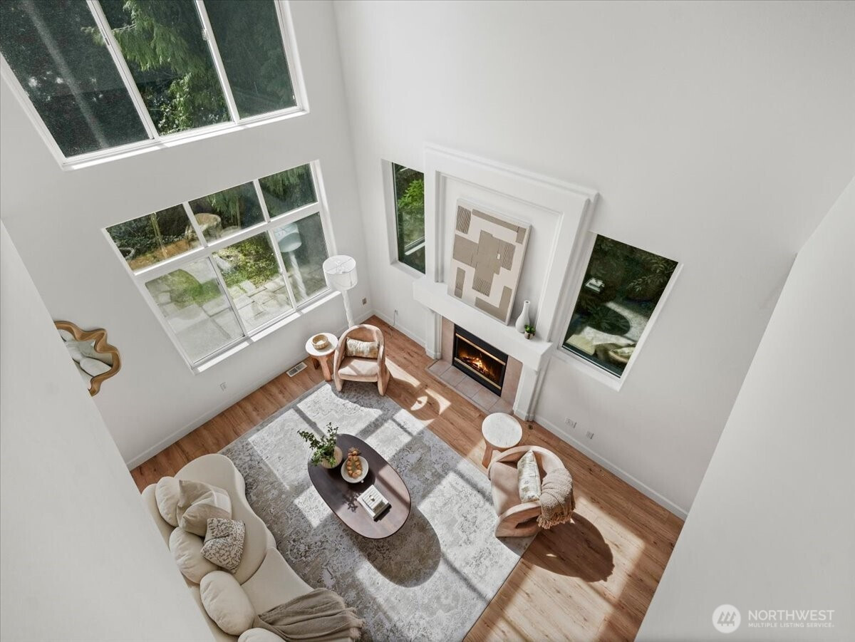 Set within Bellevue’s quiet Saratoga community, this beautifully refreshed home offers the rare combination of privacy, natural light, and unbeatable convenience. Just minutes from The Marketplace at Factoria, T&T Supermarket, I-90, and I-405, it provides easy access to Bellevue’s major employment hubs while feeling tucked away from the rush. Inside, a dramatic double-height living room and soaring window wall flood the main level with light, while the open kitchen, dining, and living spaces create seamless everyday flow. Brand-new carpet, fresh interior paint, and new main-level flooring add a crisp, move-in-ready feel. Upstairs, all three bedrooms are generously sized and bright, complemented by an open loft that works beautifully for office, study, or play. A smart, efficient floorplan makes the most of every square foot, and the easy-care yard offers low-maintenance outdoor living in a peaceful setting. Served by Woodridge Elementary, Chinook Middle, and Bellevue High.