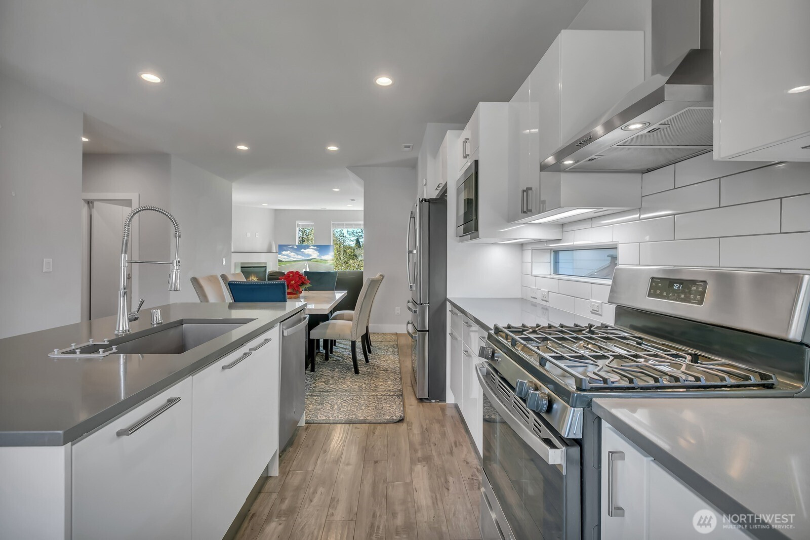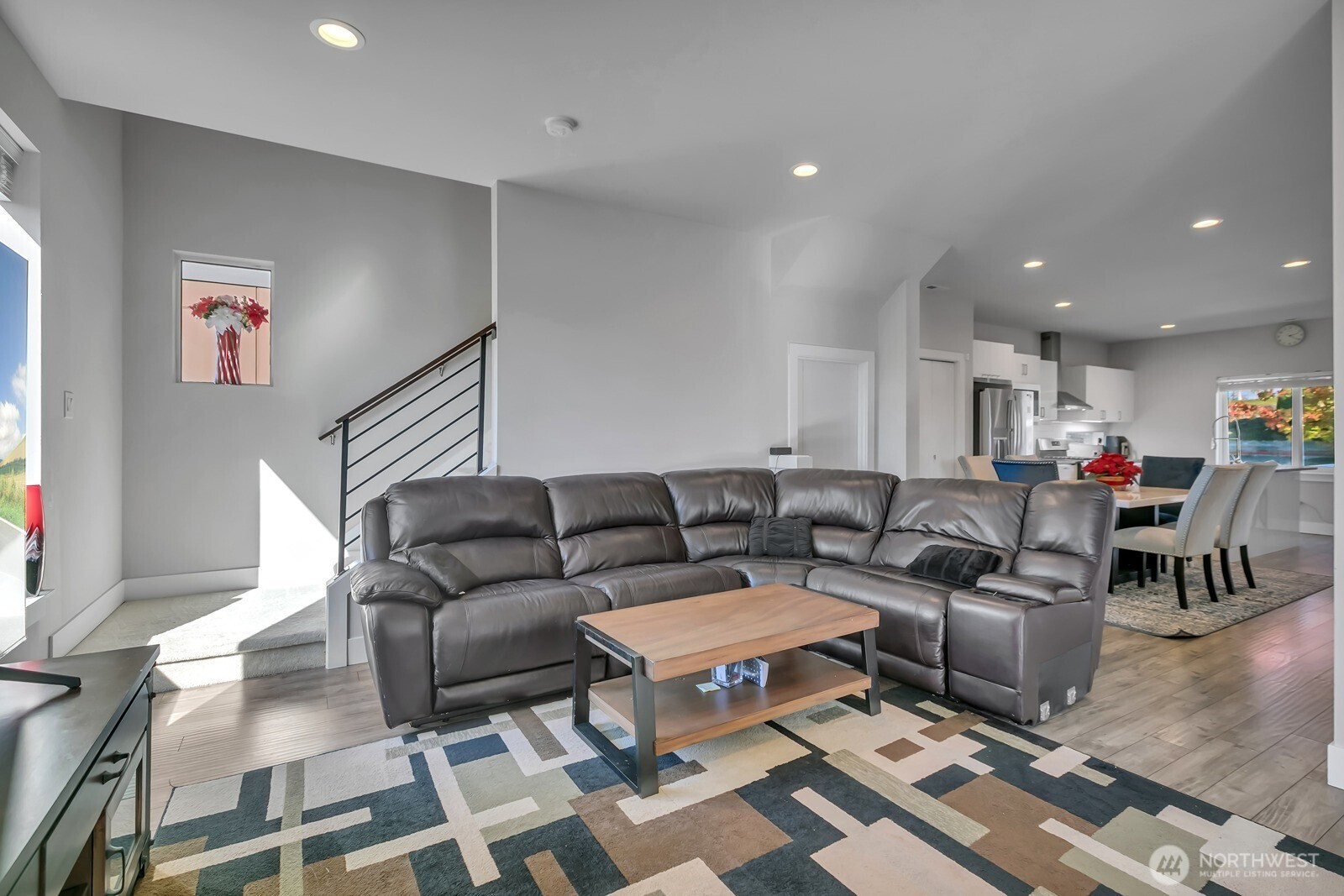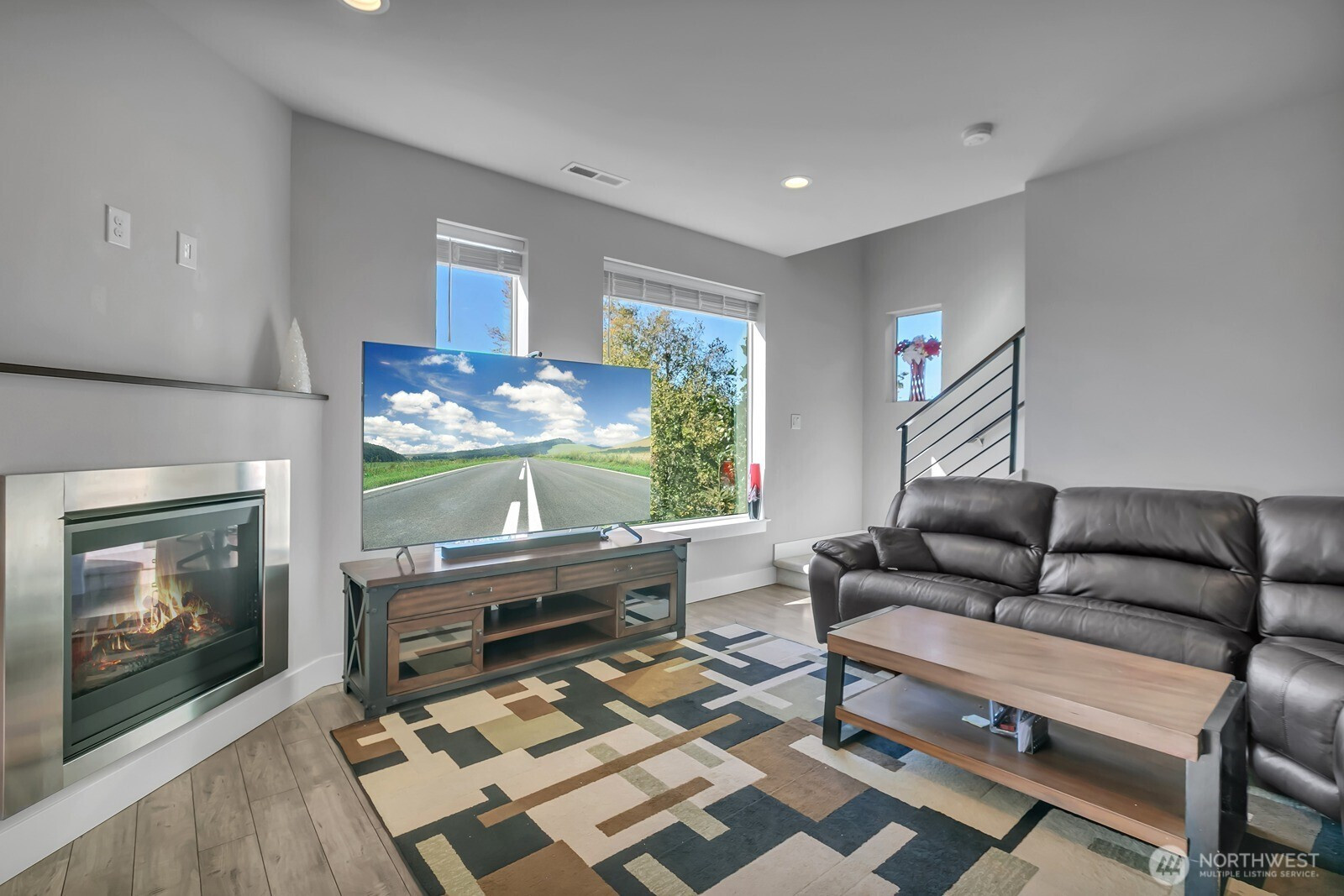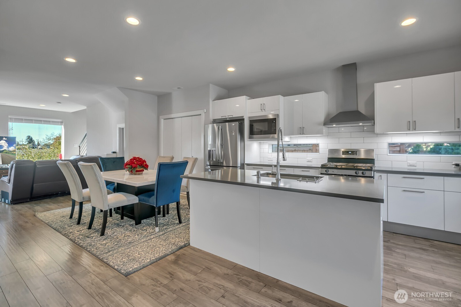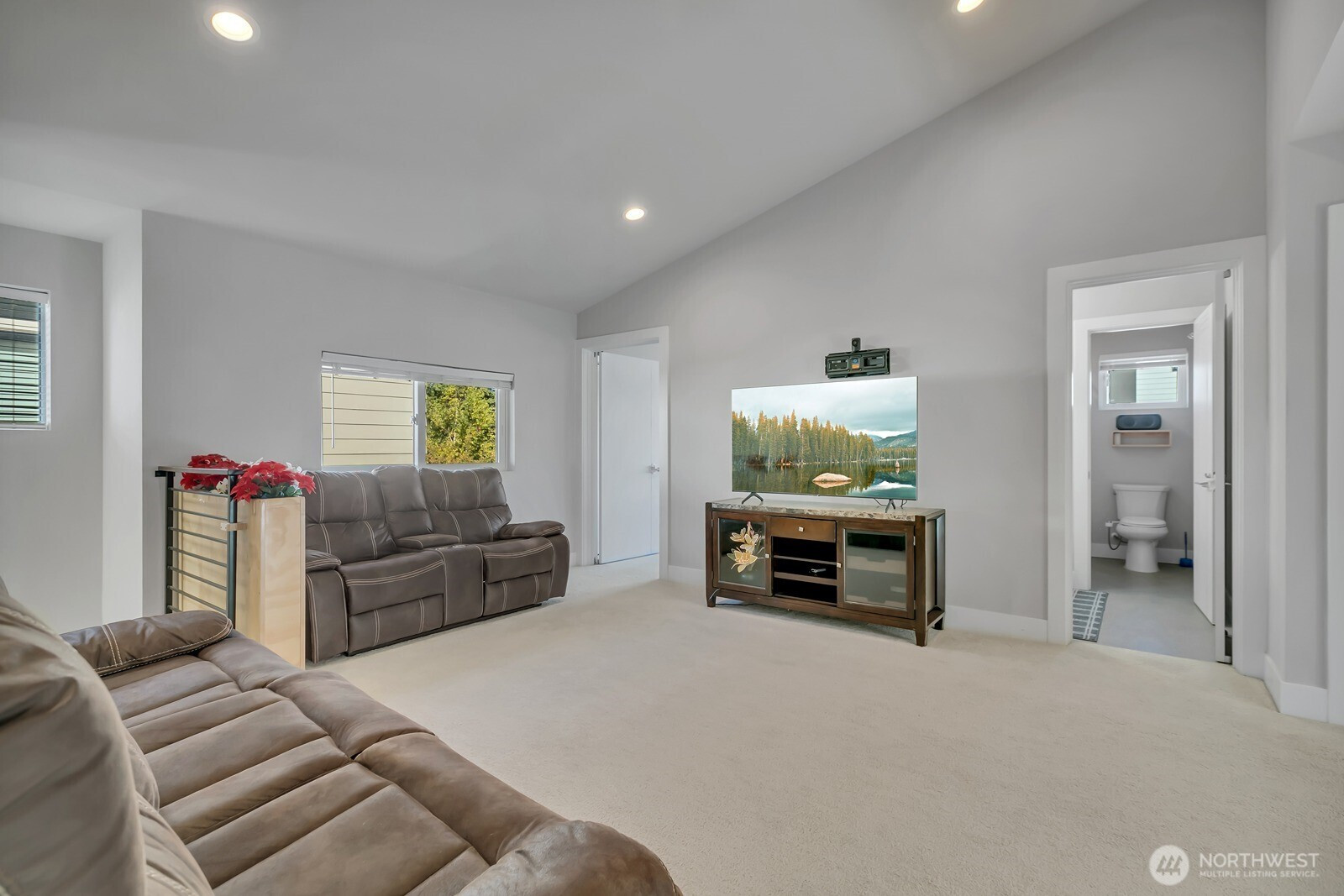 Modern 3-story home built in 2020 with quality Ichijo features throughout—dual sliding windows/closet doors, LED smart lighting, Nest thermostat & more! Bright open-concept main floor with quartz kitchen counters, soft-close cabinets, and all appliances included. Dining area opens to cozy living room with gas fireplace and large covered patio—perfect for entertaining. Upstairs has 4 bedrooms, laundry, and a spacious loft with built-ins. Primary suite features a 5-piece bath and walk-in closet. Bonus room and ¾ bath on lower level offer MIL potential. Backs to greenbelt for added privacy.