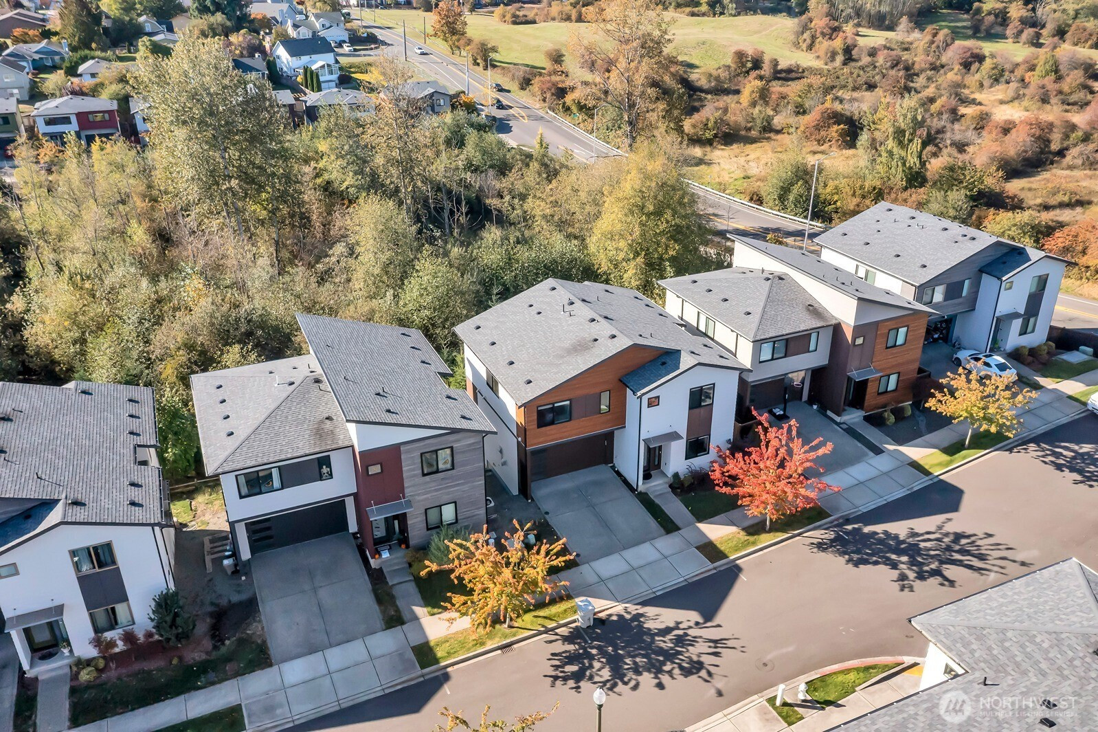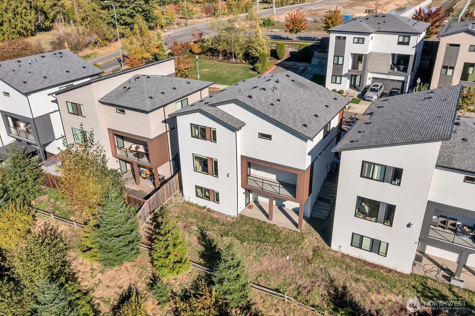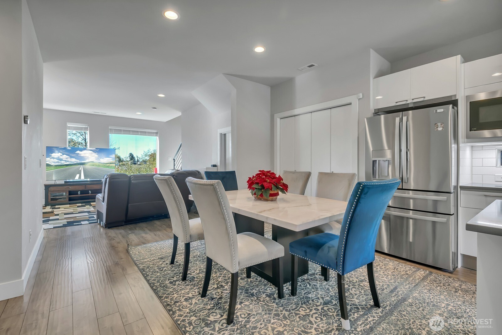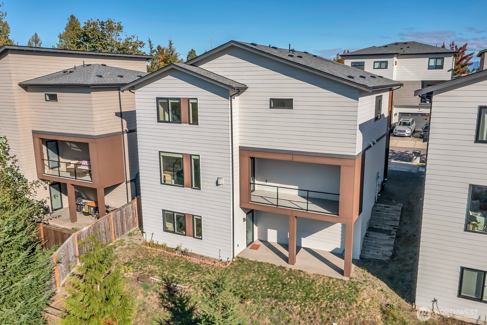 Modern 3-story home built in 2020 with quality Ichijo features throughout—dual sliding windows/closet doors, LED smart lighting, Nest thermostat & more! Bright open-concept main floor with quartz kitchen counters, soft-close cabinets, and all appliances included. Dining area opens to cozy living room with gas fireplace and large covered patio—perfect for entertaining. Upstairs has 4 bedrooms, laundry, and a spacious loft with built-ins. Primary suite features a 5-piece bath and walk-in closet. Bonus room and ¾ bath on lower level offer MIL potential. Backs to greenbelt for added privacy.