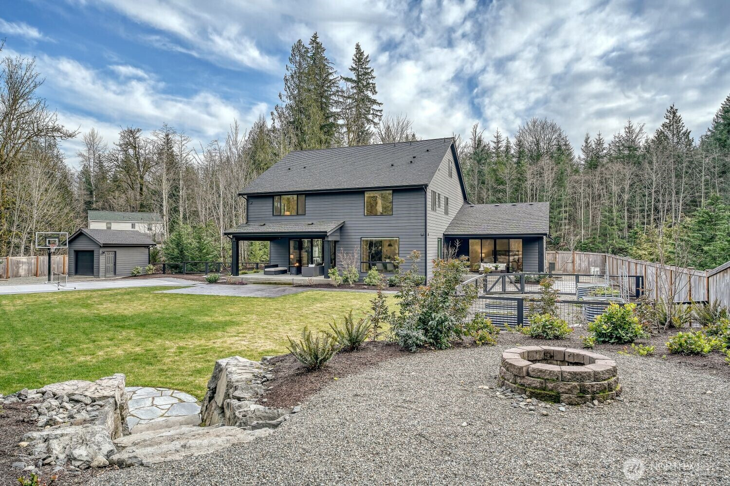 Welcome to this exceptional four-bedroom, four-bath resale by renowned local luxury builder Curtis Lang, located within an exclusive gated neighborhood. Set on two private, beautifully landscaped acres designed for low-maintenance living, this home offers a rare blend of privacy, comfort, and elevated design. The thoughtfully planned layout features two spacious primary suites, ideal for multigenerational living or hosting guests. At the heart of the home, an amazing kitchen flows effortlessly into the living and outdoor entertaining areas, creating the perfect setting for memorable gatherings. Step outside to enjoy resort-style amenities including a basketball court, pickleball court, and bocce ball court. A fully fenced gardening area with irrigation awaits those with a green thumb, while the four-car garage and third-floor bonus room provide ample space and flexibility. Beautiful landscaping with full irrigation and lighting enhances the property, and automatic blinds and lighting throughout the home can be conveniently controlled from your phone. An on-demand Generac generator provides added peace of mind year-round. Despite the serene, private setting, nearby amenities are just minutes away, offering the best of both seclusion and convenience. This is a truly special opportunity to own a luxury retreat that feels like home.