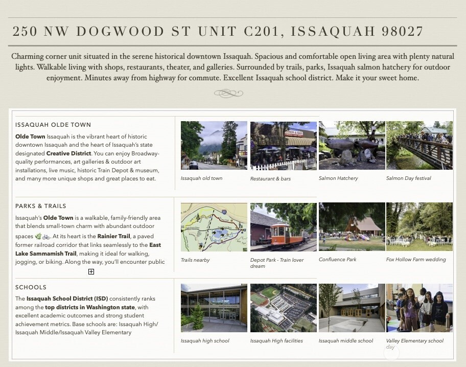 Charming corner unit situated in the serene historical downtown Issaquah. Spacious and comfortable open living area with 3 bedrooms/2 full baths. New water heater/heating system; New stove; New dishwasher; New refrigerator; New dryer; Freshly painted interior. The unit features covered deck; 1 covered parking; plenty natural lights as end unit. HOA covers water/sewer/cable TV/earthquake insurance etc. Walkable living with shops, restaurants, theater, and galleries. Surrounded by trails, parks, Issaquah salmon hatchery for outdoor enjoyment. Seller will payoff all remaining balance of special assessment at the closing. Minutes away from highway for commute. Excellent Issaquah school district. Make it your sweet home.