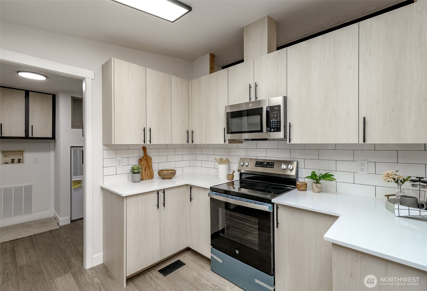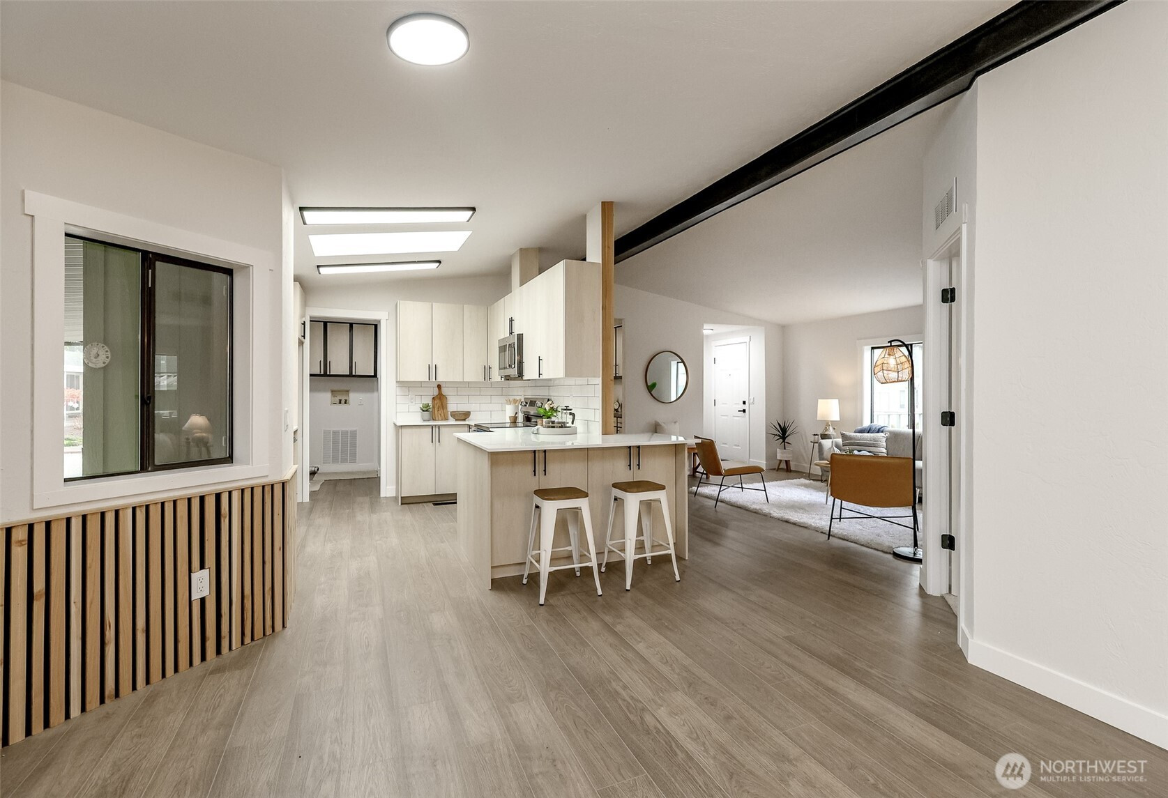 (503) 893-8874Welcome home to this updated modern residence in the highly desired Kloshe Illahee Community. This well-designed home features European-style flat-front custom cabinetry with soft-close drawers, stone countertops, and a large kitchen peninsula with extra seating, ideal for daily living and entertaining. The home offers three bedrooms and updated bathrooms, including a tiled walk-in shower in the primary suite. Two separate living spaces provide flexibility for shared or multi-generational living. Situated on a generous corner lot with rose bushes along the front porch, plus covered parking, a porch sitting area, and an additional storage shed. A rare opportunity to own a stylish, functional home in a peaceful and sought-after community.