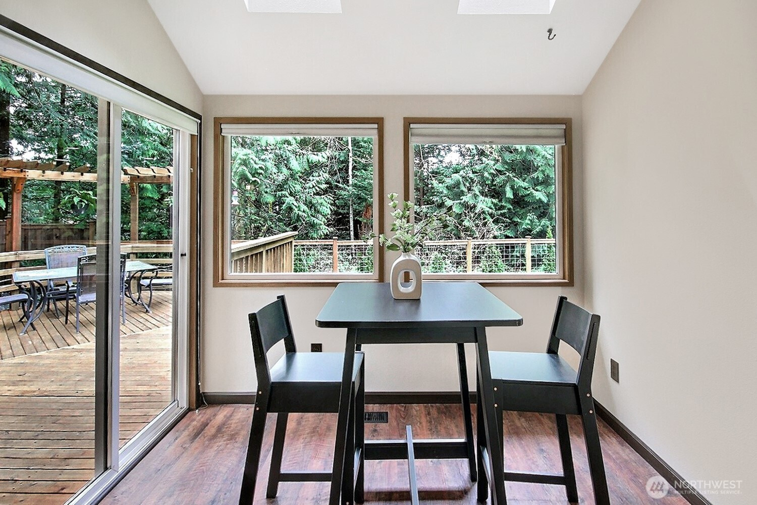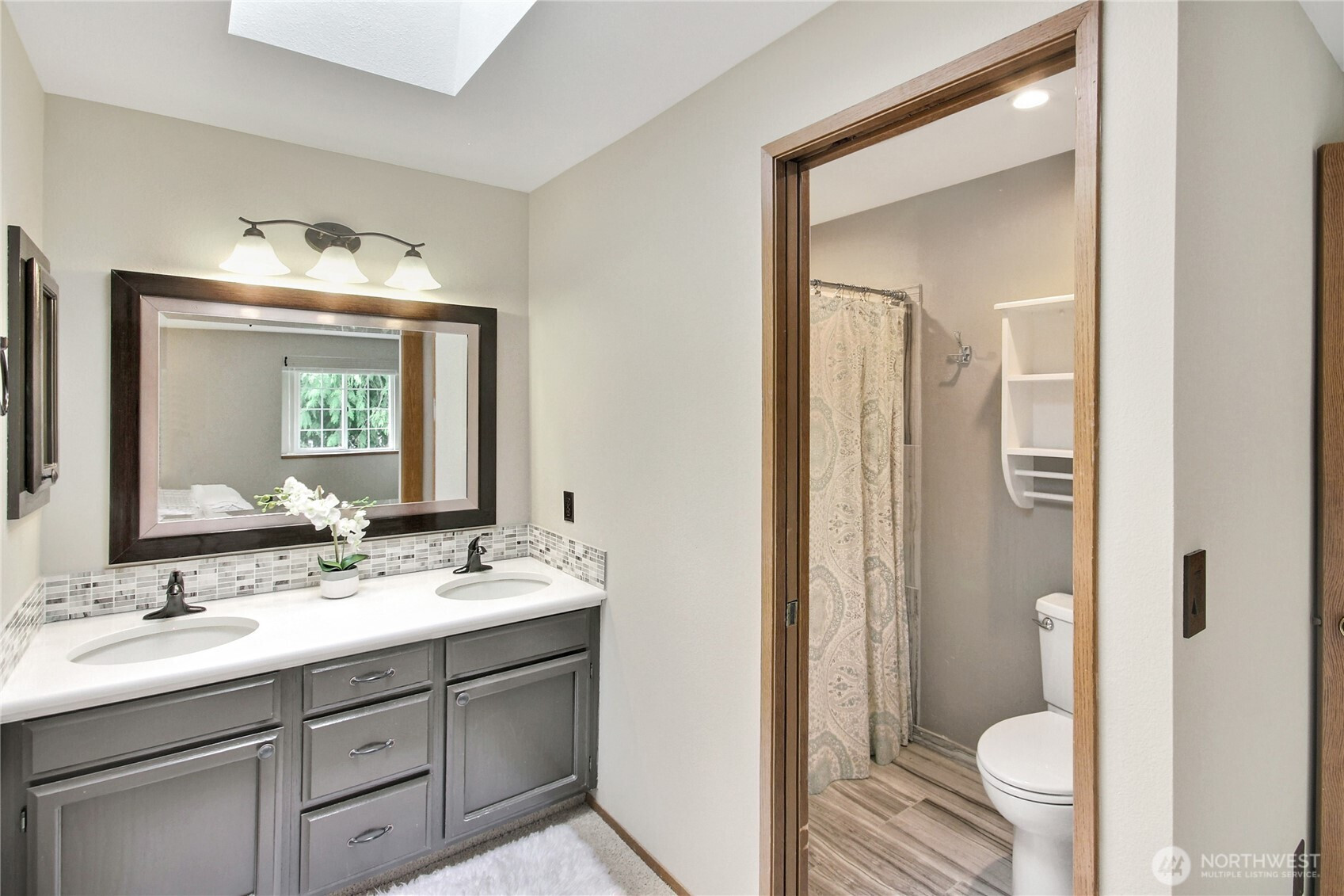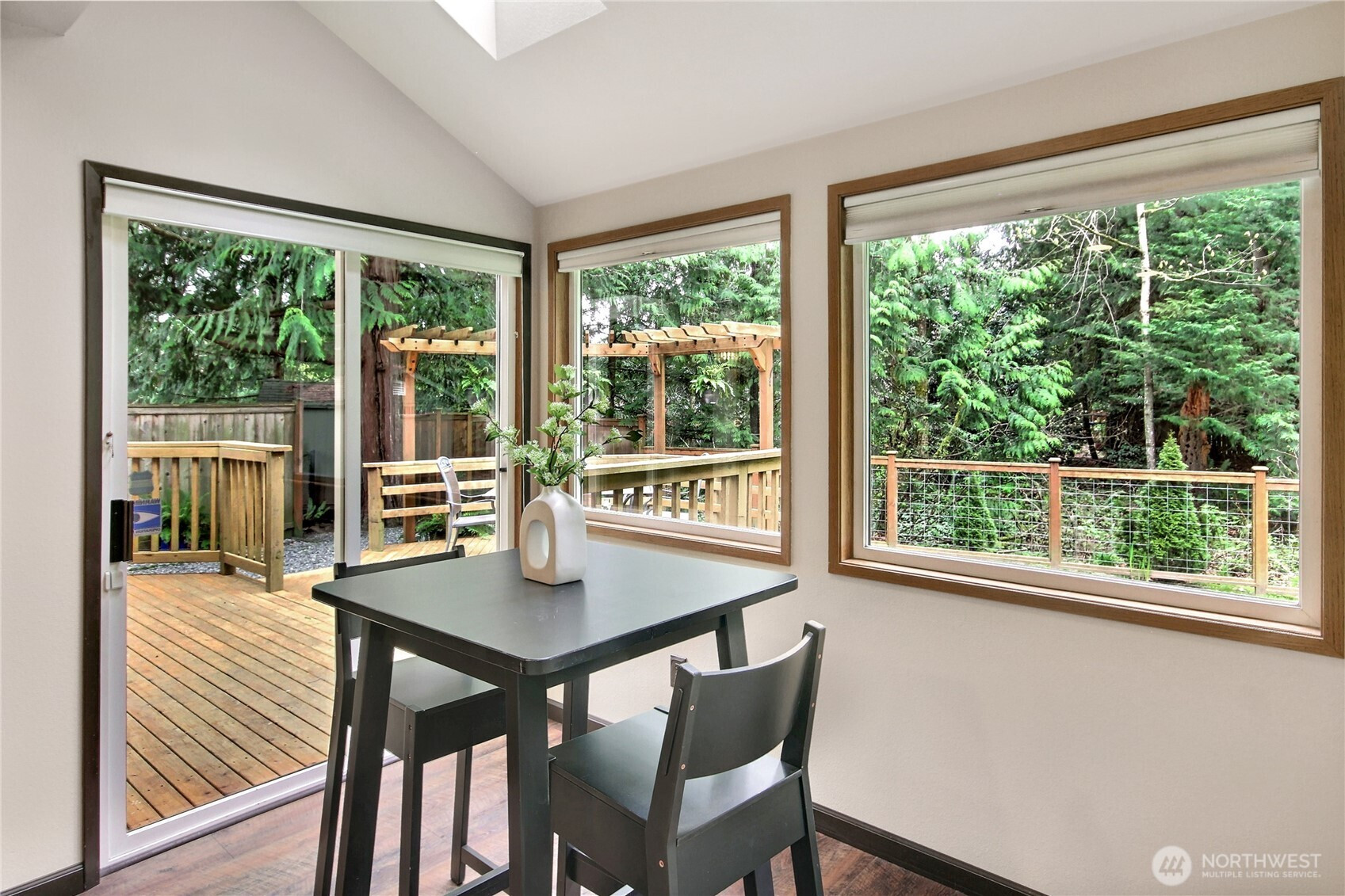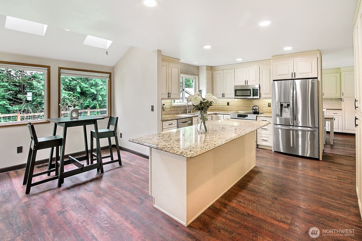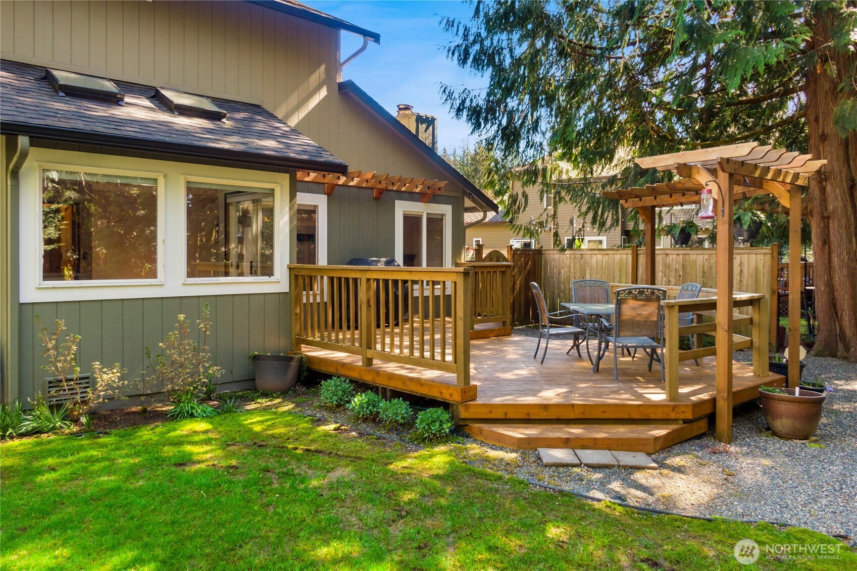The pictures say it all! Set on a quiet cul de sac, this home has unsurpassed street appeal! Meticulously maintained and improved by the original owners, it will make a lasting impression from your first steps through the door. Vaulted ceilings over the living room & LVP flooring throughout the main floor. Follow the entry into a gorgously updated, island kitchen with state of the art appliances & custom cabinetry including a built buffet in the formal dining room. The island kitchen opens to a huge family room with an abundance of windows, gas log fireplace, skylights and a cozy eating nook and slider leading to the expansive deck. The pristinely private & fenced backyard includes a garden shed and a winter creek gurgles along the adjoining greenbelt beyond. Upstairs you'll find brand new carpeting & 3 bedrooms including a spacious primary suite with 2 sink vanity, shower & walk-in closet. Beautiful, mature landscaping front & back. Utility room with sink & storage cabinetry. New roof, gutter skylights and interior paint in 2020. The excellent commute locale puts you North and West of Covington traffic, yet walking distance to schools and minutes from Costco. Truly one not to be missed!