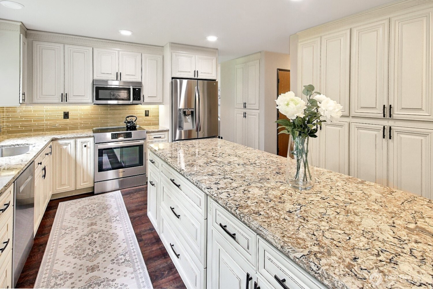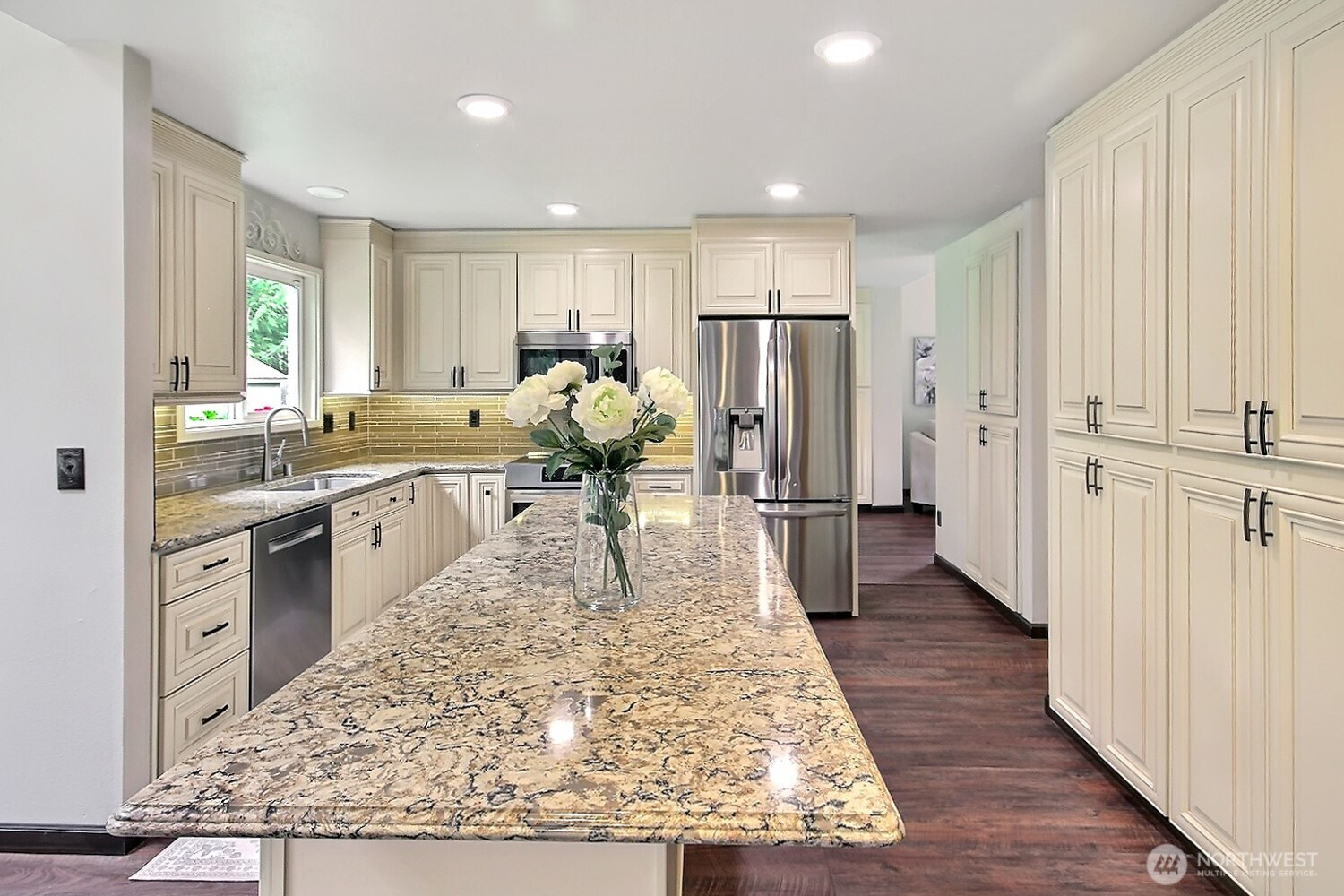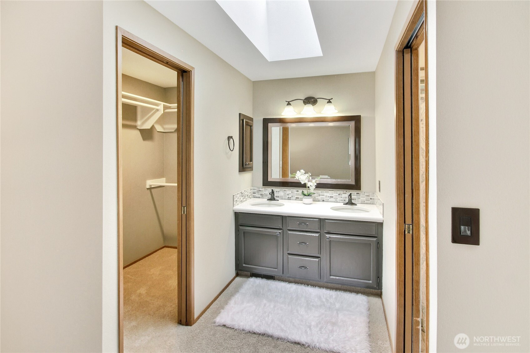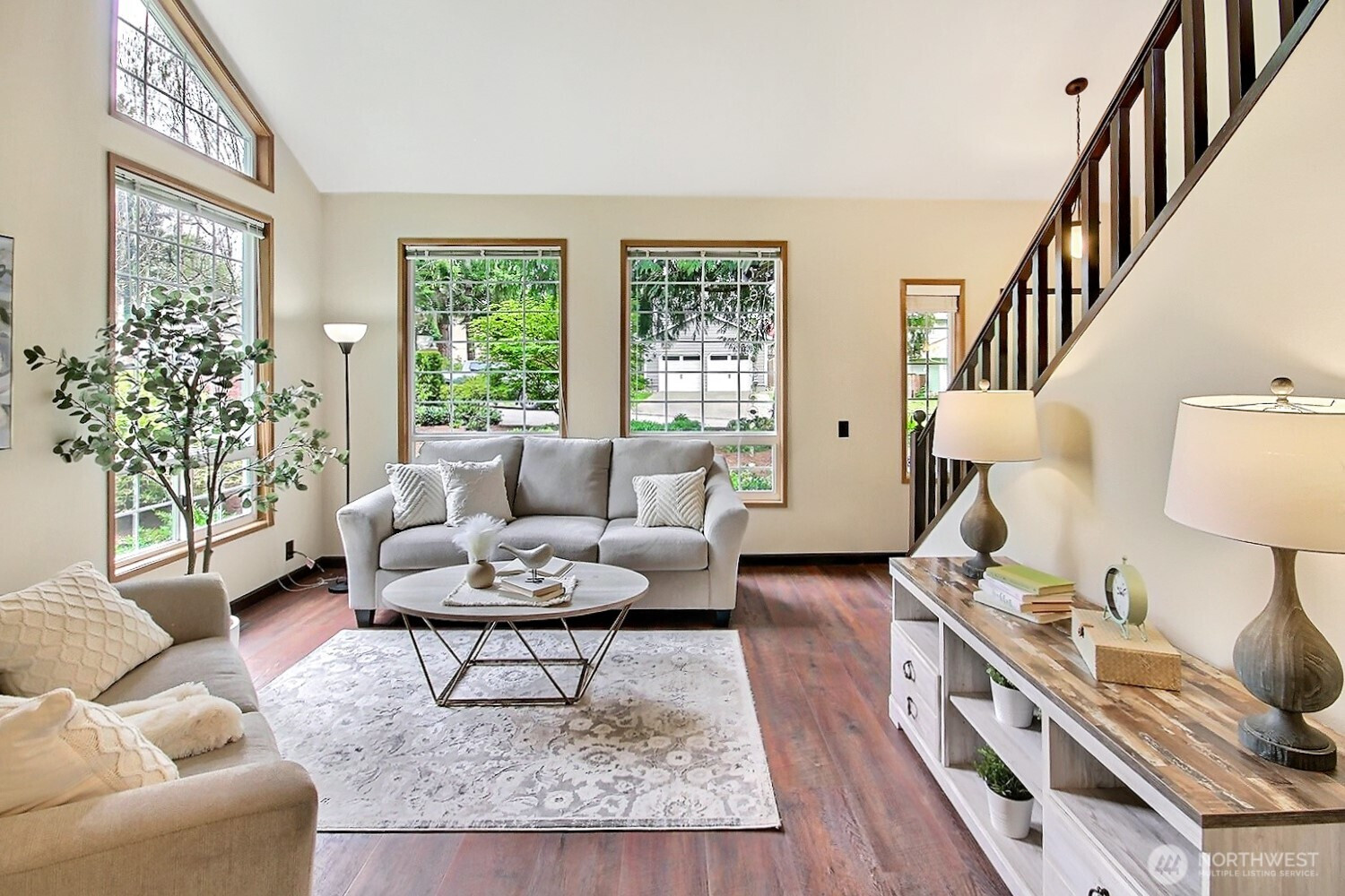 The pictures say it all! Set on a quiet cul de sac, this home has unsurpassed street appeal! Meticulously maintained and improved by the original owners, it will make a lasting impression from your first steps through the door. Vaulted ceilings over the living room & LVP flooring throughout the main floor. Follow the entry into a gorgously updated, island kitchen with state of the art appliances & custom cabinetry including a built buffet in the formal dining room. The island kitchen opens to a huge family room with an abundance of windows, gas log fireplace, skylights and a cozy eating nook and slider leading to the expansive deck. The pristinely private & fenced backyard includes a garden shed and a winter creek gurgles along the adjoining greenbelt beyond. Upstairs you'll find brand new carpeting & 3 bedrooms including a spacious primary suite with 2 sink vanity, shower & walk-in closet. Beautiful, mature landscaping front & back. Utility room with sink & storage cabinetry. New roof, gutter skylights and interior paint in 2020. The excellent commute locale puts you North and West of Covington traffic, yet walking distance to schools and minutes from Costco. Truly one not to be missed!