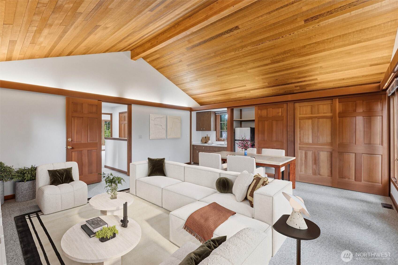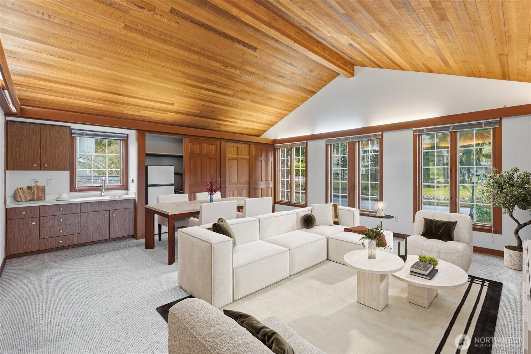 (503) 893-8874Perched on a half-acre in Bridle Trails' Cherry Crest neighborhood, this southwest-facing mid-century/ranch-style home has been lovingly stewarded by one family for 60 years. Built in 1956 with major renovations in '76, '91, & 2026, the property offers a private, park-like setting with towering firs, mature hedges, a sprawling lawn, and partial views of downtown Bellevue from both the yard and home. Double-paned wood windows flood each room with natural light. Natural-stained solid-core doors, hardwood floors, and 100% wool carpet in the bedrooms warm the home. The rec room impresses with a 15-ft exposed wood ceiling, kitchenette, storage, and thick double-paned windows designed to buffer exterior noise. A two-sided fireplace anchors the living and family rooms. The hub-and-spoke floor plan encourages gathering while preserving privacy. The family room functions like a sunroom, opening to the back patio through a wall of sunset-facing windows and French doors. The main level, including the attached garage, laundry, and patios, is all on one grade. An art studio at the rear offers potential for an ADU among the trees with city views. In 2026, updates include interior and exterior paint, cedar fencing, hardwood floors, wool carpet, kitchen, bathrooms, and a new roof. Cherry Crest Elementary, Parkside Stables, Bridle Trails State Park, Central Park Tennis Club, the Spring District, Sound Transit, DT Bellevue, and Lake Washington beaches are all within a 3–10 min drive.