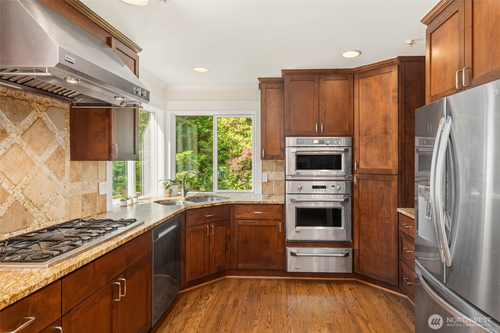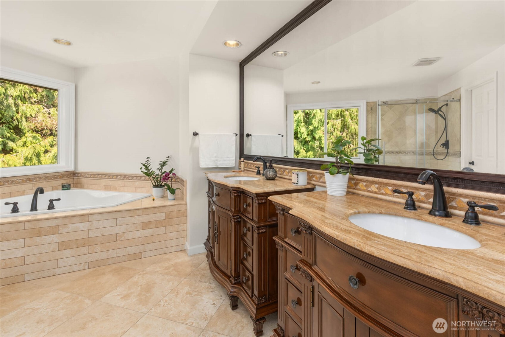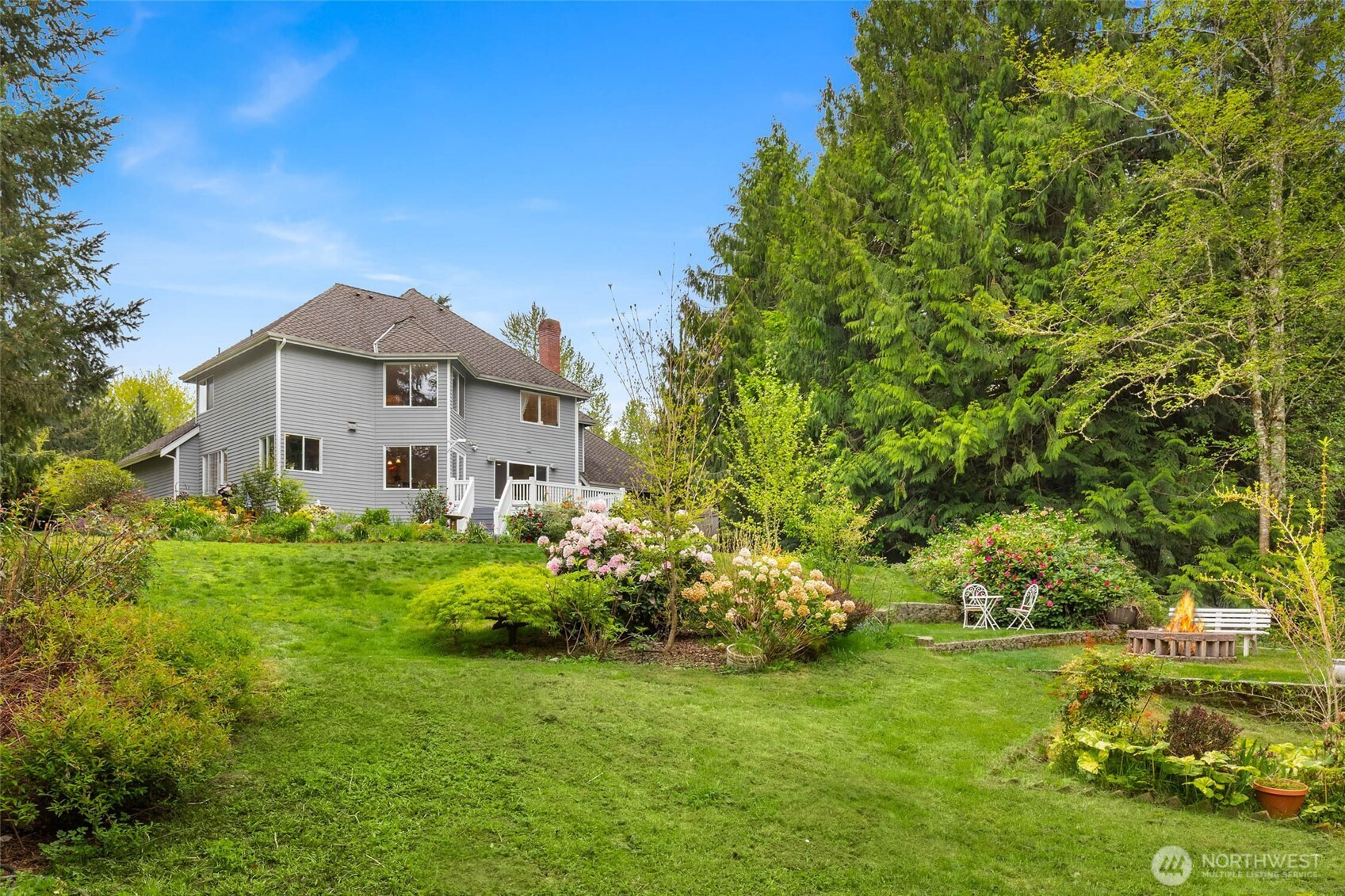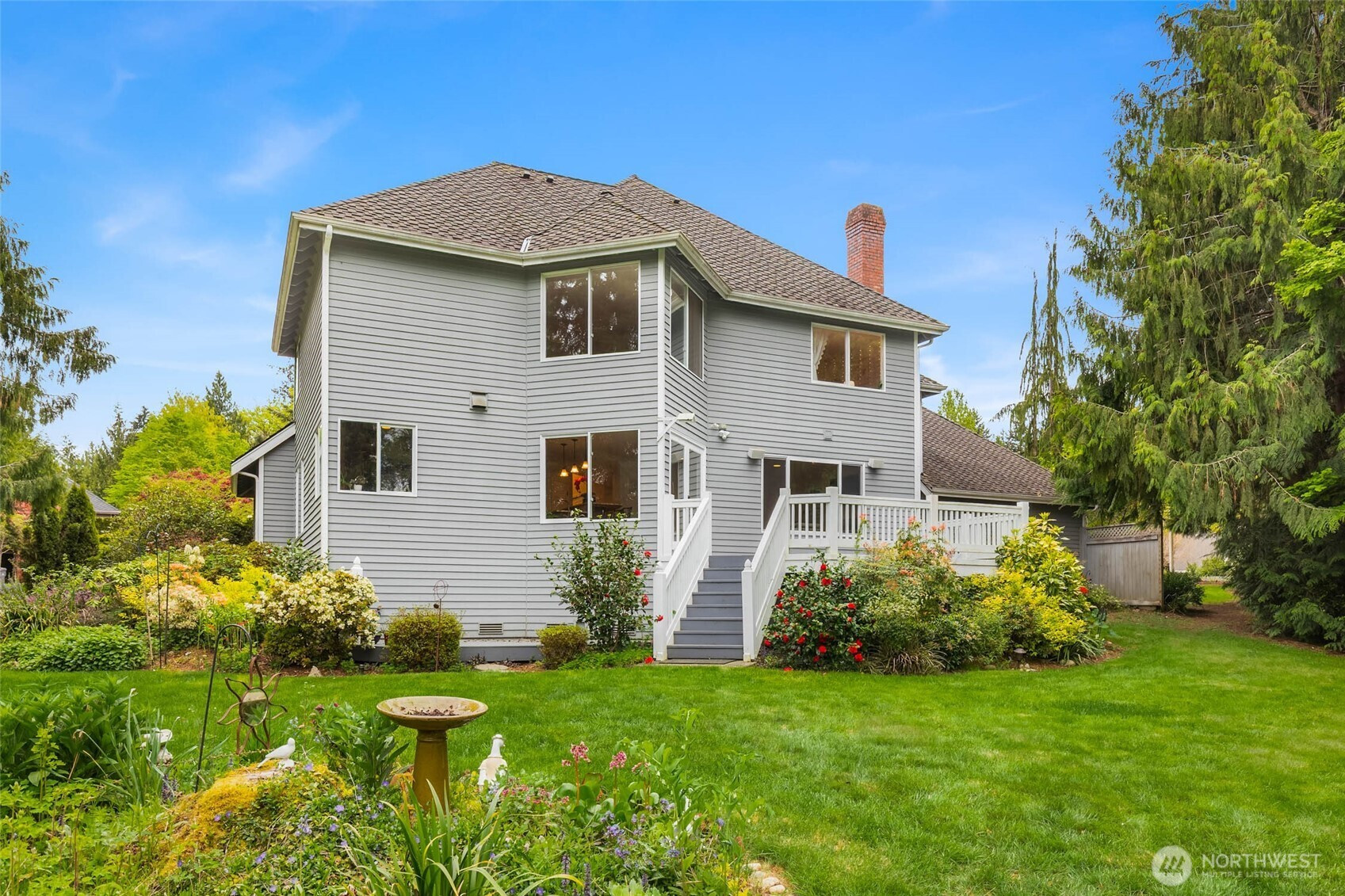 Welcome to Amesbury - one of Redmond’s most coveted neighborhoods, just minutes from downtown Redmond! This stunning William Buchan-built home sits on an estate-sized lot w/lush greenery & garden space, offering privacy & tranquility. Crafted to the highest standards, it features a 3-car garage, hardwood floors, new carpet + paint, gas fireplace, A/C, built-in speaker + sprinkler systems & ample storage. Enjoy an upgraded kitchen with new appliances & updated bathrooms. A 50-year roof and new asphalted driveway installed just a few years ago. The east-facing layout floods the home with natural light, and the back deck is perfect for relaxing in the afternoon sun. The spacious primary suite includes a dual vanity, soaking tub & oversized walk-in closet. Ready to welcome you!
