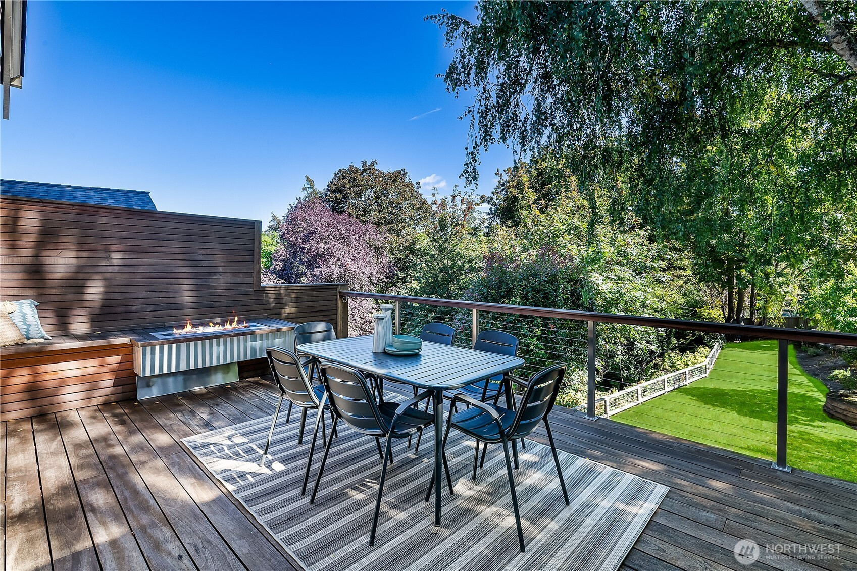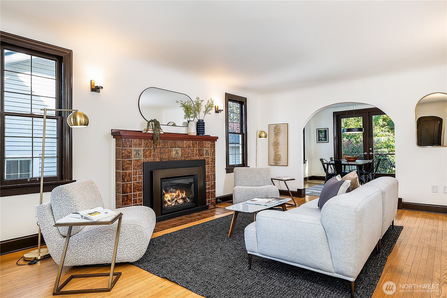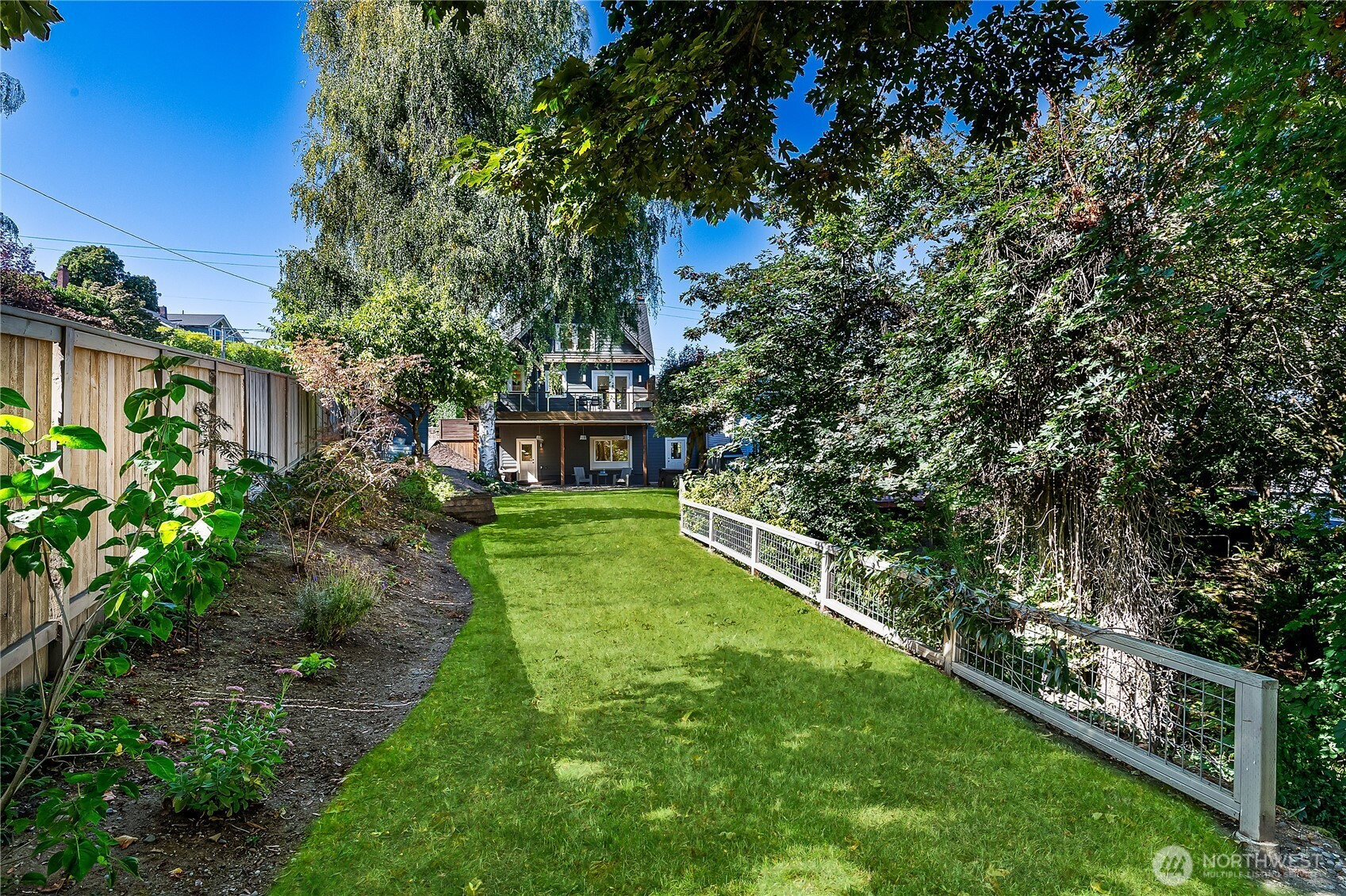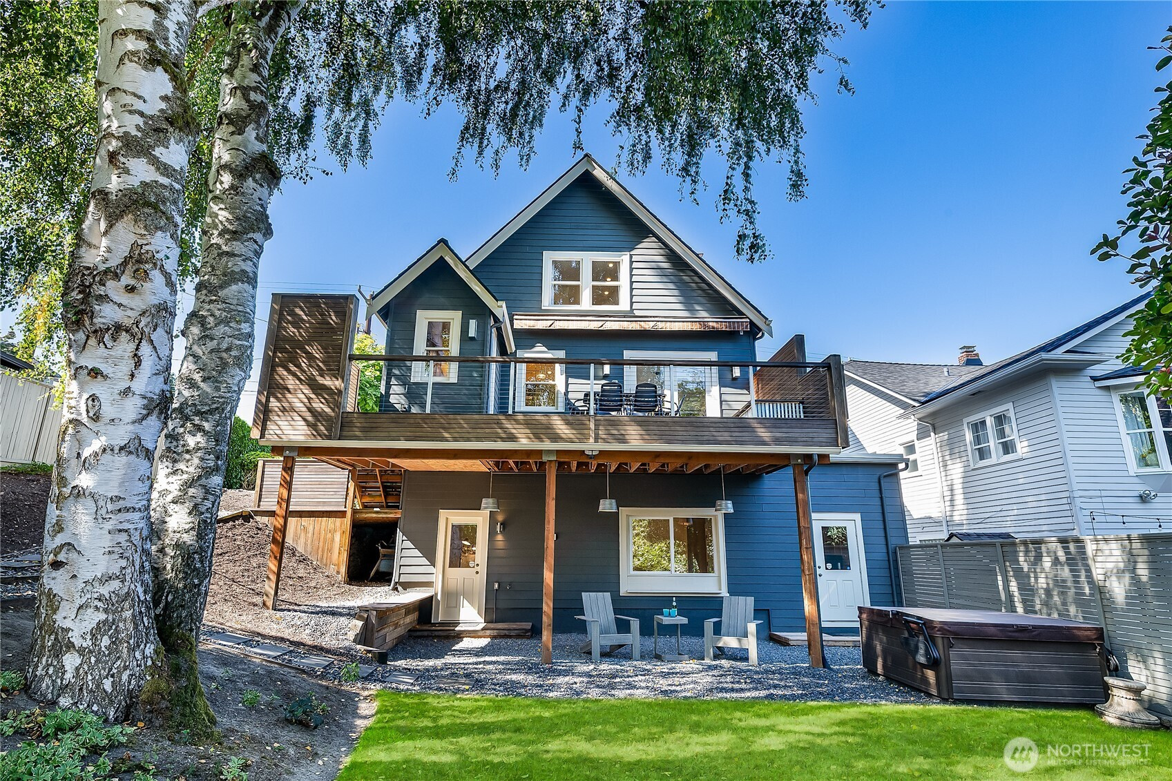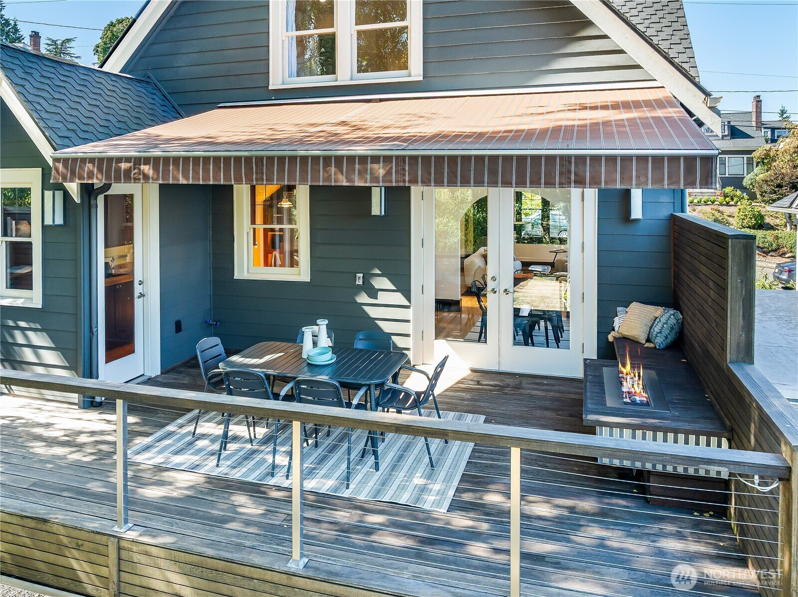 Beautifully restored QA home w/ timeless character showcases hardwood floors, coved ceilings, original leaded glass windows streaming western sunlight & cozy fireplace w/original tile. Entertainment-sized dining room w/French doors lead to a spacious deck, retractable awning & outdoor fireplace, overlooking an expansive, beautifully landscaped backyard sanctuary w/raised garden beds, plum tree & greenbelt. Gourmet kitchen w/high-end stainless appliances & sleek countertops. Main floor includes den/office & remodeled bath. 3 bedrooms/1 bath upstairs w/territorial views. Lower level w/high ceilings is media-ready, perfect for snuggling on an over-sized couch. 1 car off St parking. Close to local shops, parks, cafes, schools & transit.