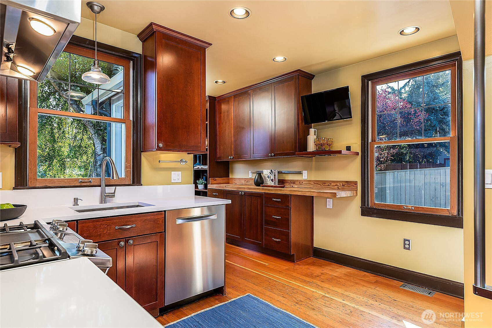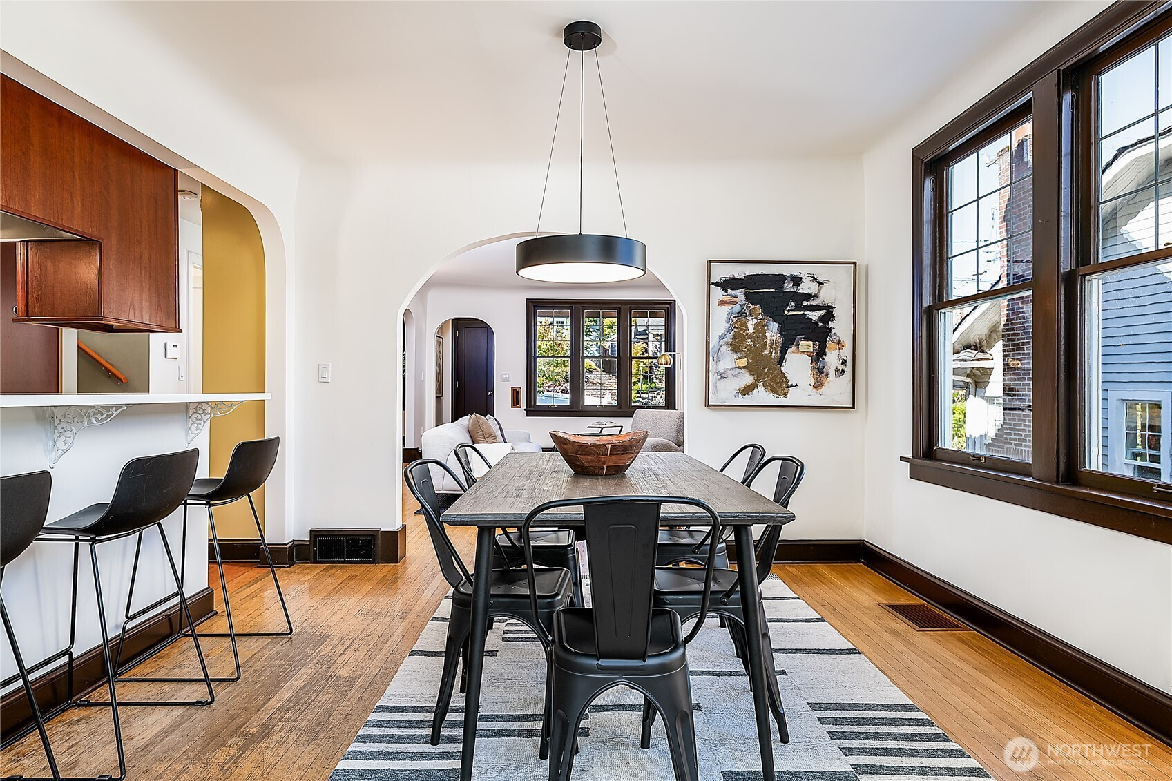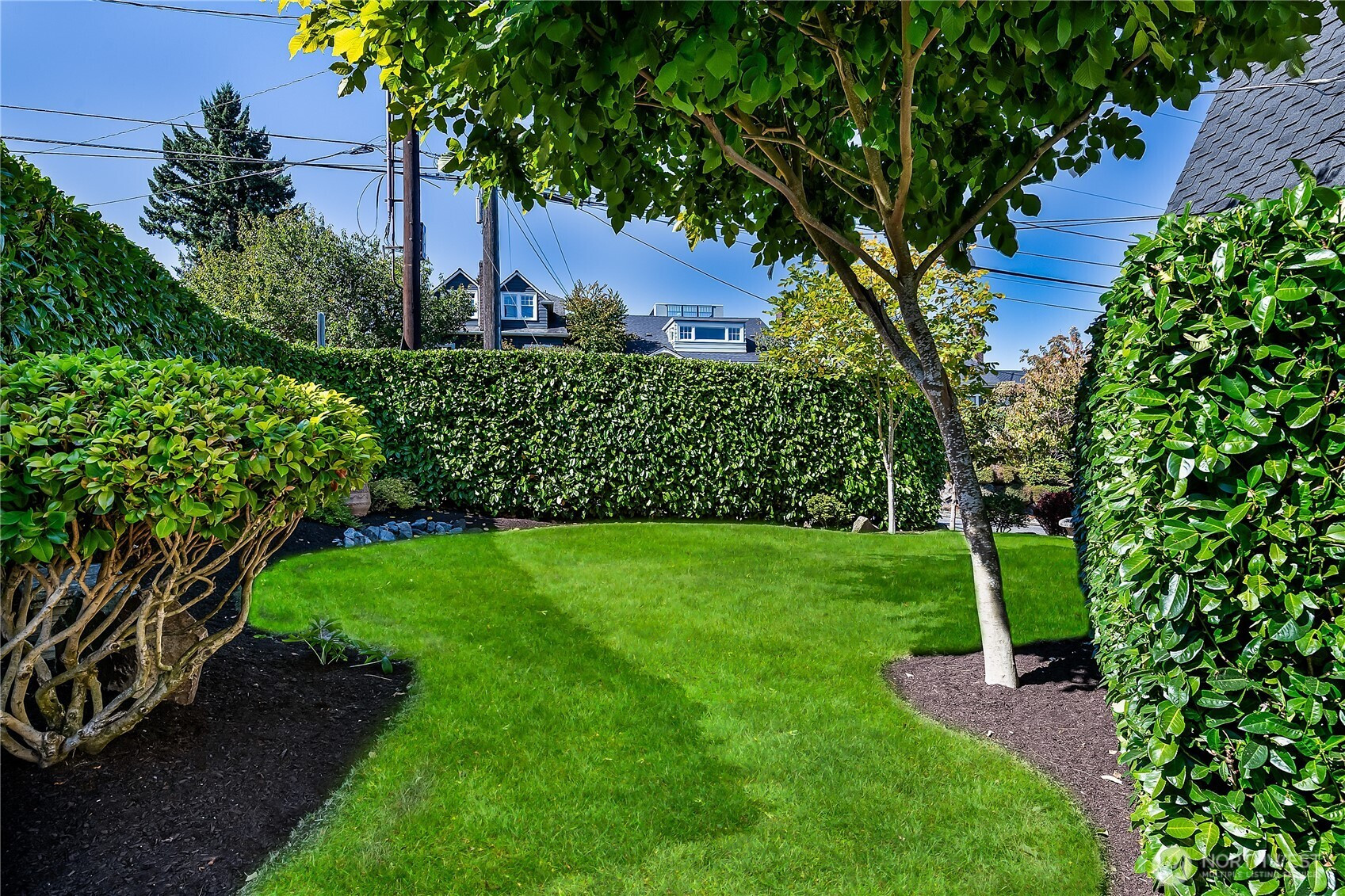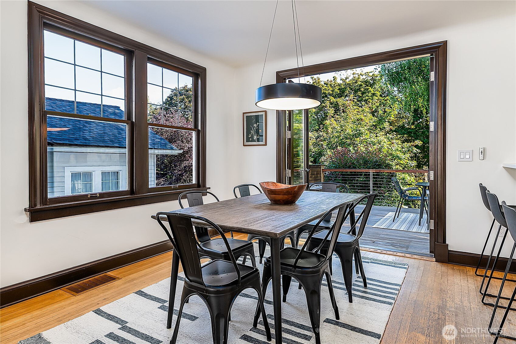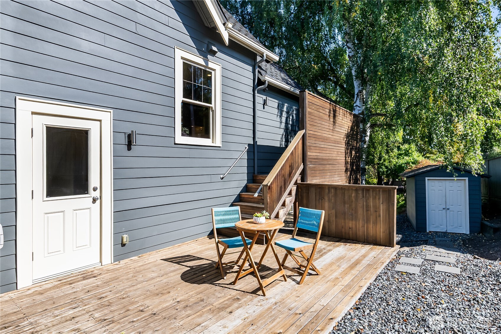 Beautifully restored QA home w/ timeless character showcases hardwood floors, coved ceilings, original leaded glass windows streaming western sunlight & cozy fireplace w/original tile. Entertainment-sized dining room w/French doors lead to a spacious deck, retractable awning & outdoor fireplace, overlooking an expansive, beautifully landscaped backyard sanctuary w/raised garden beds, plum tree & greenbelt. Gourmet kitchen w/high-end stainless appliances & sleek countertops. Main floor includes den/office & remodeled bath. 3 bedrooms/1 bath upstairs w/territorial views. Lower level w/high ceilings is media-ready, perfect for snuggling on an over-sized couch. 1 car off St parking. Close to local shops, parks, cafes, schools & transit.