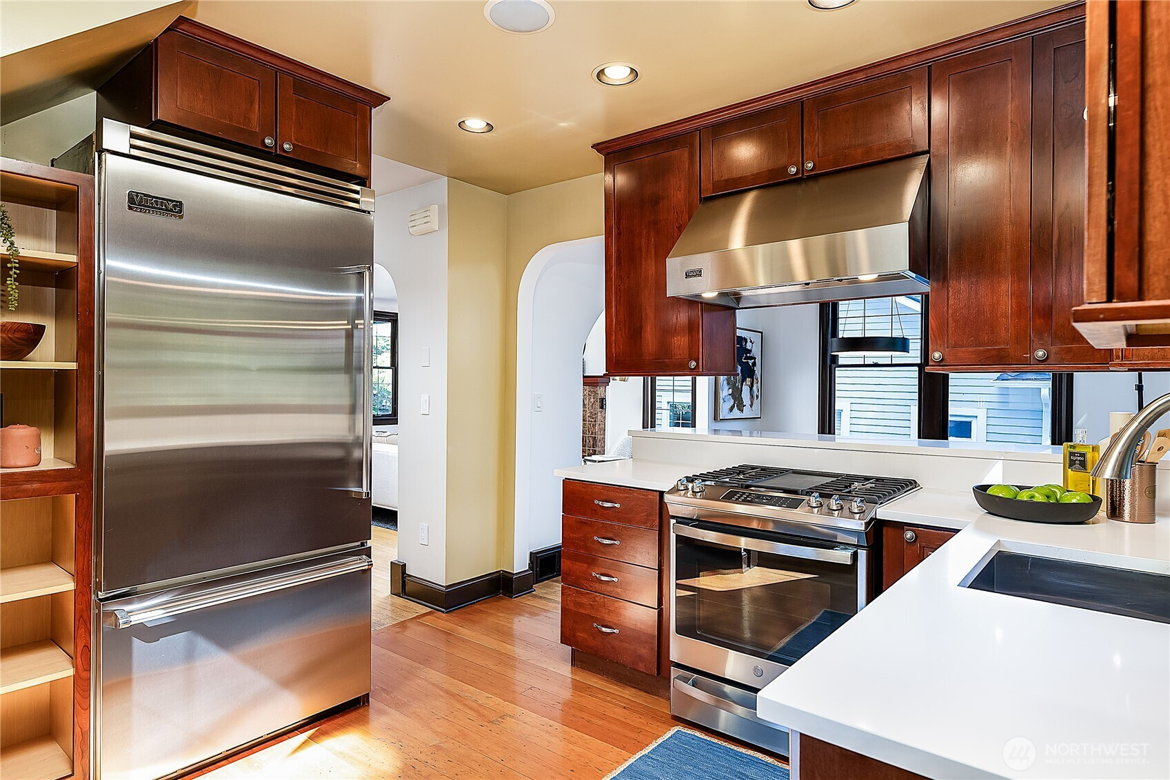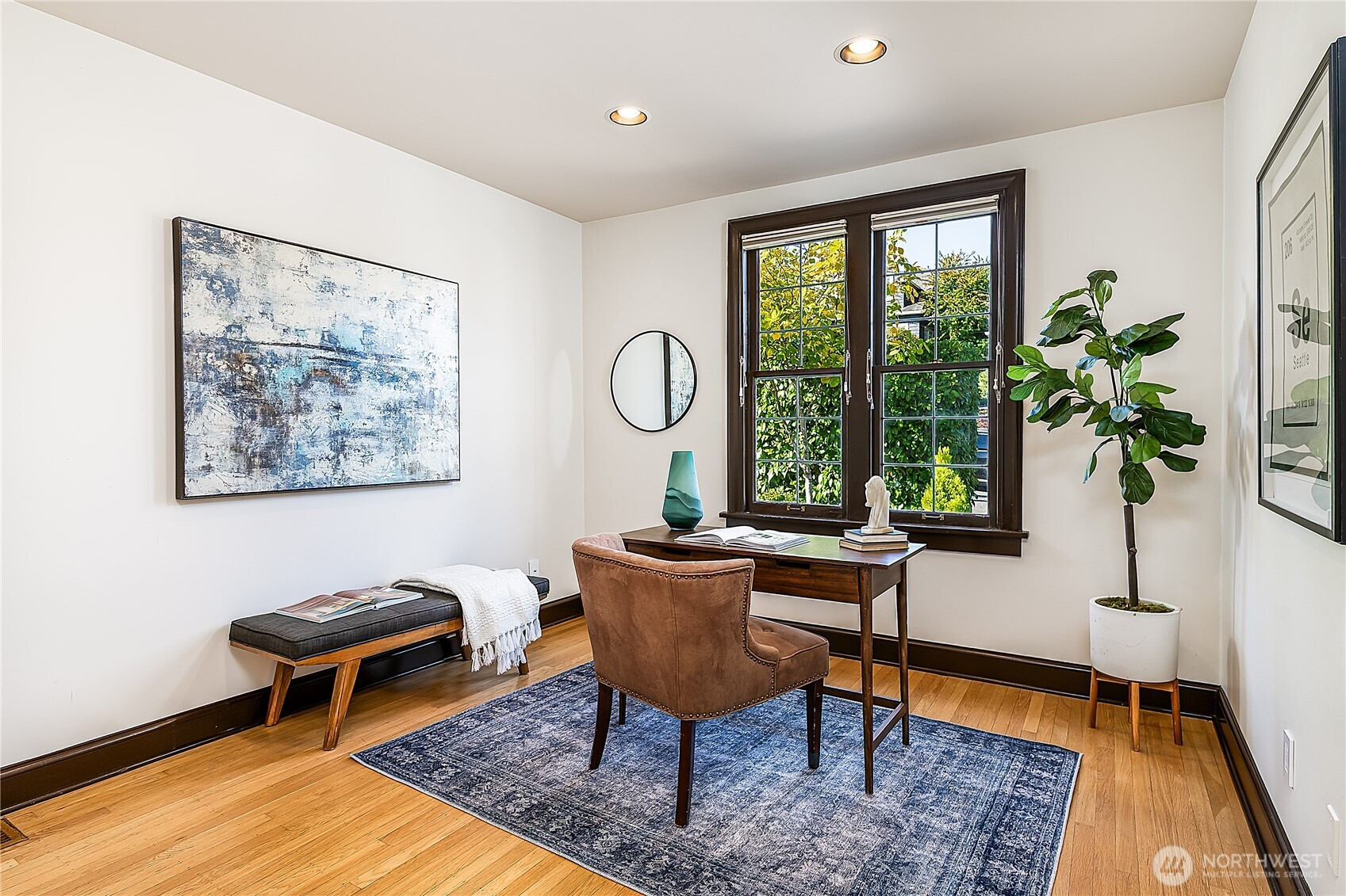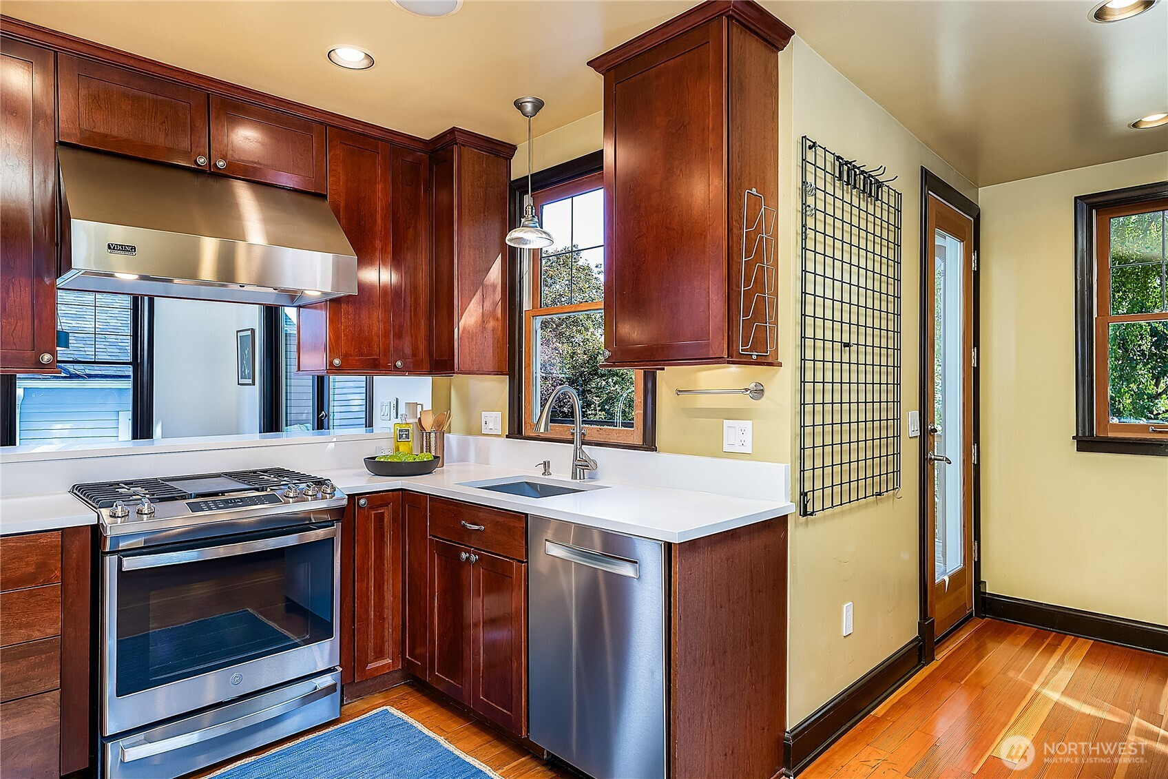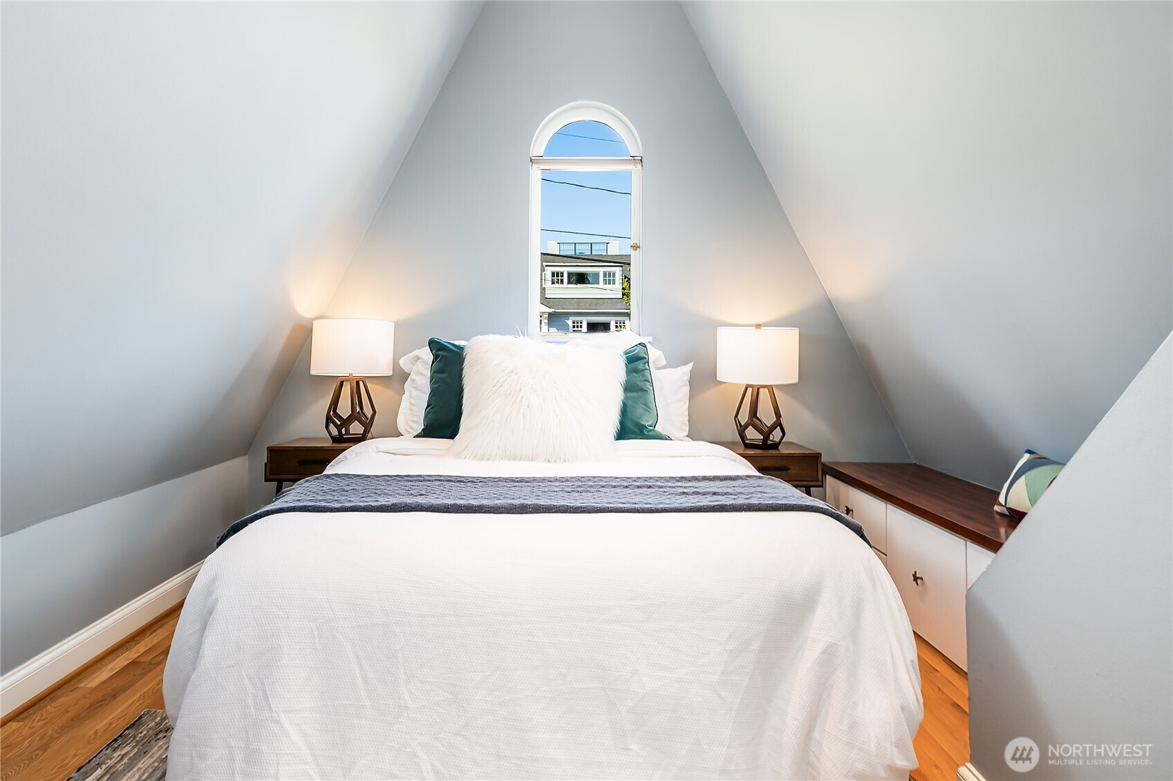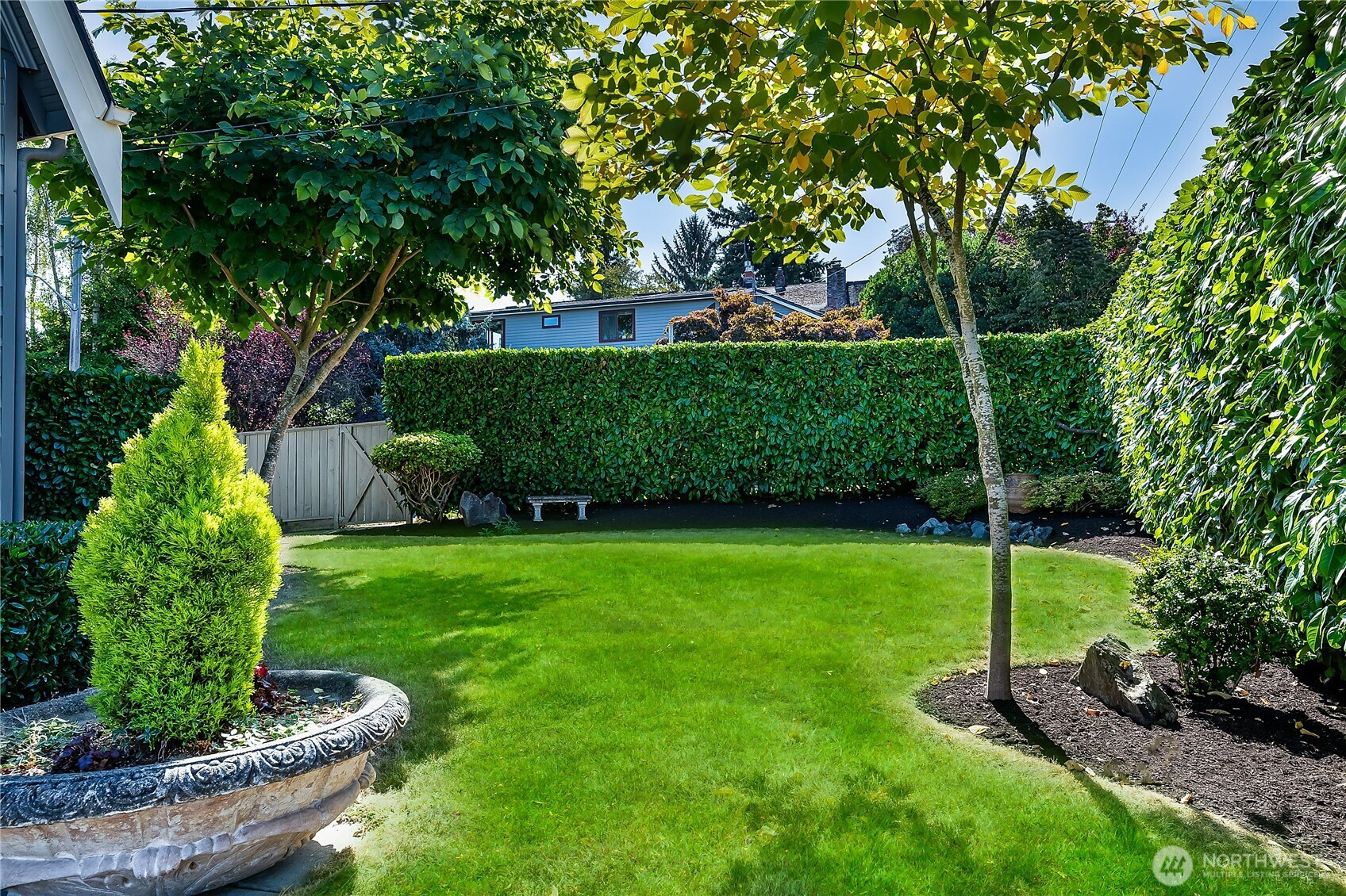 Beautifully restored QA home w/ timeless character showcases hardwood floors, coved ceilings, original leaded glass windows streaming western sunlight & cozy fireplace w/original tile. Entertainment-sized dining room w/French doors lead to a spacious deck, retractable awning & outdoor fireplace, overlooking an expansive, beautifully landscaped backyard sanctuary w/raised garden beds, plum tree & greenbelt. Gourmet kitchen w/high-end stainless appliances & sleek countertops. Main floor includes den/office & remodeled bath. 3 bedrooms/1 bath upstairs w/territorial views. Lower level w/high ceilings is media-ready, perfect for snuggling on an over-sized couch. 1 car off St parking. Close to local shops, parks, cafes, schools & transit.
