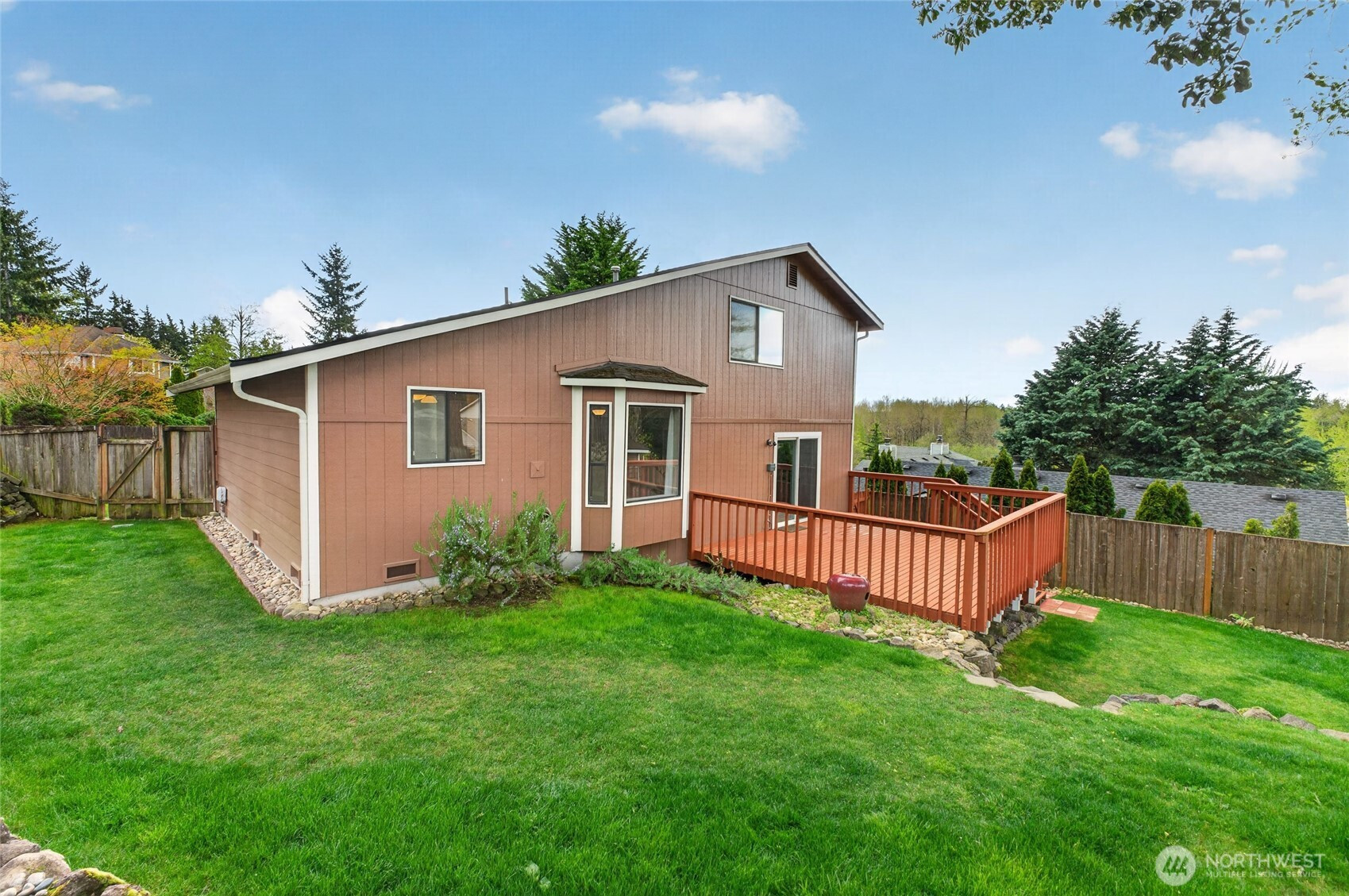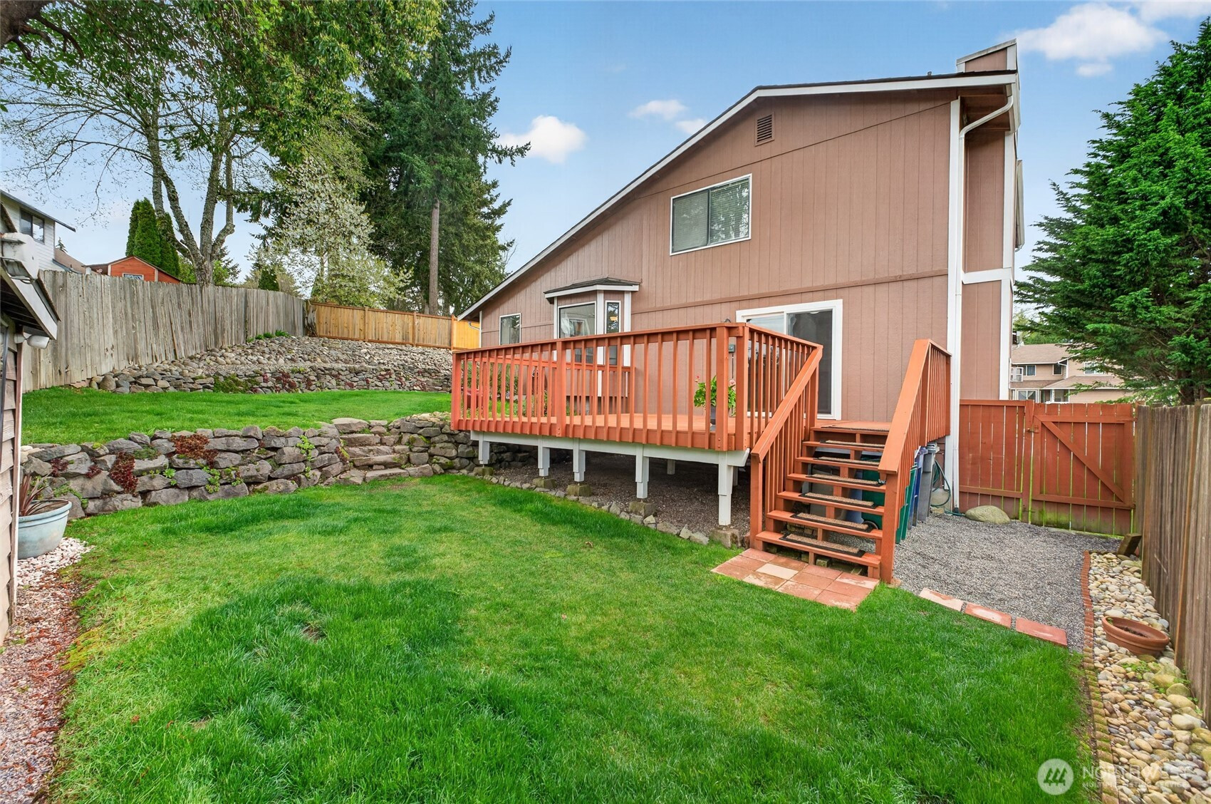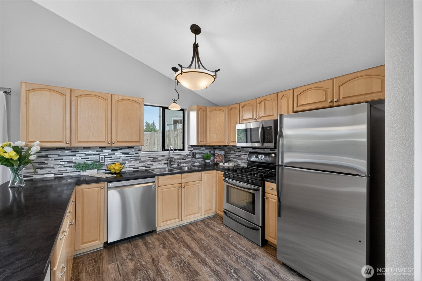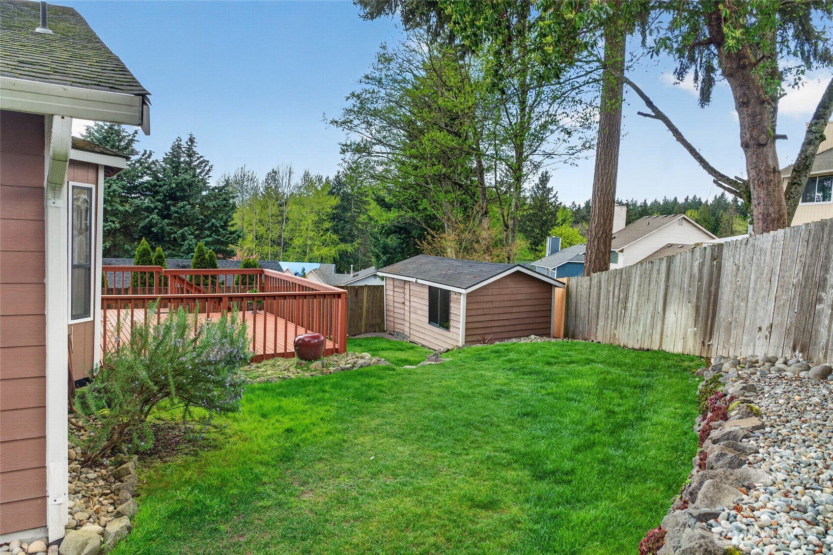 Welcome to this beautifully maintained 3 Bedroom, 2.5 Bath tri-level home offering 1,450 sq ft of thoughtfully designed living space. Featuring luxury flooring in the main living areas, hallway, and primary bath, along with brand new carpet throughout, this move-in ready home perfectly blends comfort, style, and modern updates. The bright, updated kitchen is a true standout, showcasing granite countertops, a gas stove, ample cabinetry, and sleek stainless-steel appliances- ideal for both everyday living and entertaining. The refreshed bathrooms feature elegant quartz countertops with tile flooring in the upstairs main bath and durable vinyl in the downstairs bath/ laundry room. Relax by the cozy gas fireplace or host gatherings in the inviting open-concept living and dining areas filled with abundant natural light. The home is also hardwired for a generator, offering added convenience and peace of mind year-round. A generously sized garage provides ample storage and workspace options. Step outside to a fully fenced backyard with a spacious deck- perfect for entertaining, outdoor dining, or simply unwinding- along with a sprinkler system to keep the yard lush and a garden shed for additional storage. Ideally situated on a quiet cul-de-sac in a desirable neighborhood between Seattle and Tacoma, this home offers easy access to major commuting routes, shopping, dining, parks, and everyday conveniences.