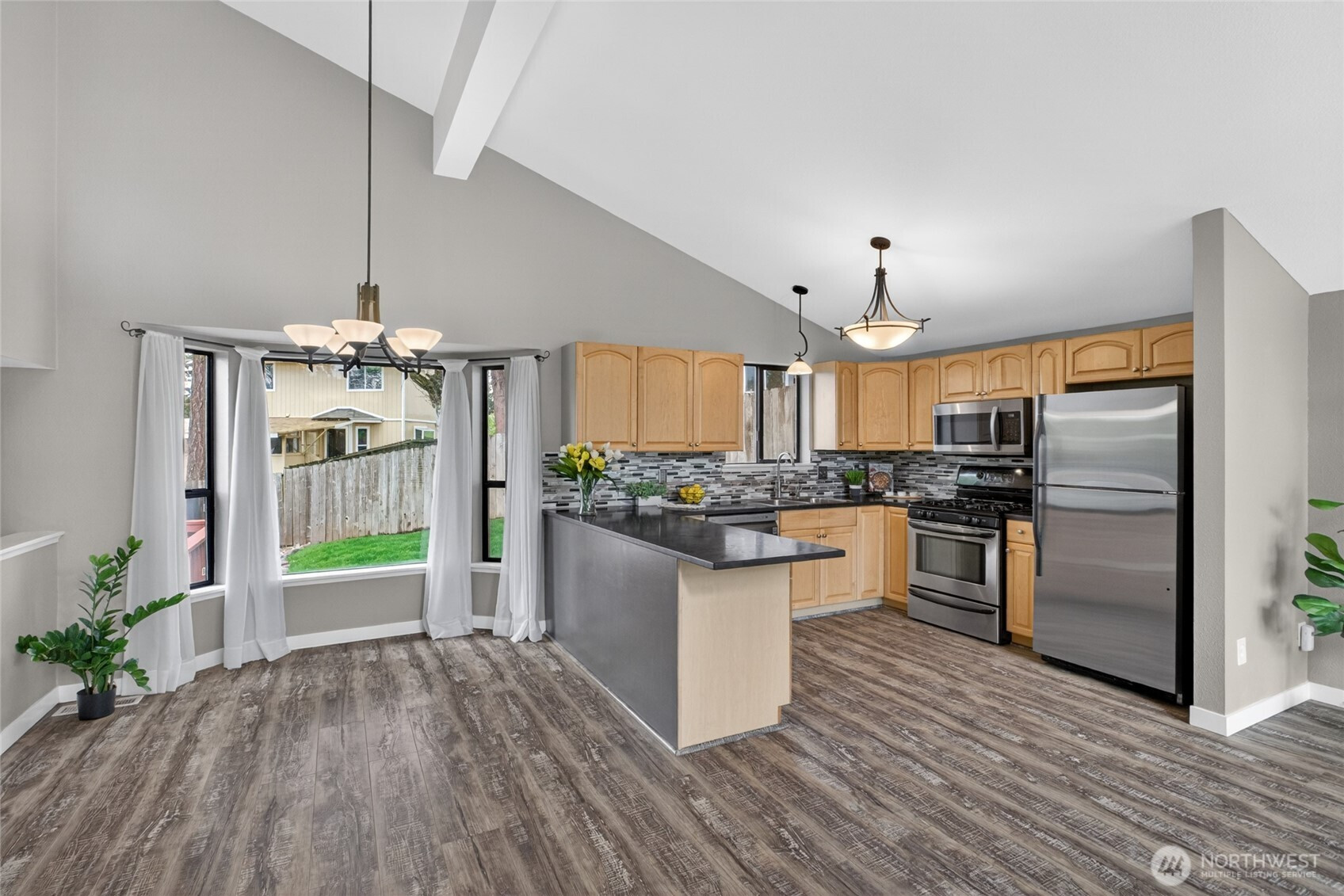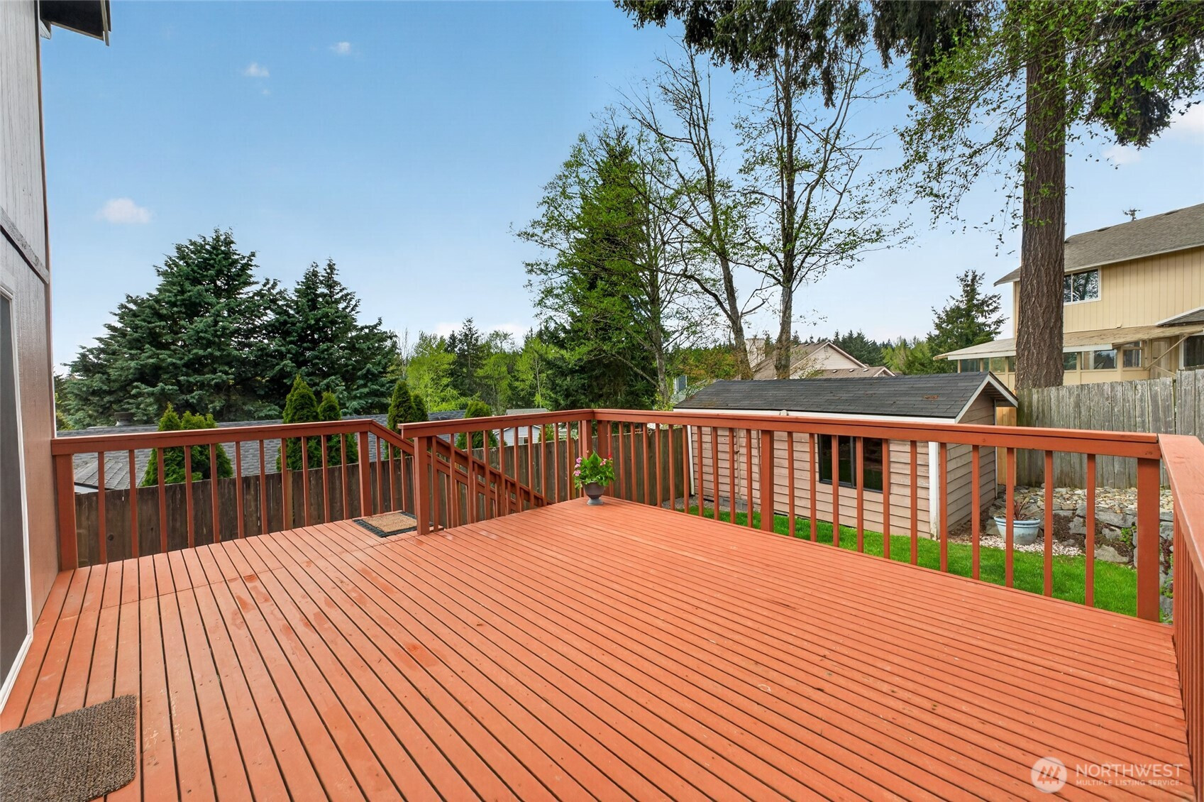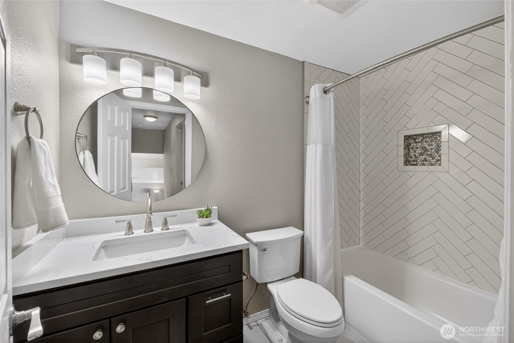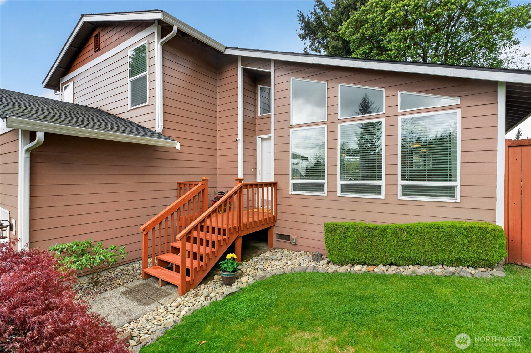 Welcome to this beautifully maintained 3 Bedroom, 2.5 Bath tri-level home offering 1,450 sq ft of thoughtfully designed living space. Featuring luxury flooring in the main living areas, hallway, and primary bath, along with brand new carpet throughout, this move-in ready home perfectly blends comfort, style, and modern updates. The bright, updated kitchen is a true standout, showcasing granite countertops, a gas stove, ample cabinetry, and sleek stainless-steel appliances- ideal for both everyday living and entertaining. The refreshed bathrooms feature elegant quartz countertops with tile flooring in the upstairs main bath and durable vinyl in the downstairs bath/ laundry room. Relax by the cozy gas fireplace or host gatherings in the inviting open-concept living and dining areas filled with abundant natural light. The home is also hardwired for a generator, offering added convenience and peace of mind year-round. A generously sized garage provides ample storage and workspace options. Step outside to a fully fenced backyard with a spacious deck- perfect for entertaining, outdoor dining, or simply unwinding- along with a sprinkler system to keep the yard lush and a garden shed for additional storage. Ideally situated on a quiet cul-de-sac in a desirable neighborhood between Seattle and Tacoma, this home offers easy access to major commuting routes, shopping, dining, parks, and everyday conveniences.