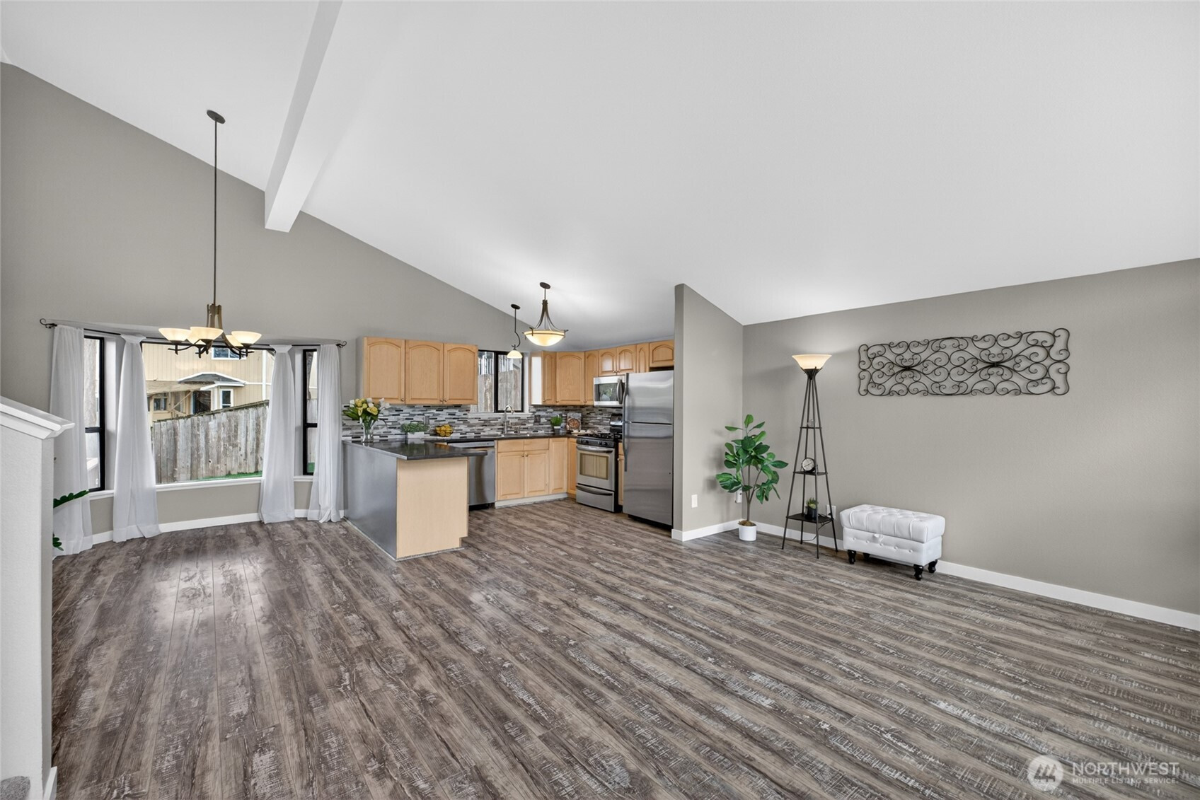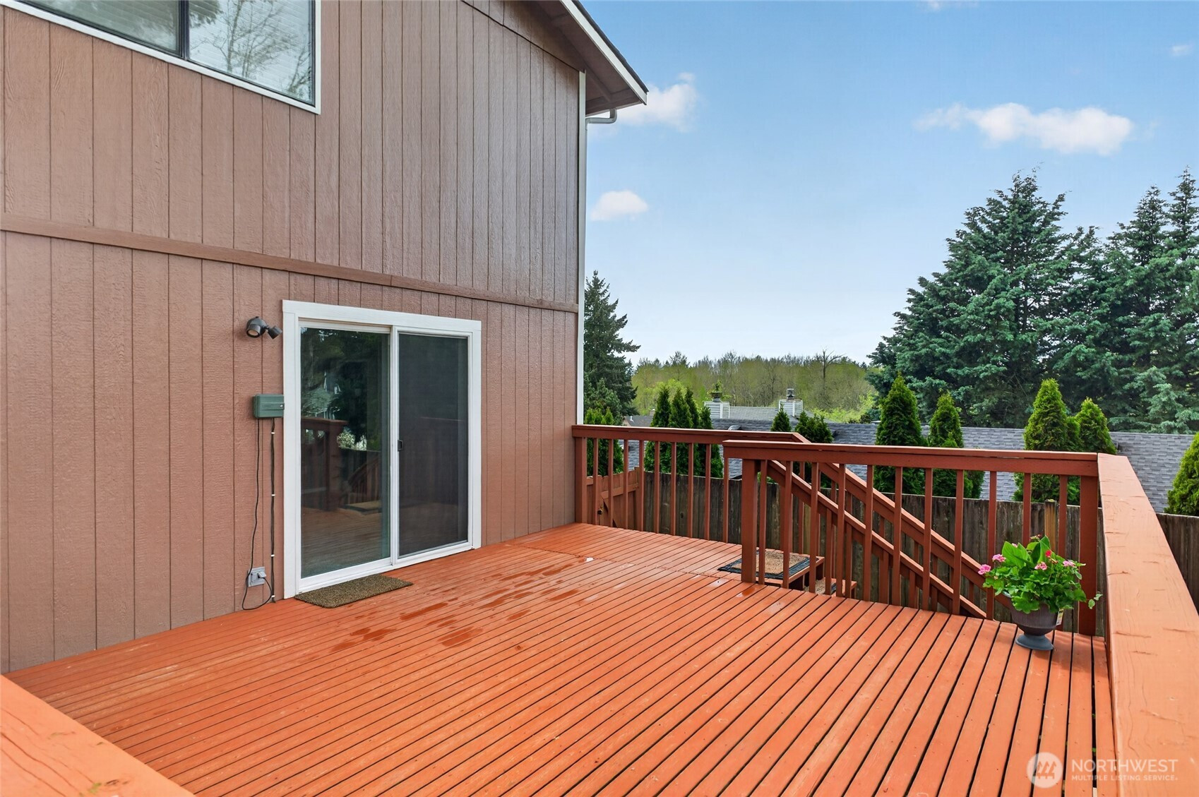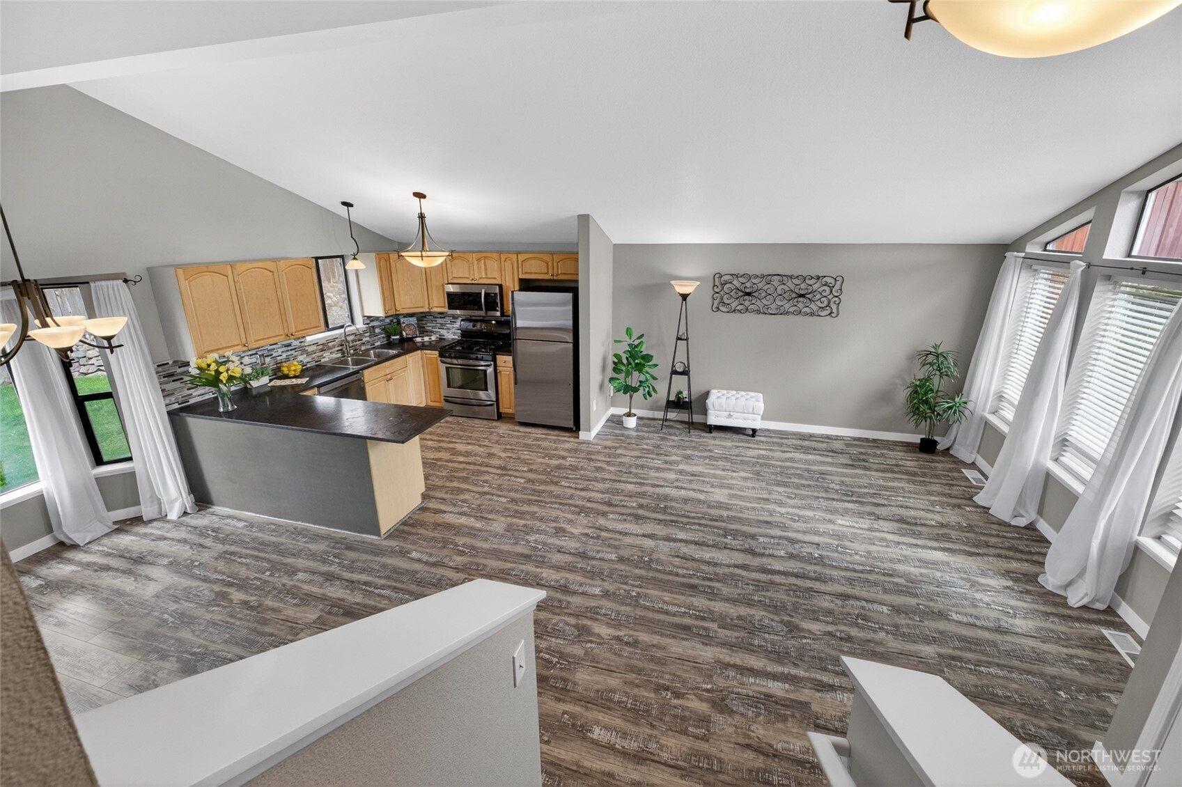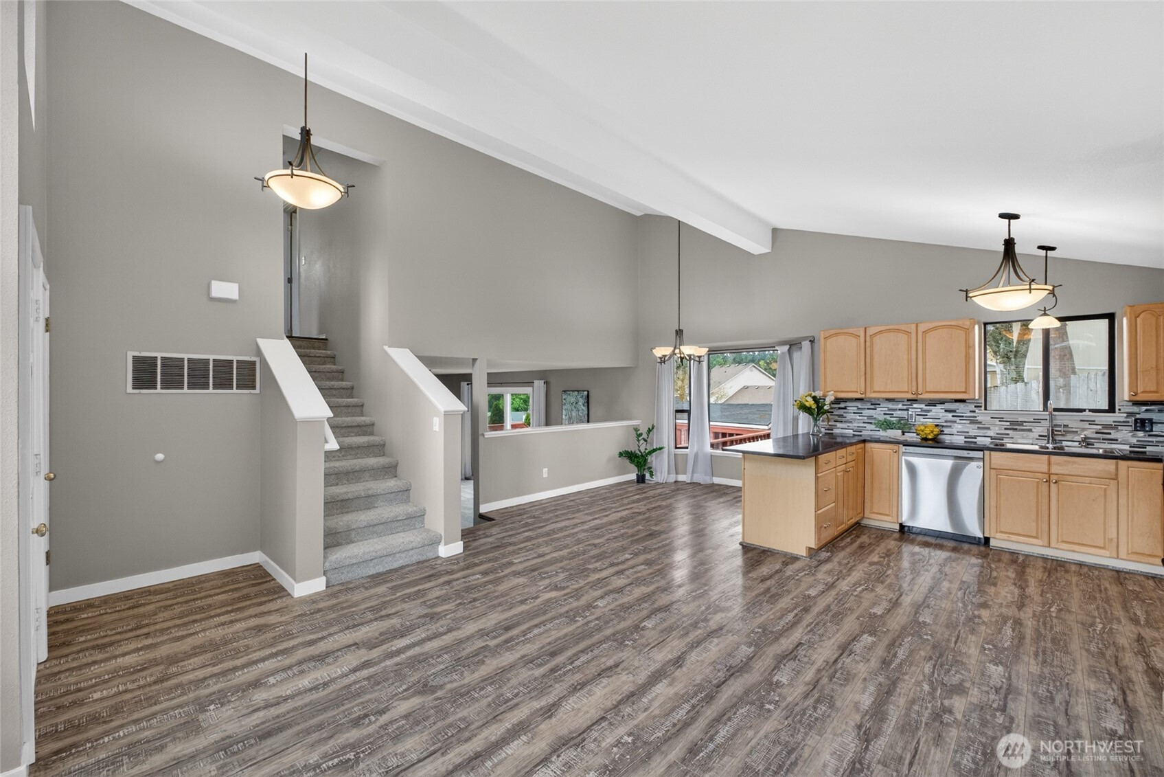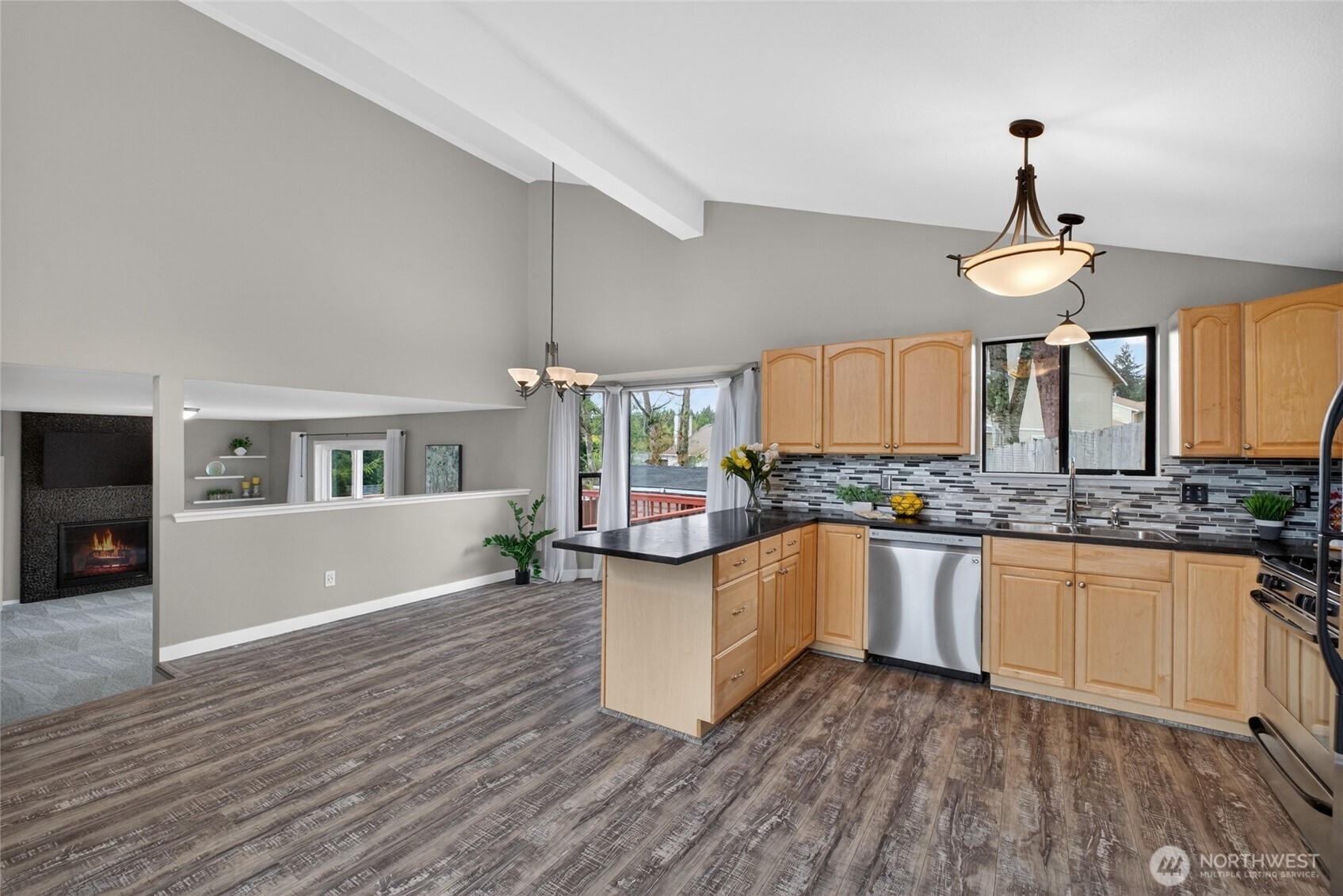 Welcome to this beautifully maintained 3 Bedroom, 2.5 Bath tri-level home offering 1,450 sq ft of thoughtfully designed living space. Featuring luxury flooring in the main living areas, hallway, and primary bath, along with brand new carpet throughout, this move-in ready home perfectly blends comfort, style, and modern updates. The bright, updated kitchen is a true standout, showcasing granite countertops, a gas stove, ample cabinetry, and sleek stainless-steel appliances- ideal for both everyday living and entertaining. The refreshed bathrooms feature elegant quartz countertops with tile flooring in the upstairs main bath and durable vinyl in the downstairs bath/ laundry room. Relax by the cozy gas fireplace or host gatherings in the inviting open-concept living and dining areas filled with abundant natural light. The home is also hardwired for a generator, offering added convenience and peace of mind year-round. A generously sized garage provides ample storage and workspace options. Step outside to a fully fenced backyard with a spacious deck- perfect for entertaining, outdoor dining, or simply unwinding- along with a sprinkler system to keep the yard lush and a garden shed for additional storage. Ideally situated on a quiet cul-de-sac in a desirable neighborhood between Seattle and Tacoma, this home offers easy access to major commuting routes, shopping, dining, parks, and everyday conveniences.