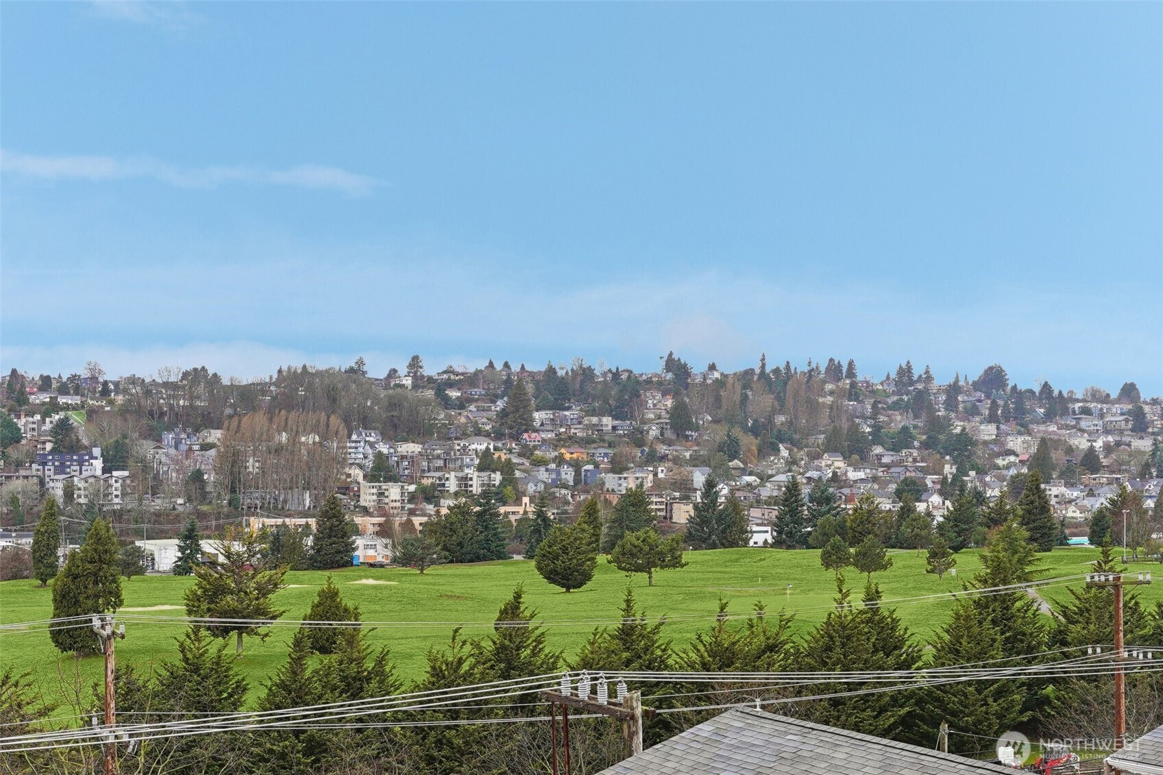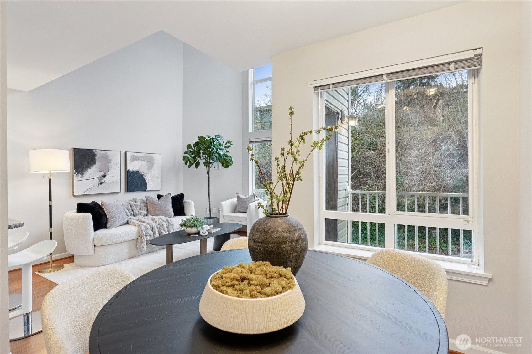 Water views in the heart of Interbay! Enjoy sweeping views of the Puget Sound and Olympic Mountains from this top-floor home with a quiet rooftop deck – set above the city and well suited for relaxing, entertaining, or enjoying sunsets – plus an additional deck off the dining area for seamless indoor-outdoor living. Light-filled interiors feature a dramatic two-story vaulted ceiling with triple east-facing windows, bamboo flooring, and a convenient powder room for guests. The updated U-shaped kitchen offers white cabinetry, granite counters, a brand-new dishwasher, and opens seamlessly to the dining area. A flexible loft bedroom with ceiling fan and full bath provides privacy and versatility, while brand-new custom closet systems throughout maximize storage. Additional highlights include stacked ventless washer/dryer, fresh interior paint, and updated lighting and hardware. Secure elevator building with secure parking garage and ample storage unit directly across the hall. Convenient location near Whole Foods, shops, and breweries, directly across from Interbay Golf Center, and minutes from downtown Seattle, Ballard, and Queen Anne. A rare opportunity combining views, quiet outdoor space, updates, and location convenience. A must see!