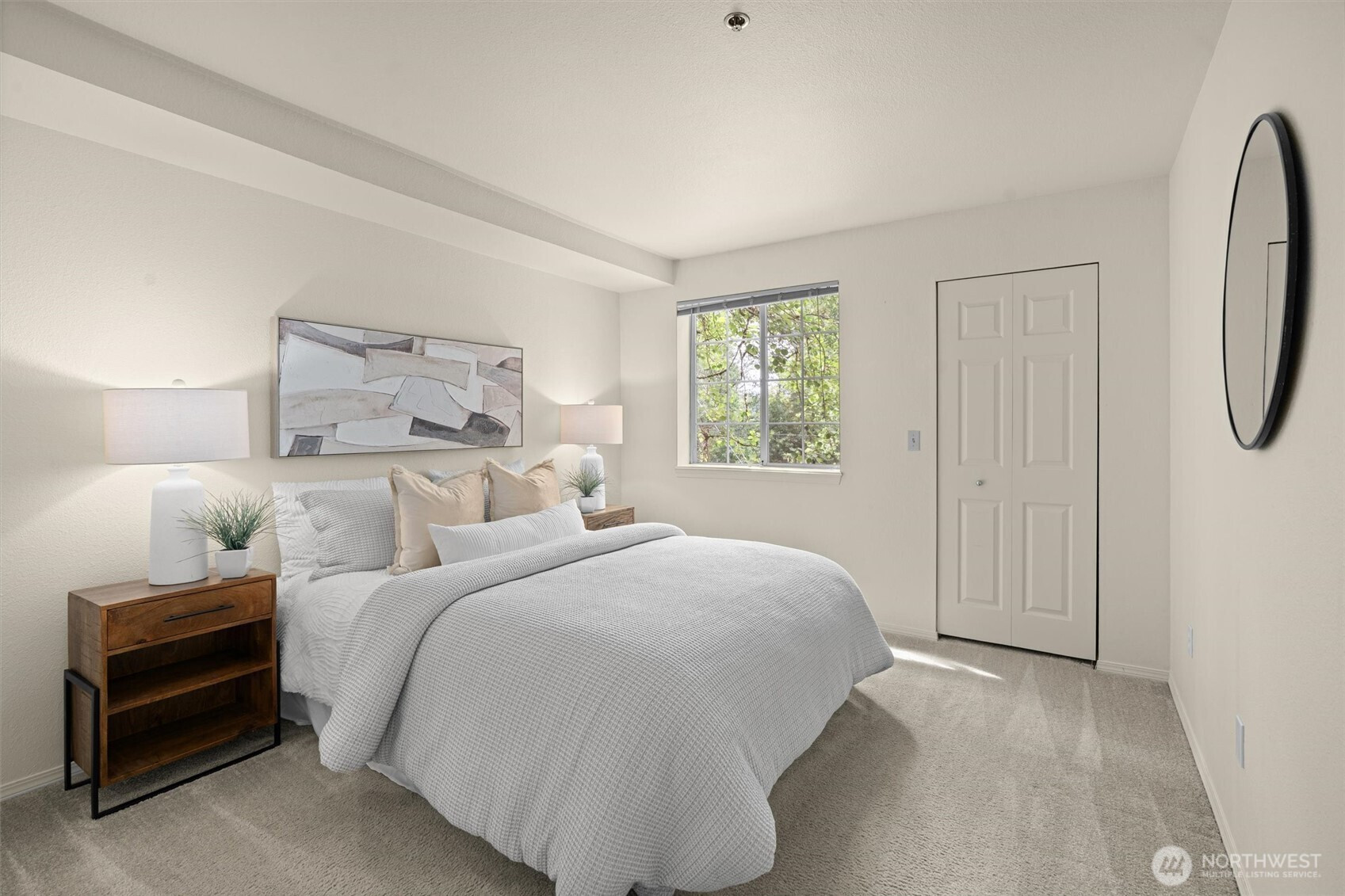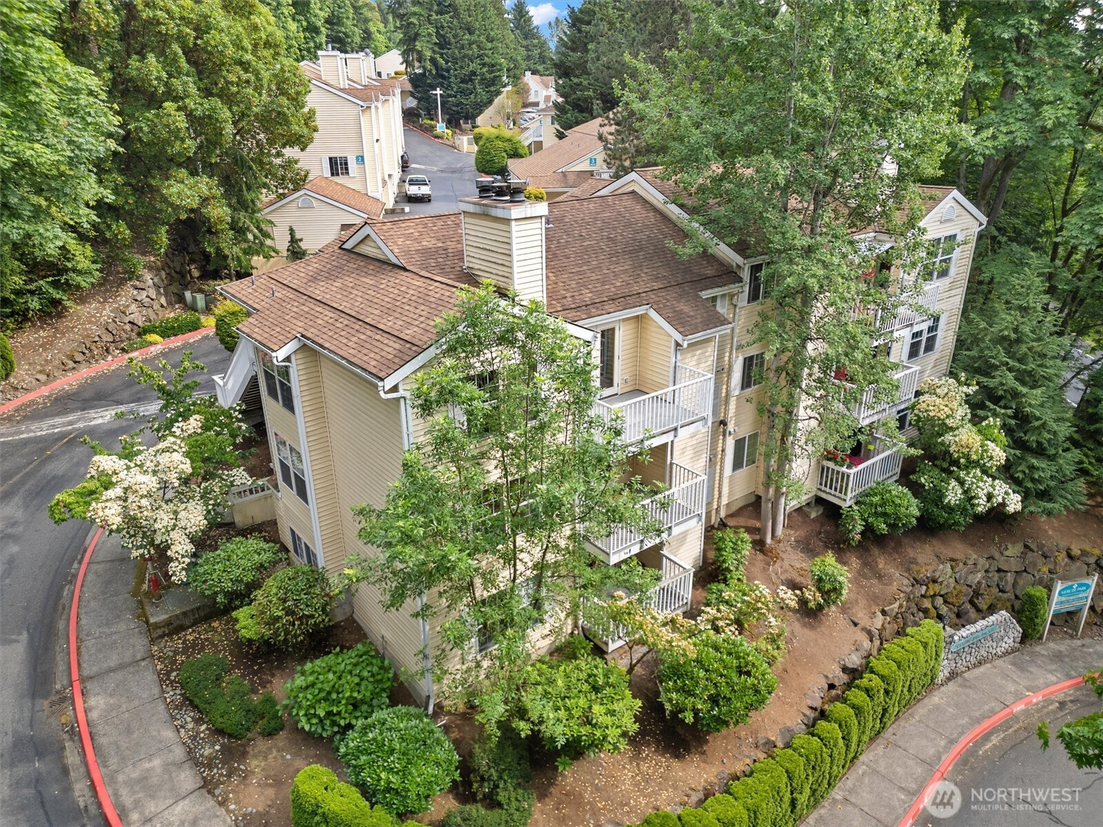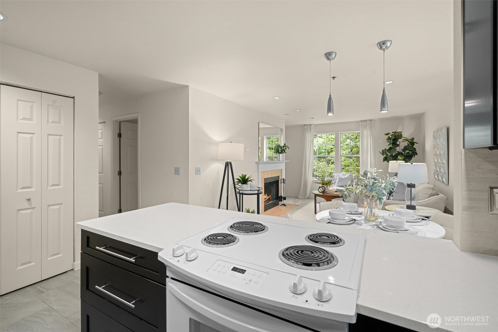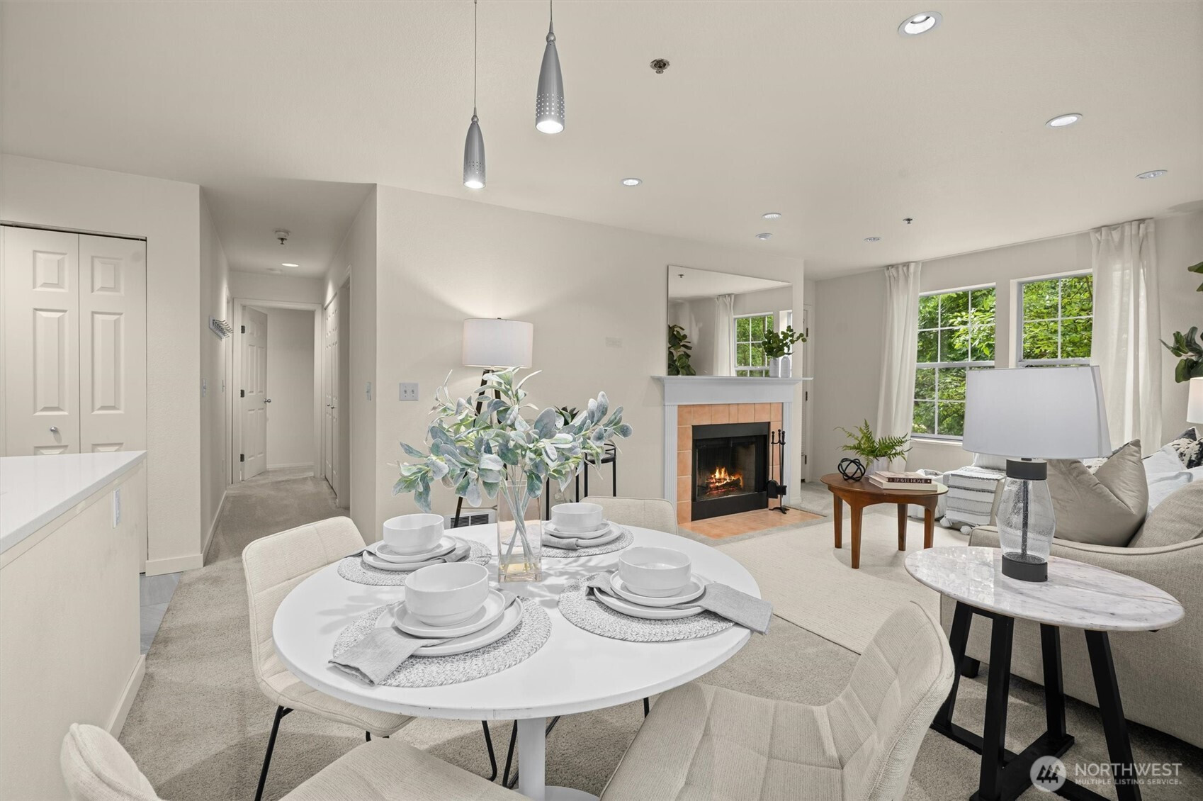 Nestled on a quiet, tree-lined street, Mercer Park Condos offers a rare blend of privacy and prime Bellevue connectivity—just minutes to downtown, I-405, I-90, light rail, and the trails of Mercer Slough Park. This bright corner 2BD/2BA residence features an updated kitchen with quartz counters, newer cabinetry, stainless-steel appliances, and newer carpet throughout. An open, airy layout is framed by oversized windows, a welcoming fireplace, and a balcony with serene greenbelt views. The primary suite includes two closets and a private full bath, while the second bedroom with French doors opens directly to the balcony—ideal for flexible living or work-from-home needs. An attached one-car garage adds everyday ease, and community amenities include a clubhouse, fitness center, sauna, and walking trails. Located within the Bellevue School District, this home is perfectly suited for buyers seeking comfort, commute efficiency, and long-term value in a highly connected setting.