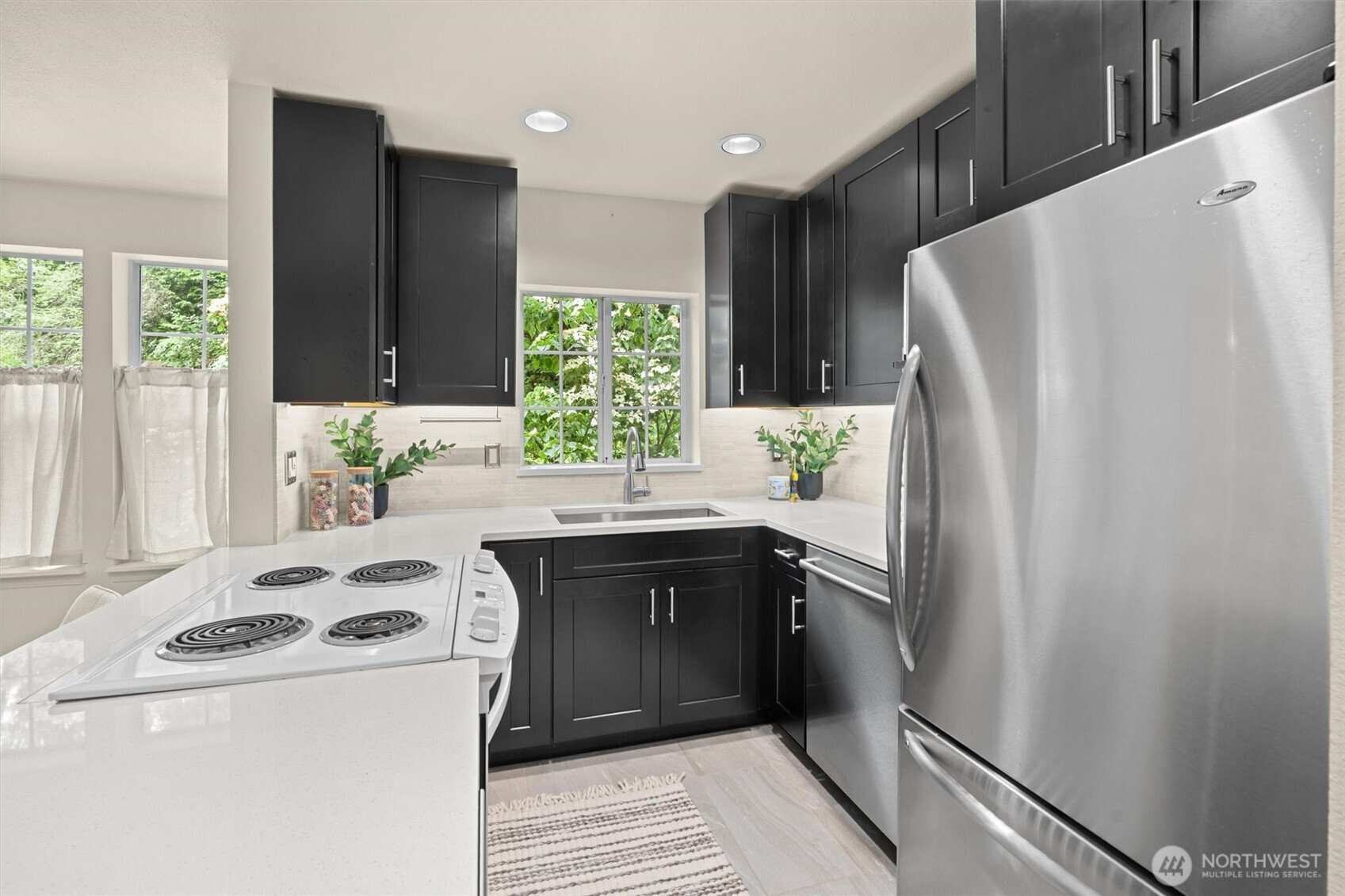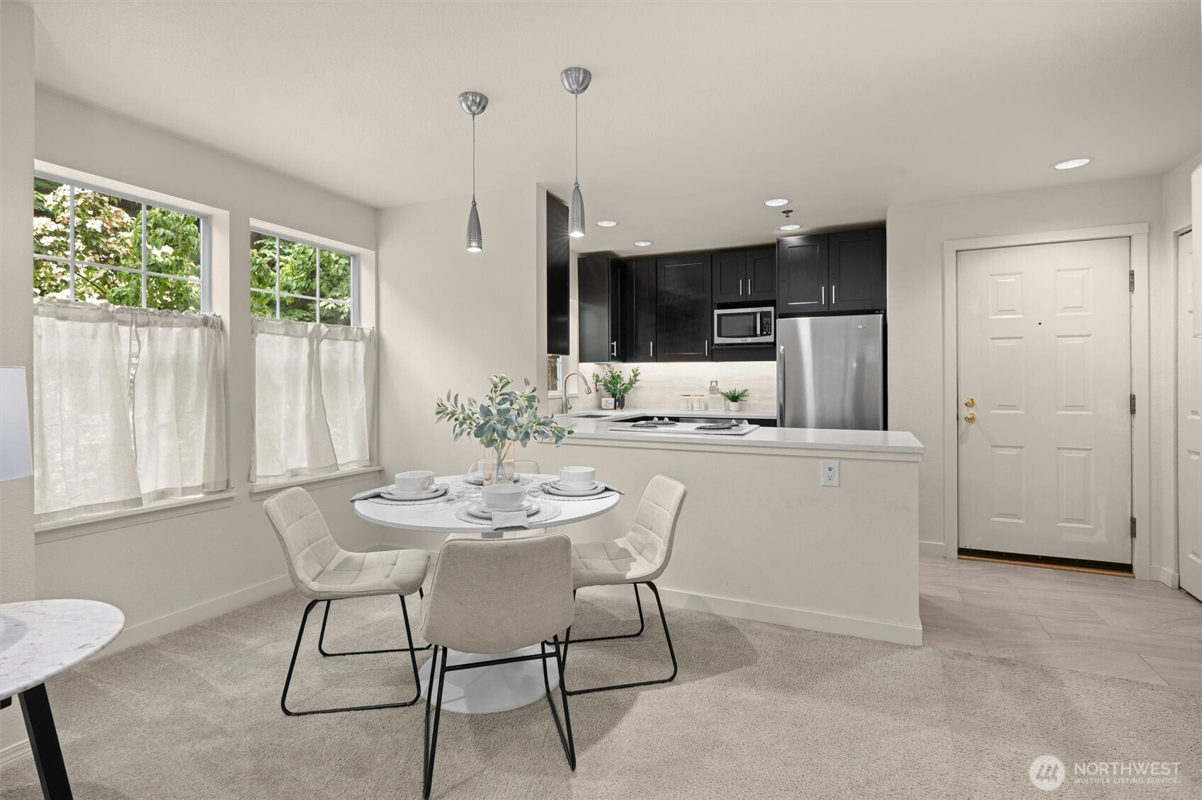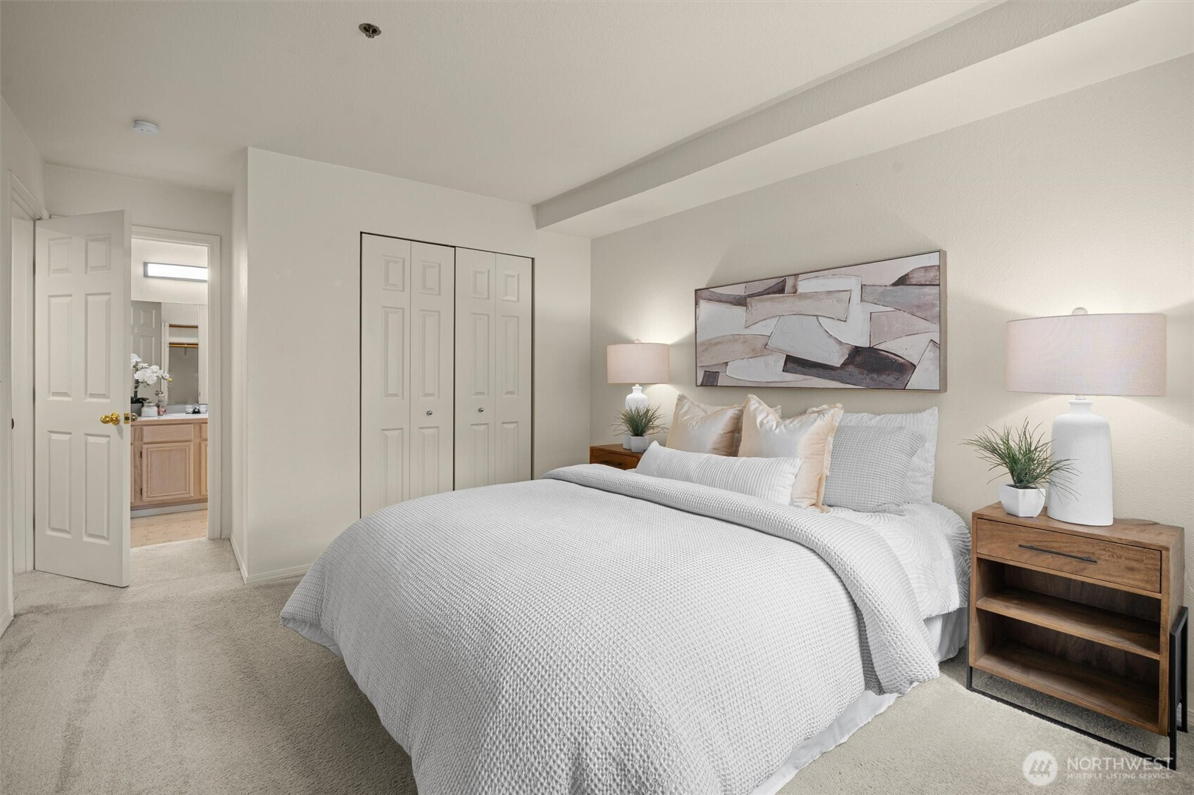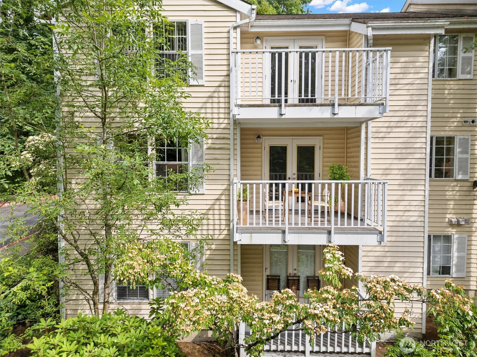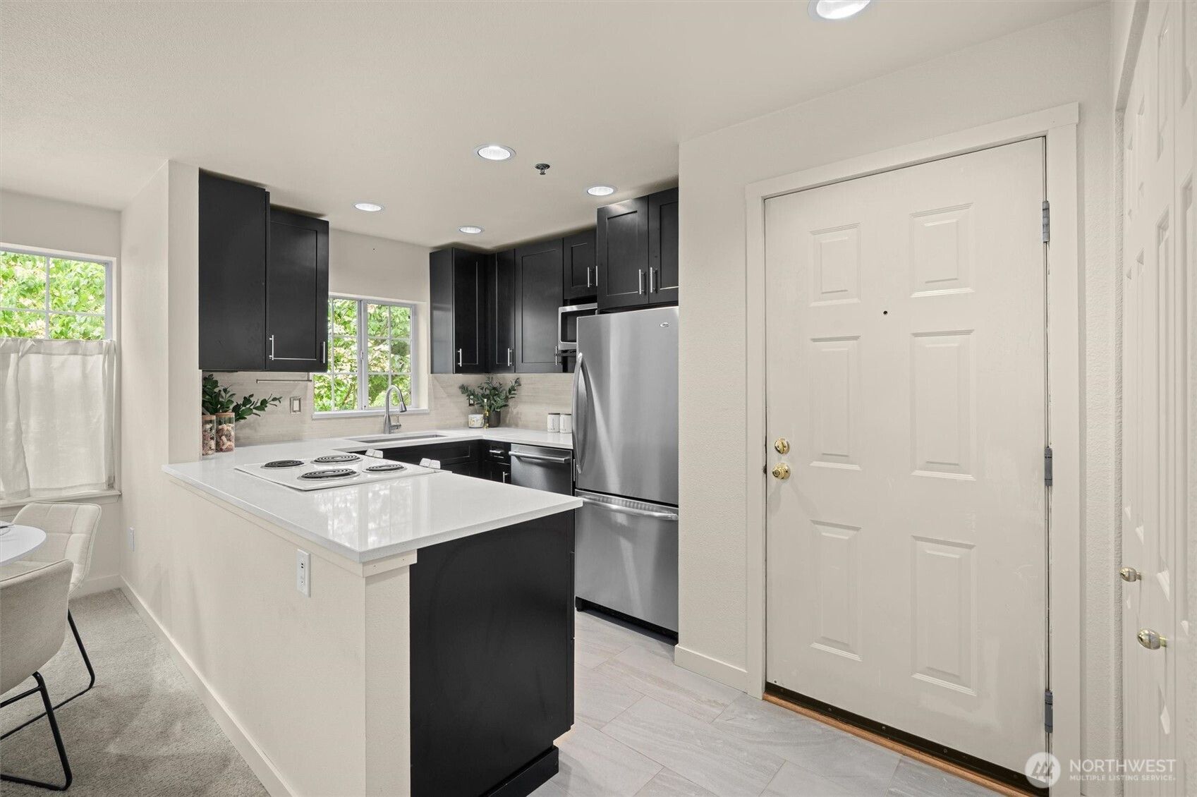 Nestled on a quiet, tree-lined street, Mercer Park Condos offers a rare blend of privacy and prime Bellevue connectivity—just minutes to downtown, I-405, I-90, light rail, and the trails of Mercer Slough Park. This bright corner 2BD/2BA residence features an updated kitchen with quartz counters, newer cabinetry, stainless-steel appliances, and newer carpet throughout. An open, airy layout is framed by oversized windows, a welcoming fireplace, and a balcony with serene greenbelt views. The primary suite includes two closets and a private full bath, while the second bedroom with French doors opens directly to the balcony—ideal for flexible living or work-from-home needs. An attached one-car garage adds everyday ease, and community amenities include a clubhouse, fitness center, sauna, and walking trails. Located within the Bellevue School District, this home is perfectly suited for buyers seeking comfort, commute efficiency, and long-term value in a highly connected setting.