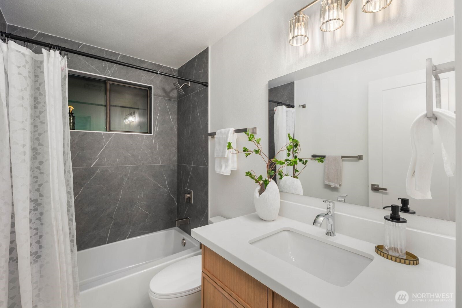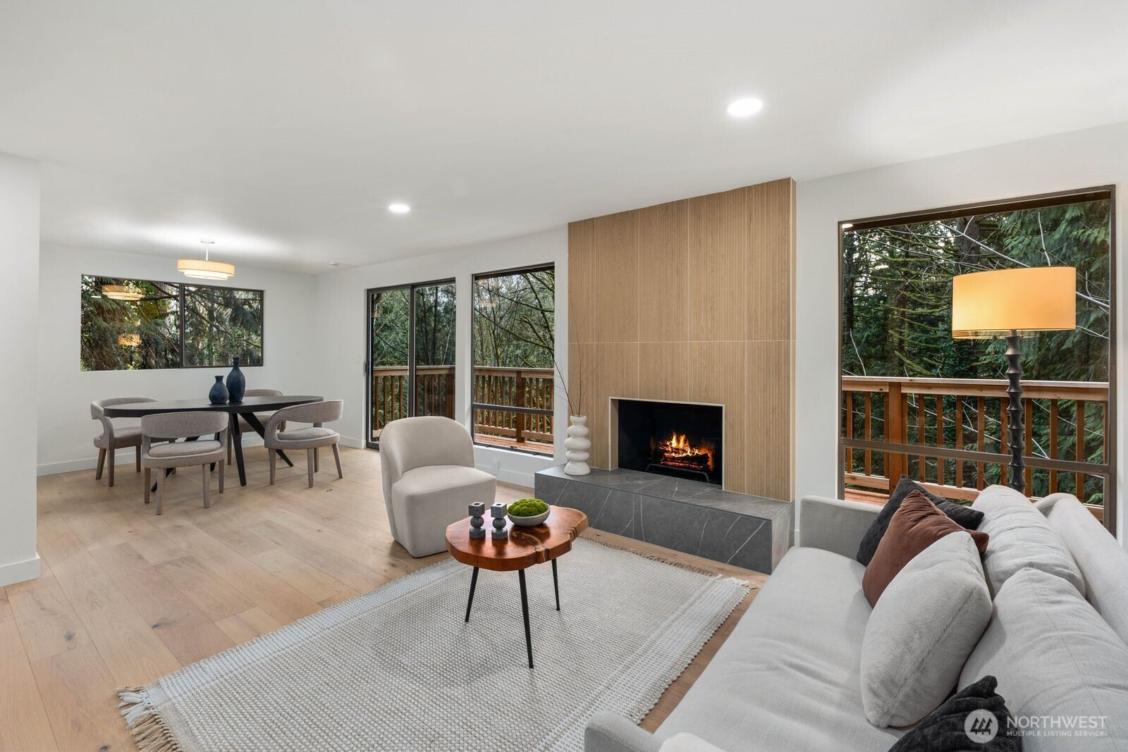 Nestled in the coveted Mirrormont neighborhood, this beautifully remodeled 4-bedroom, 3-bathroom home offers nearly 3,000 square feet of refined living surrounded by the natural beauty of the Pacific Northwest. Set on just under an acre of forested land, the property delivers a rare sense of seclusion while remaining close to everything Issaquah has to offer. Engineered hardwood floors flow throughout the open living spaces, anchored by a stunning wood-paneled fireplace with a dark stone hearth and floor-to-ceiling surround. Walls of windows and sliding glass doors connect the living room directly to the deck, where towering evergreens and peaceful forest views set the backdrop. The updated kitchen features warm wood cabinetry, stainless appliances, and clean white countertops opening to a casual dining area. The primary suite is a genuine retreat, complete with a custom walk-in closet finished with built-in shelving and drawers. The lower level adds a spacious second living area with its own fireplace, offering flexibility for a media room, guest quarters, or additional entertaining space. Multiple decks, a two-car garage, and nearly an acre of forested grounds complete this move-in ready offering in one of Mirrormont’s most sought-after settings.