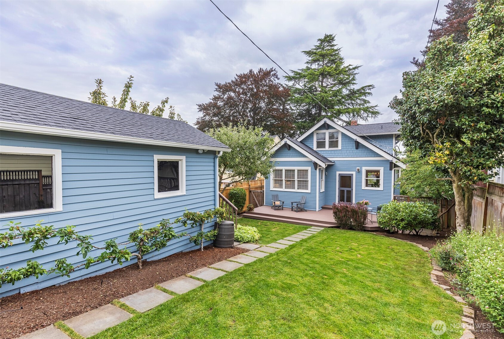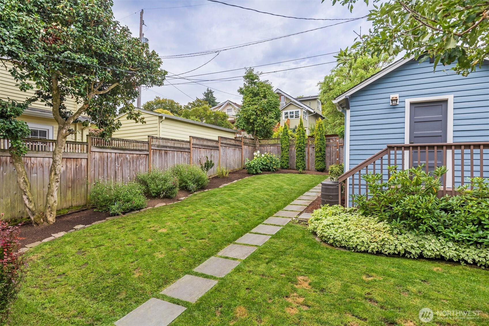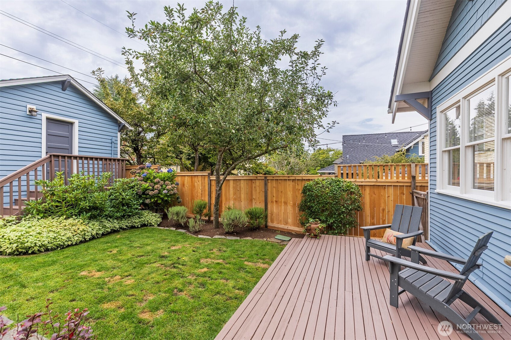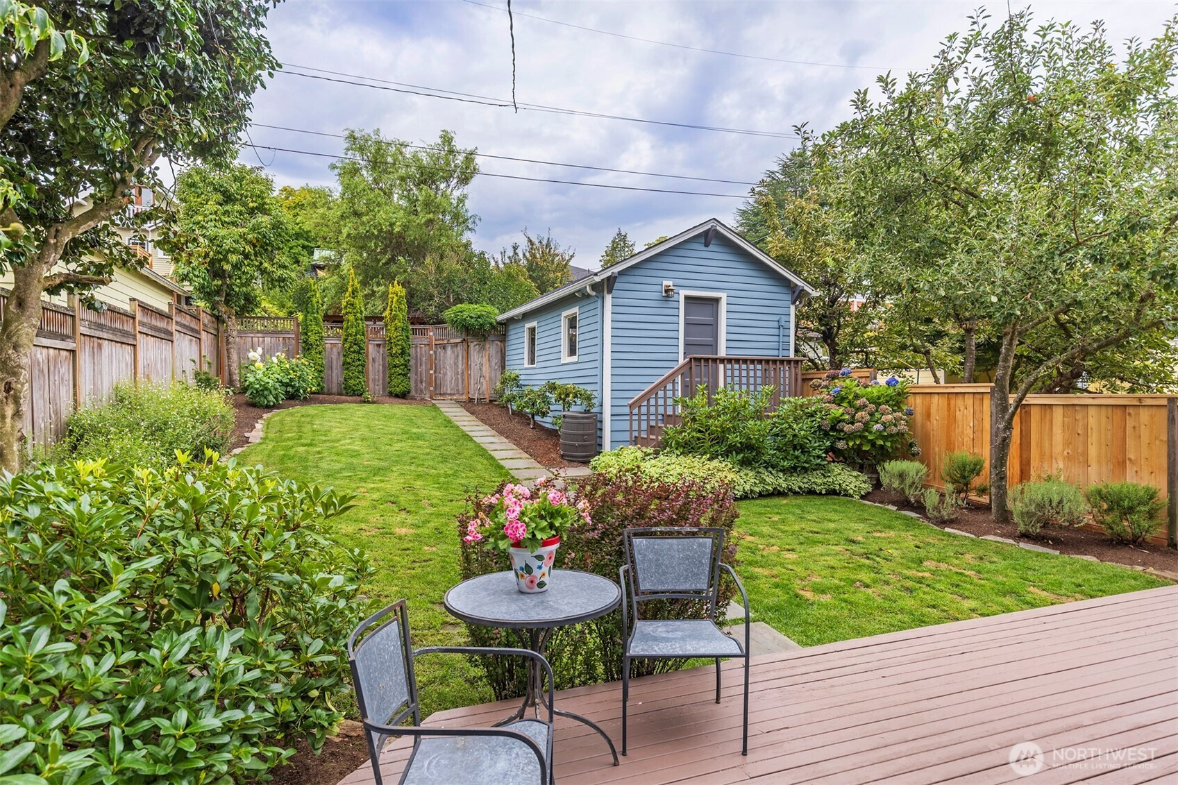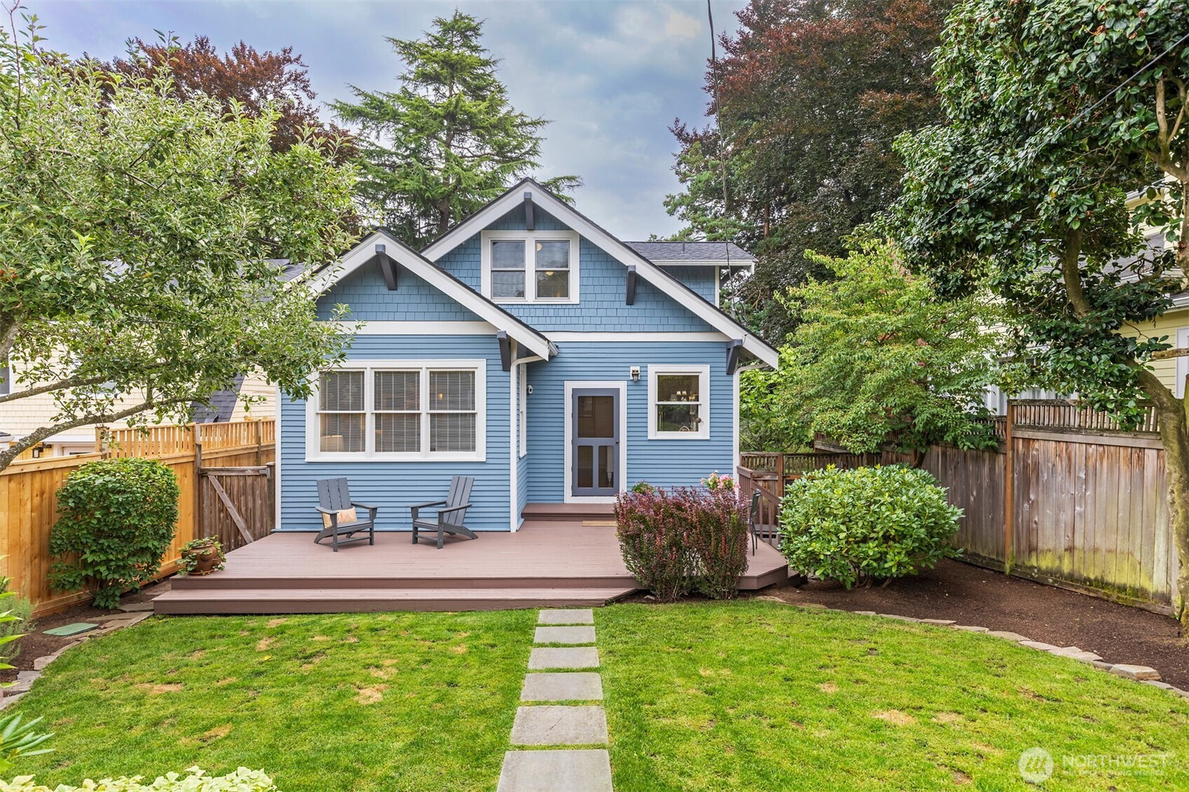 This beautifully maintained and thoughtfully updated Queen Anne Craftsman, perfectly perched above the street for added privacy presence. Step inside to a light-filled open living and dining area, featuring high ceilings and timeless character. The main floor offers a spacious bedroom, a full en-suite bathroom, ideal for guests or a home office. Upstairs, you’ll find 2 additional bedrooms & a stunningly modern full bathroom. The Chef’s kitchen is a true highlight, featuring granite countertops, abundant cabinetry, & a charming antique butcher block island—perfect for preparing meals & entertaining. Enjoy the level, fully fenced backyard complete w/ mature fruit trees, detached garage wi/alley access, and room to garden, relax, or play.