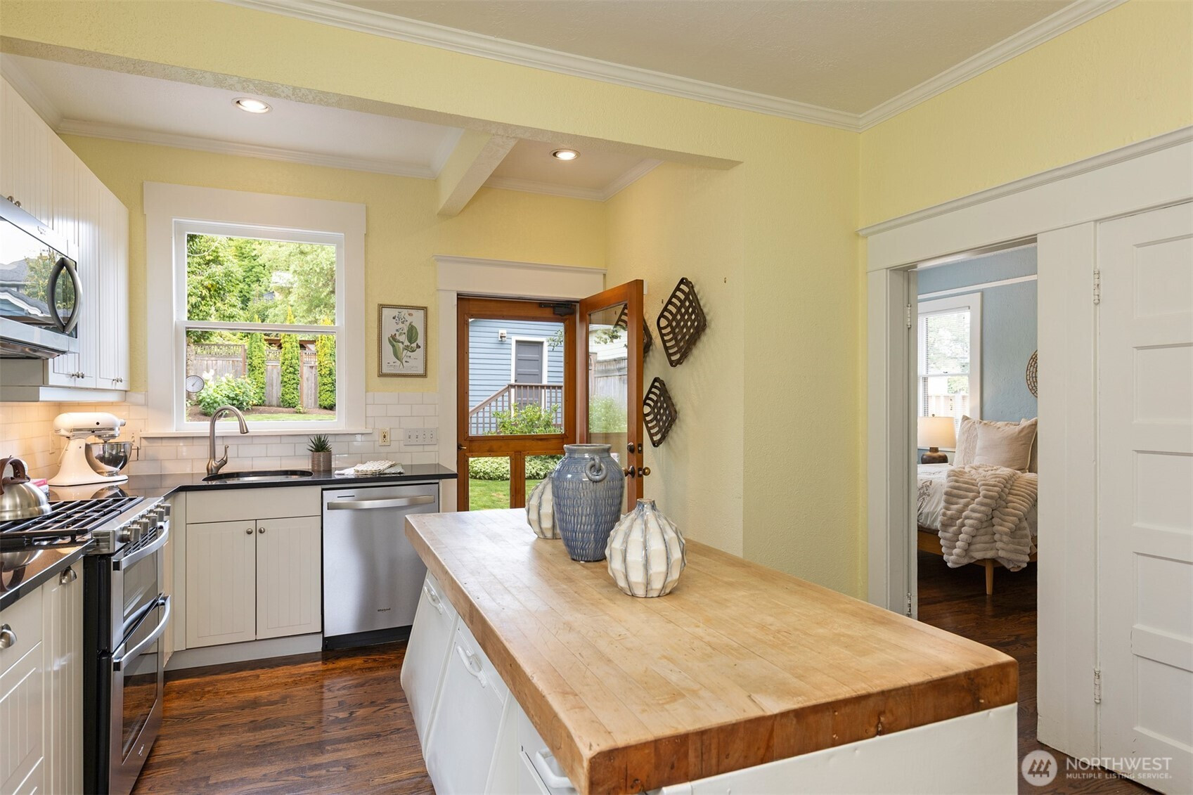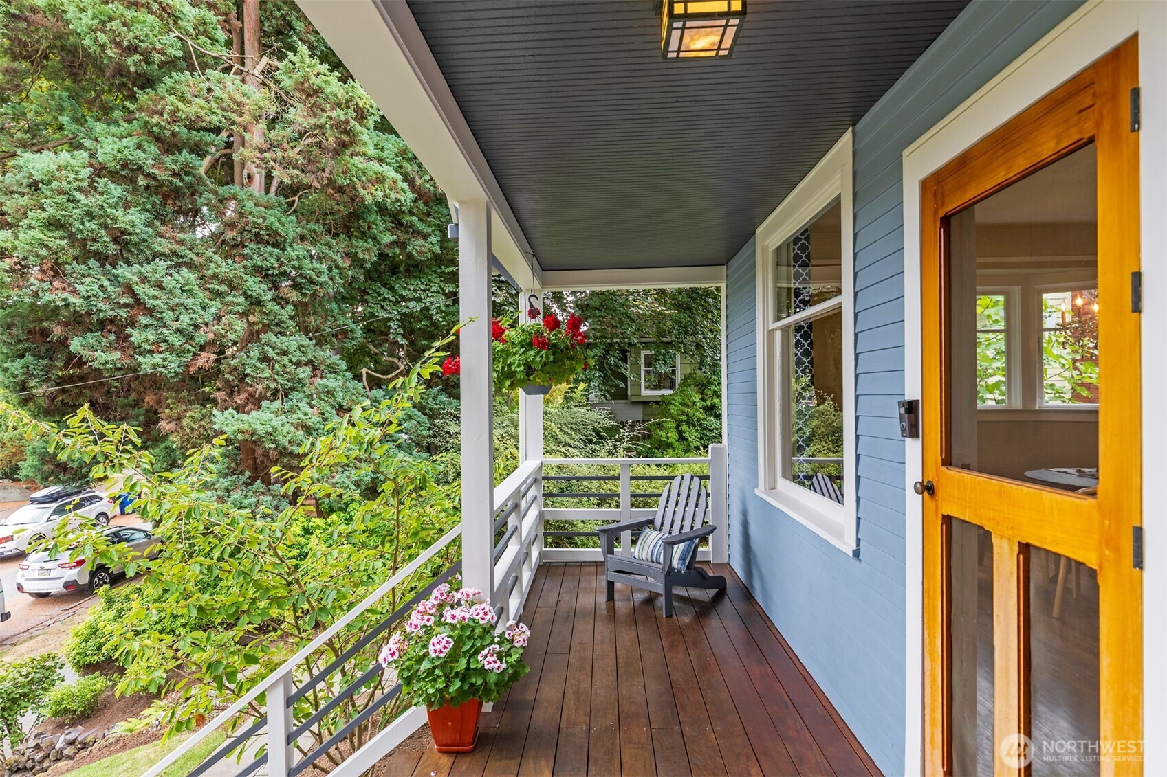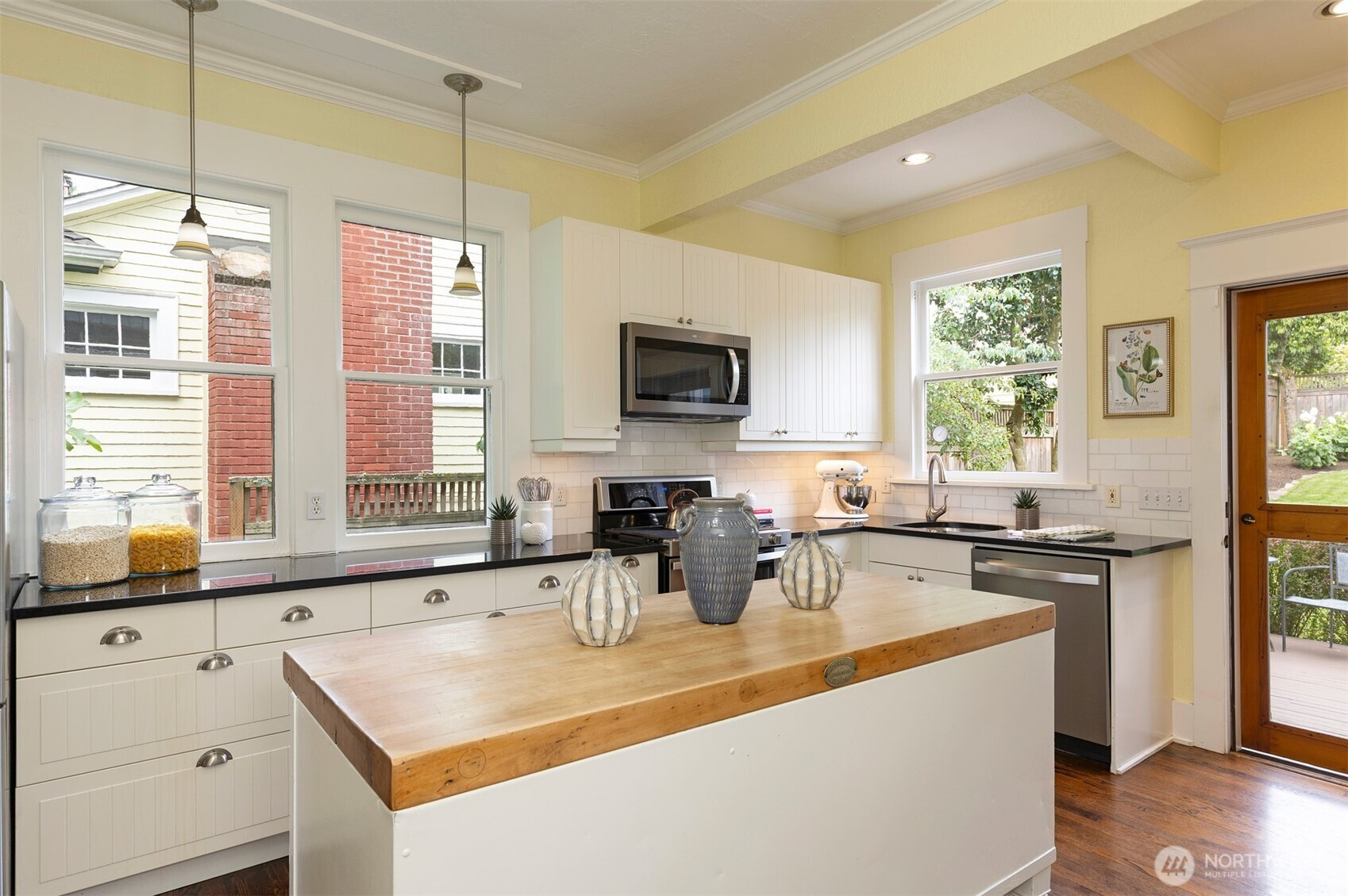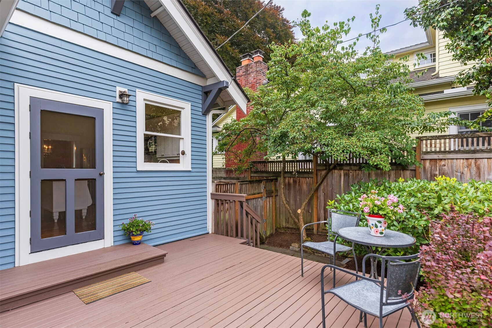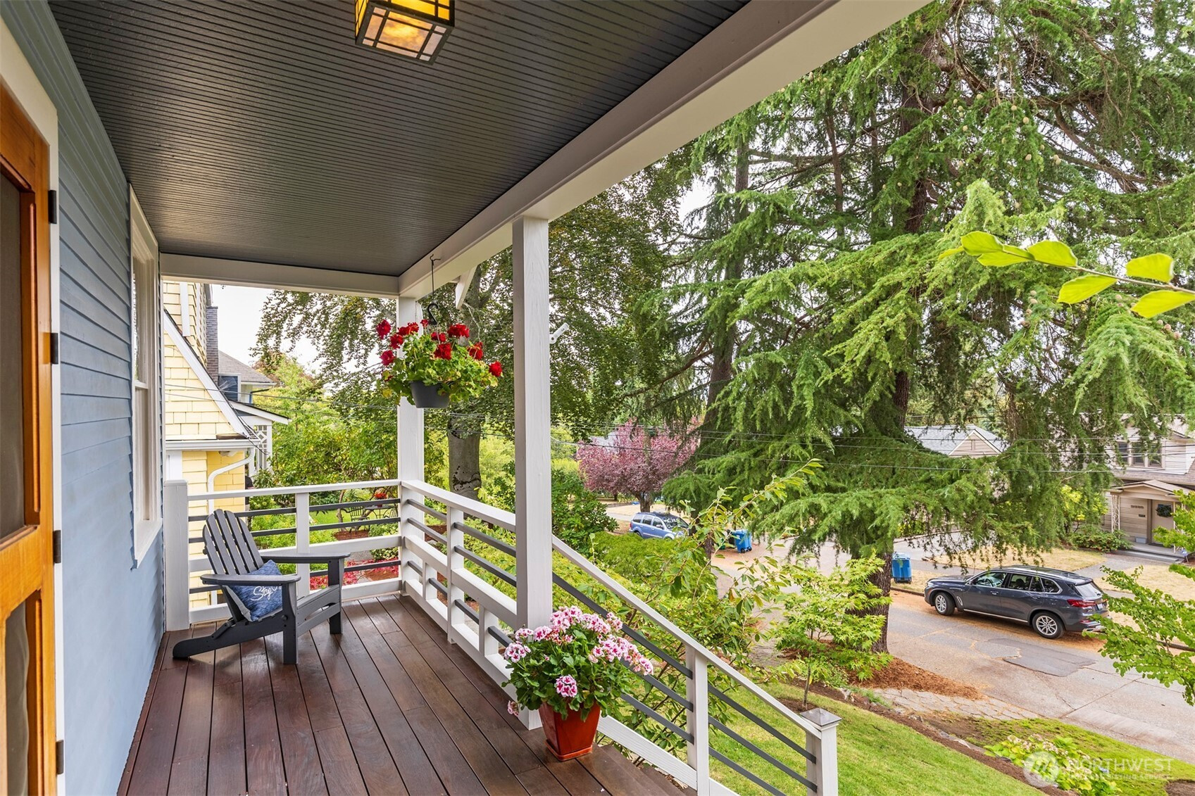 This beautifully maintained and thoughtfully updated Queen Anne Craftsman, perfectly perched above the street for added privacy presence. Step inside to a light-filled open living and dining area, featuring high ceilings and timeless character. The main floor offers a spacious bedroom, a full en-suite bathroom, ideal for guests or a home office. Upstairs, you’ll find 2 additional bedrooms & a stunningly modern full bathroom. The Chef’s kitchen is a true highlight, featuring granite countertops, abundant cabinetry, & a charming antique butcher block island—perfect for preparing meals & entertaining. Enjoy the level, fully fenced backyard complete w/ mature fruit trees, detached garage wi/alley access, and room to garden, relax, or play.