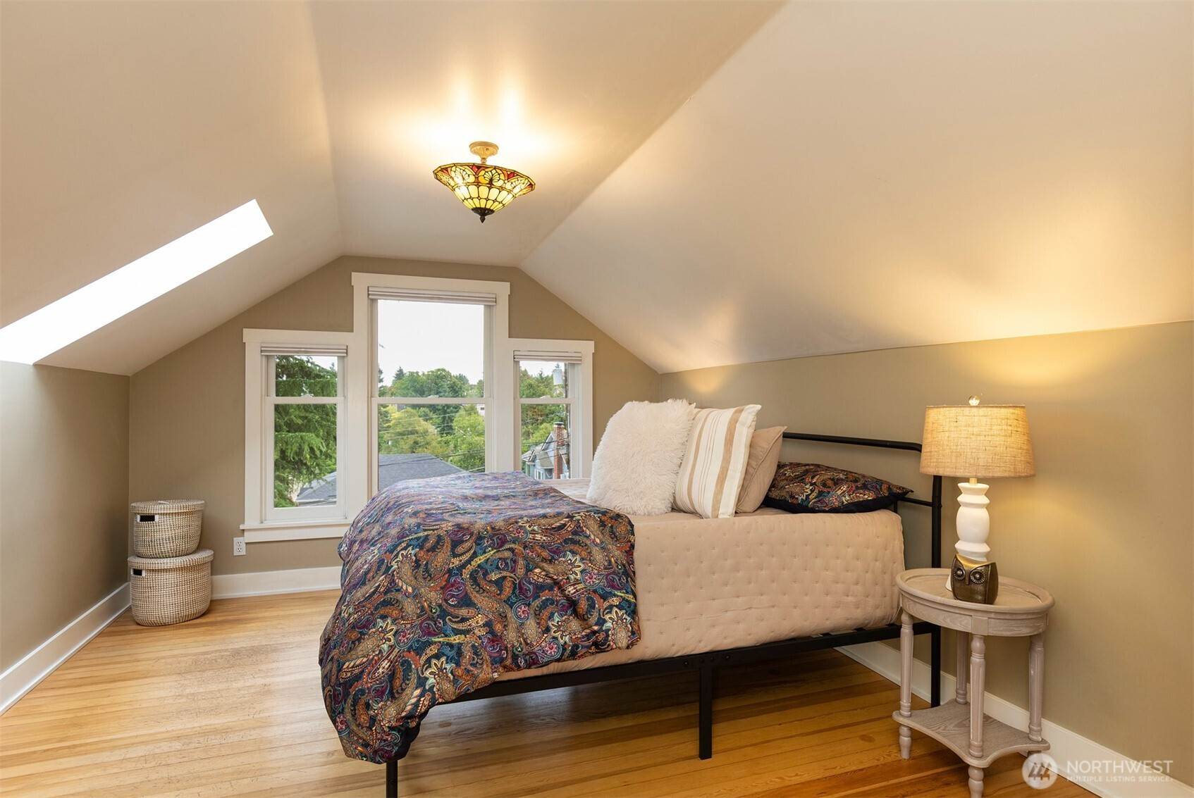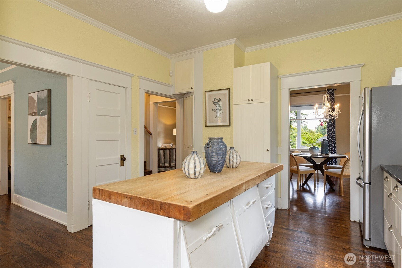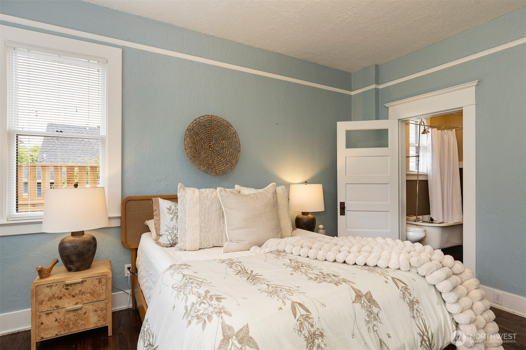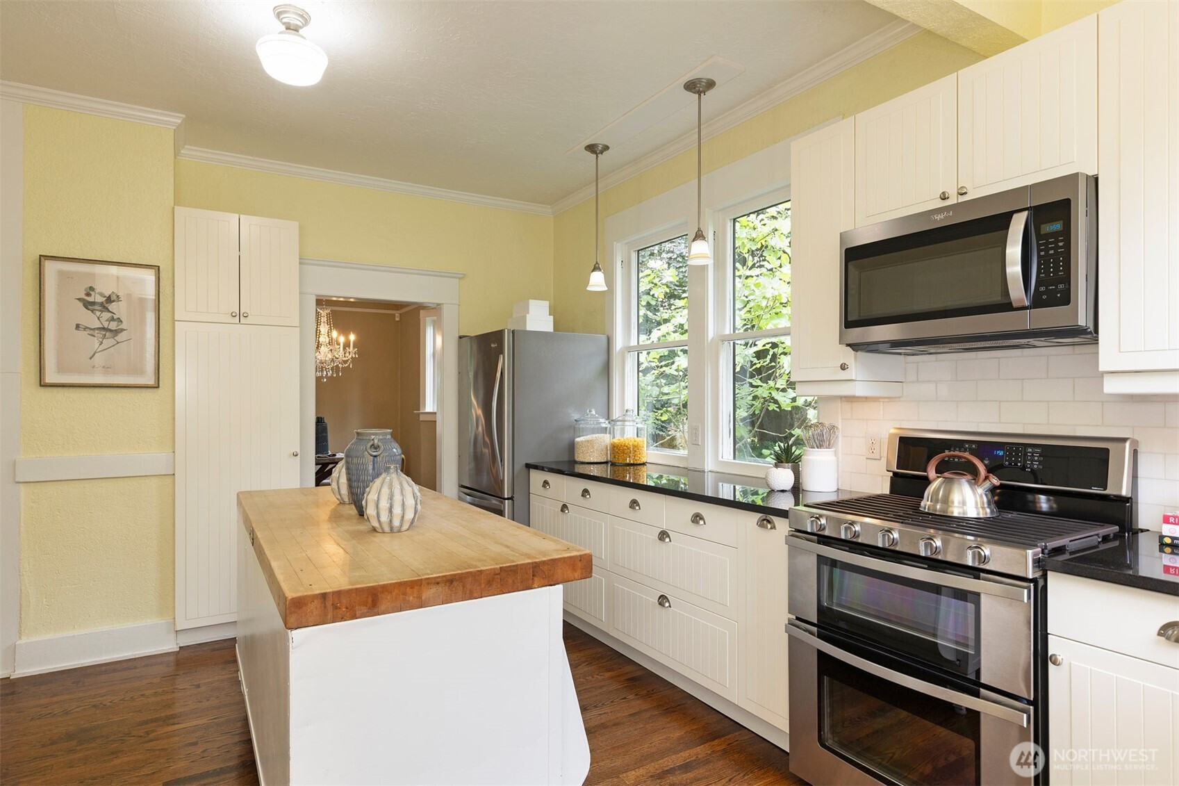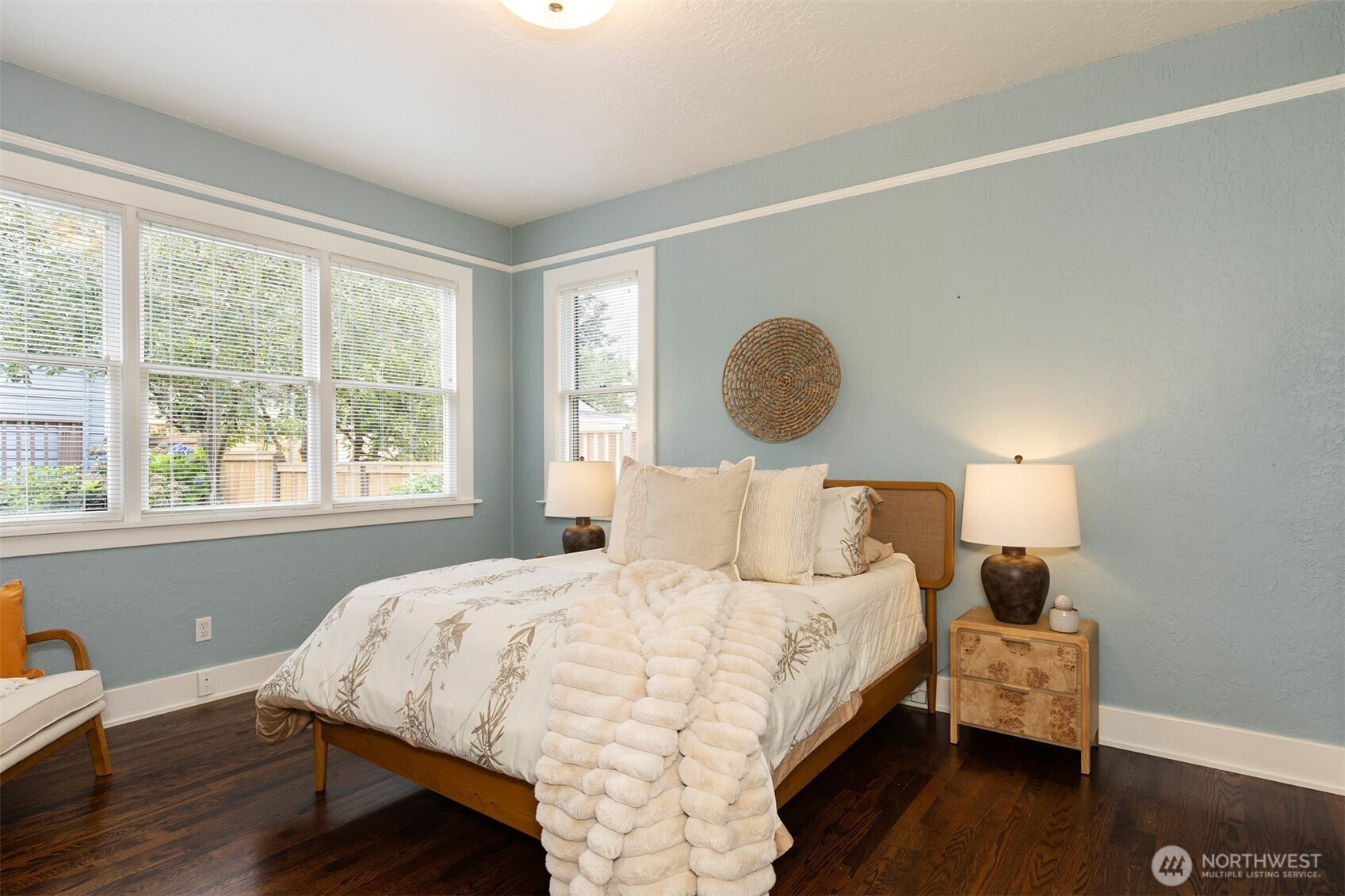 This beautifully maintained and thoughtfully updated Queen Anne Craftsman, perfectly perched above the street for added privacy presence. Step inside to a light-filled open living and dining area, featuring high ceilings and timeless character. The main floor offers a spacious bedroom, a full en-suite bathroom, ideal for guests or a home office. Upstairs, you’ll find 2 additional bedrooms & a stunningly modern full bathroom. The Chef’s kitchen is a true highlight, featuring granite countertops, abundant cabinetry, & a charming antique butcher block island—perfect for preparing meals & entertaining. Enjoy the level, fully fenced backyard complete w/ mature fruit trees, detached garage wi/alley access, and room to garden, relax, or play.