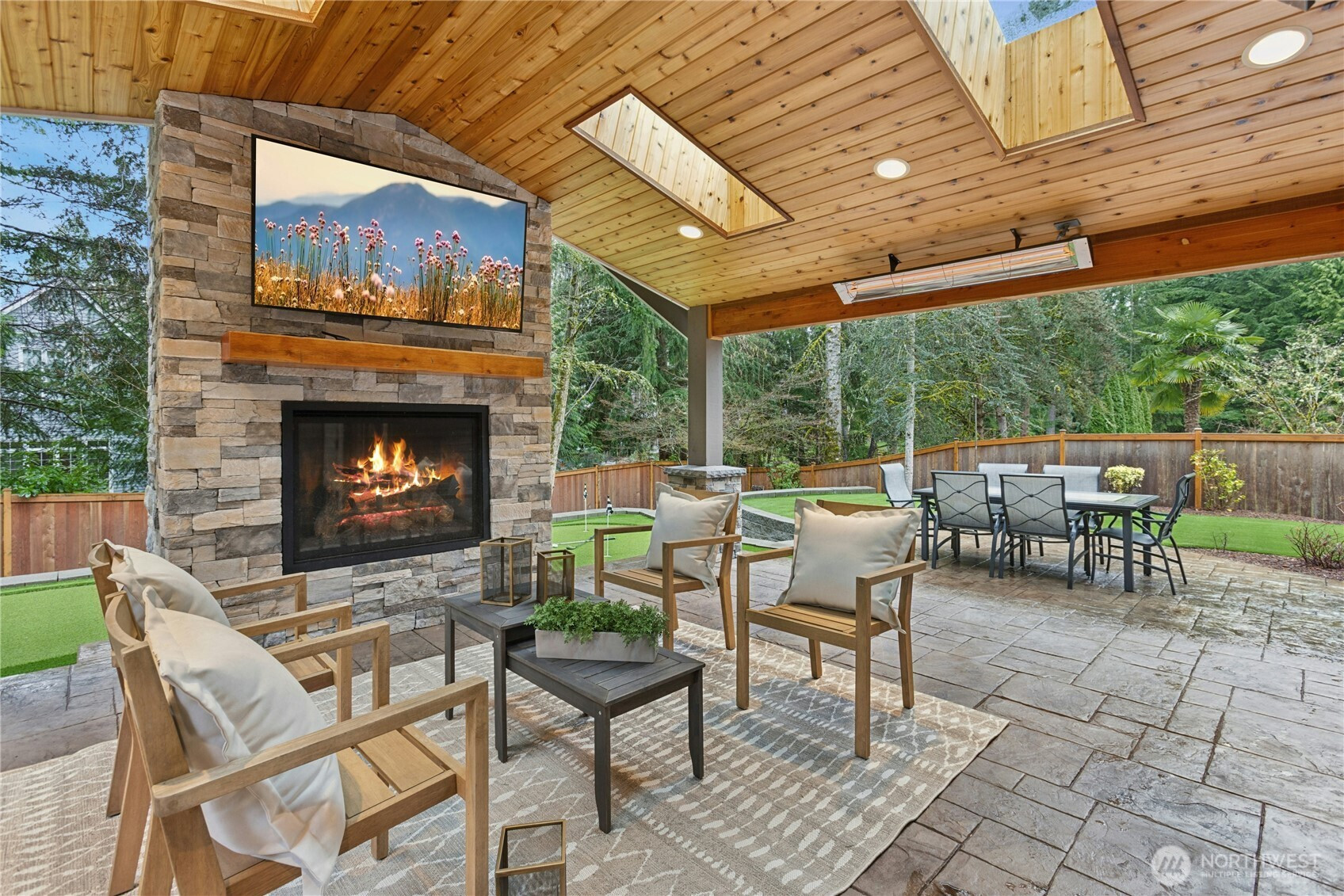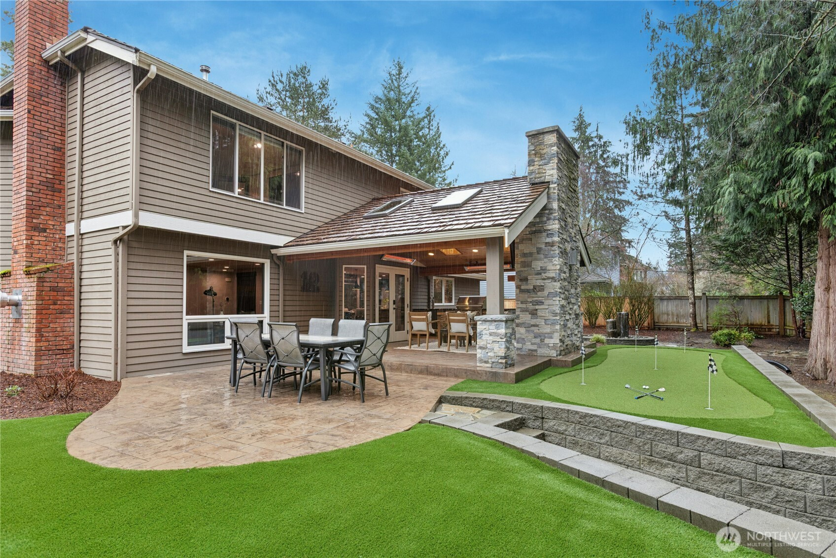 Exceptional design and craftsmanship shine throughout this beautifully updated home, thoughtfully designed for both everyday comfort and effortless entertaining. The heart of the home features a stunning chef’s kitchen with an oversized island, abundant cabinetry, and generous prep space, seamlessly connecting to the main living areas. Just off the kitchen, a spacious walk-in pantry provides excellent storage and organization, with the option to easily serve as wine storage for enthusiasts and collectors. The home offers multiple versatile spaces, including a dedicated home theater wired for sound, a stylish game room, and flexible rooms that can function as home offices, guest spaces, or additional bedrooms. Outdoor living truly sets this home apart. Step outside to a covered patio designed for year-round enjoyment featuring a fireplace, built-in heaters, skylights, and a fully equipped outdoor kitchen with grill and kegerator. The backyard continues to impress with a private putting green, patio seating areas, and a peaceful fountain surrounded by mature landscaping. Completing the home is a spacious three-car garage with custom cabinetry, offering plenty of room for vehicles, hobbies, storage, or even a home gym setup. Beautifully finished and thoughtfully designed inside and out, this home offers an exceptional combination of comfort, functionality, and unforgettable entertaining spaces.