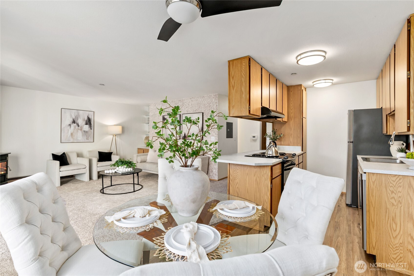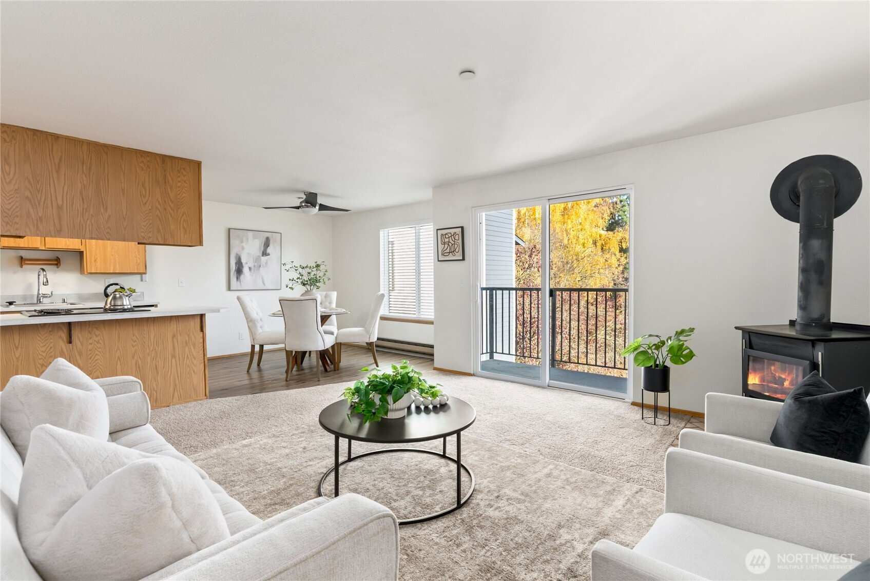 Updated top-floor condo offering natural light, privacy, and a functional layout. The open living area includes a dining nook and a private balcony overlooking the community. Kitchen features ample storage and a convenient breakfast bar. Two spacious bedrooms, including a primary with an attached bath and generous closet space. In-unit laundry and assigned parking included. Community amenities may include clubhouse, sport court, or common areas (buyer to verify). Close to shopping, schools, and transit access for easy commuting. HOA covers exterior maintenance, water, sewer, and common area care.