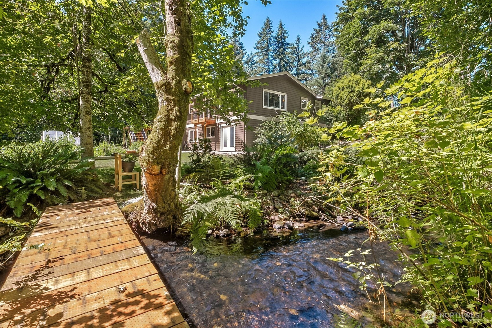 Tucked away on a close-in acre along Little Soos Creek, this Covington oasis offers the rare blend of privacy, beauty, and everyday convenience. Towering Douglas fir, cedar, and hemlock frame a tranquil, forested setting rich with native plantings and abundant wildlife—deer, ducks, herons, otters, and even seasonal salmon runs. The gentle sounds of the creek create a peaceful backdrop to daily life, while the greenhouse and garden invite year-round enjoyment. The home reflects the enduring quality of its era, with classic Redwood siding and hardwood floors throughout the main level, thoughtfully refreshed with a 2023 remodel. The updated kitchen and baths, fresh interior paint, and new carpet and LVP flooring on the lower level offer a clean, modern feel while honoring its original character. Generous windows bring in natural light and showcase the surrounding greenery from nearly every room. Downstairs, a fully equipped apartment provides exceptional flexibility—ideal for multigenerational living, an ADU, rental income, or a home-based business. Additional highlights include covered RV parking with hookups, easily accommodating up to four vehicles or recreational toys. All of this, just minutes to Hwy 18, major freeways, shopping, dining, and everyday essentials—yet it feels a world away. Even local favorites, schools, and neighborhood spots are just a short stroll from your doorstep, offering the best of both convenience and quiet retreat.