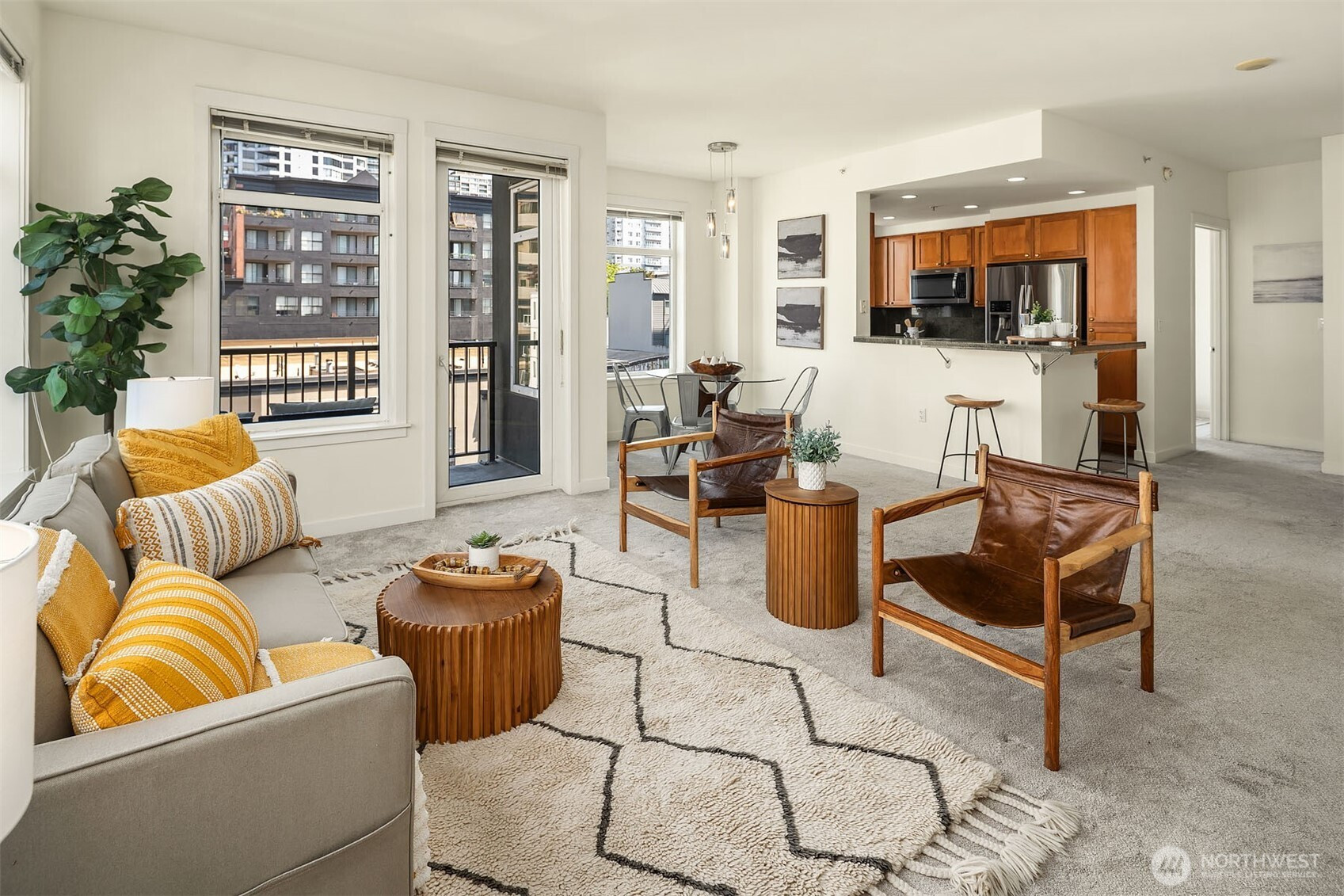 Luxury Living at The Vine – Just Two Blocks Above Seattle’s Revitalized Waterfront Experience the best of city living in this spacious 2-bedroom, 1.75-bath condo with soaring ceilings, walls of windows, and a private balcony. The open-concept layout and modern kitchen with bar seating make it ideal for both everyday living and entertaining. The Vine offers resort-style amenities including expansive owners’ lounge with stunning views, rooftop deck & guest suite overlooking Elliott Bay, well-appointed fitness center, 24-hour concierge service, EV charging stations, and car wash area. With an incredible Walk Score, you’re moments from the Elliott Bay Trail, Pike Place Market, transit, and more.