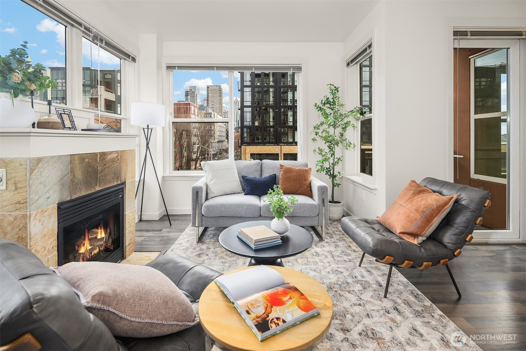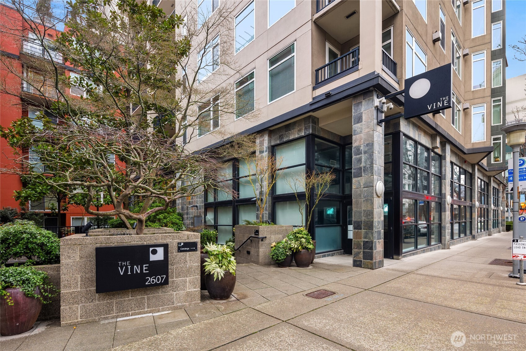 This modern 2-bedroom, 1.5-bath home at the The Vine Condominiums is situated on the northeast corner of the 5th floor and offers charming downtown city views throughout. Spacious and thoughtfully designed, the well-appointed floor plan features a formal entryway; a gourmet kitchen with maple cabinetry, granite tile countertops, and stainless steel appliances; a designated dining area; and an open living room with a gas fireplace, wall-to-wall windows, and a private covered balcony. The home also includes a generously sized primary bedroom with a walk-in closet, a versatile second bedroom, and a full bathroom with tub, and convenient powder room. Additional highlights include plush carpet, high ceilings, fresh paint throughout, updated LVP flooring, abundant year-round natural light, and ample closet space. The Vine Condominiums is located in the heart of Belltown, within walking distance of top restaurants, shops, and entertainment, as well as iconic destinations like Pike Place Market, the Olympic Sculpture Park, and Climate Pledge. Residents enjoy 24-hour concierge service, a rooftop deck with stunning city and Sound views, a fully equipped resident lounge, furnished guest suites, a large fitness center, and secure underground parking with car wash and storage.