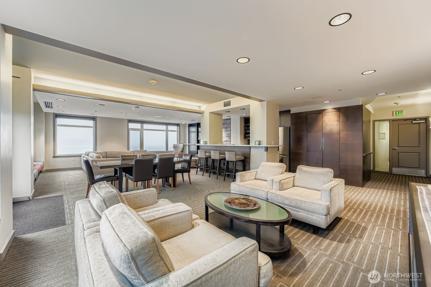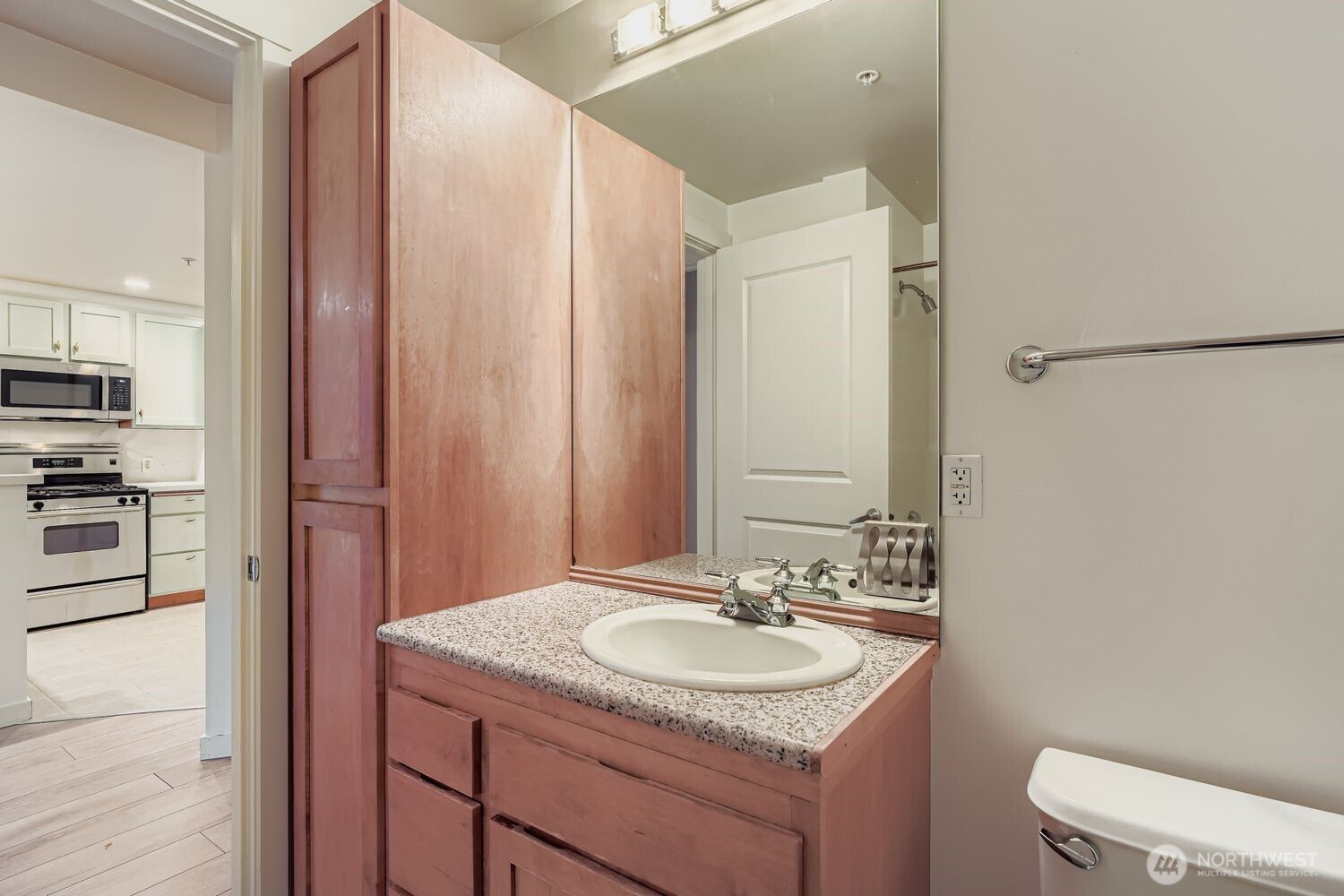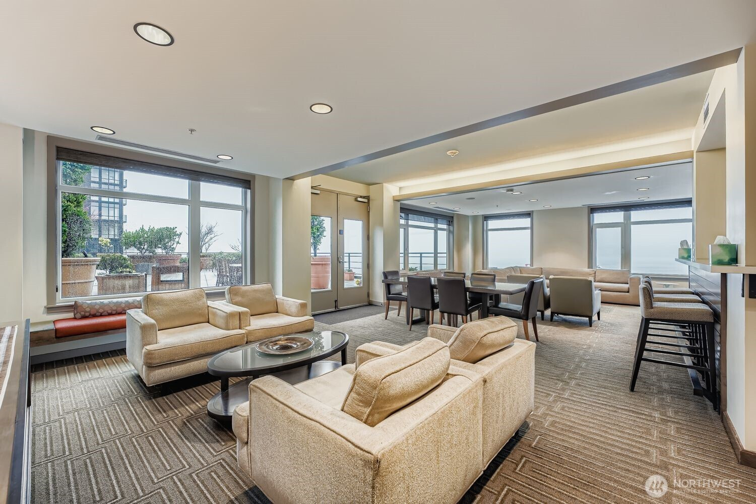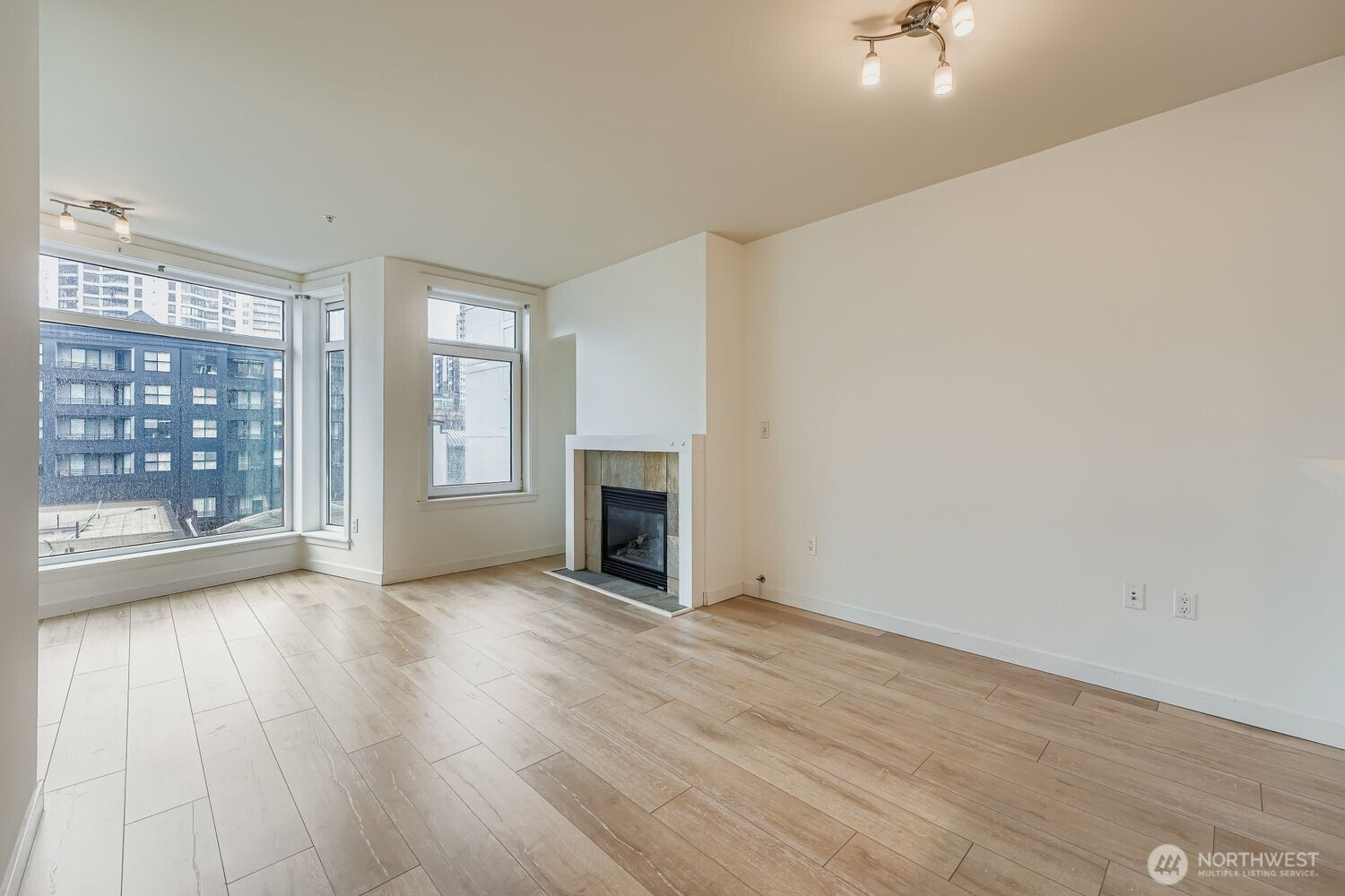 Chic 1 Bedroom updated & ready to move in with new LVP and paint. Kitchen has new granite countertops & the stainless steel appliances include gas range. Living area W/ Space Needle view has cozy gas Fireplace & opens to privatet balcony. Dining nook & seperate laundry/storage room make this condo very livable. Hotel style amenities incl 24 hr concierge, grand party room, amazing terrace with Sound, Mountain & city views. Steps to parks, Seattle Center, restaurants & all that urban lifestyle offers.