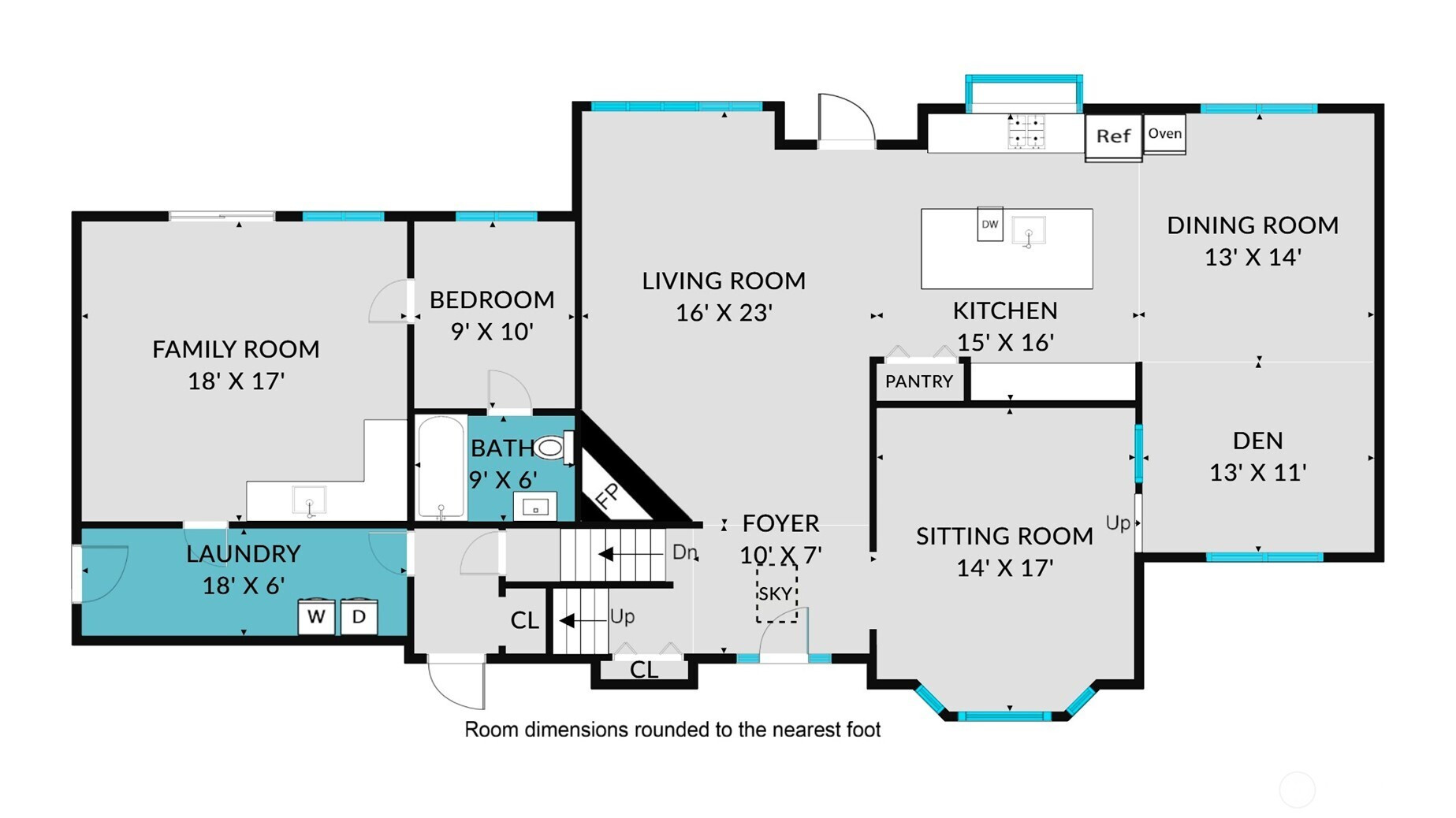 Second Kitchen, Bath Off Primary, Ceiling Fan(s), Dbl Pane/Storm Window, Dining Room, Fireplace, Sky