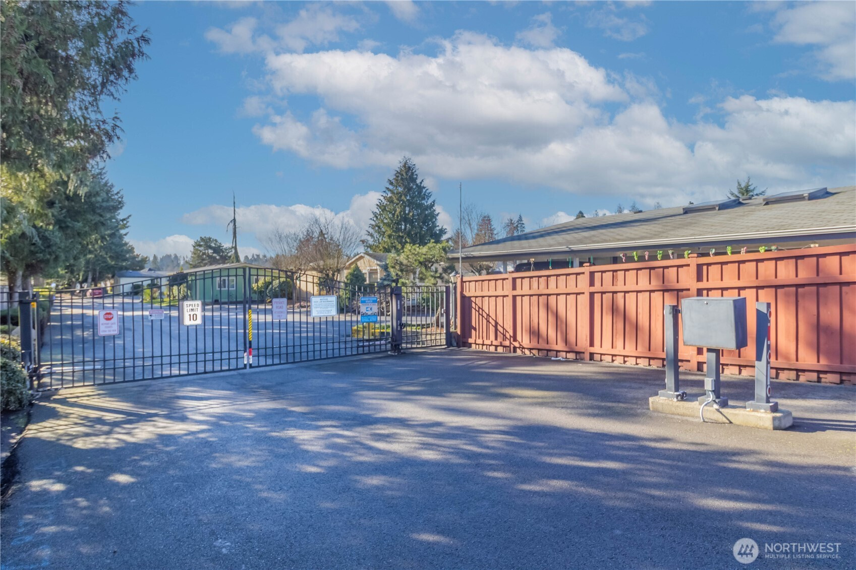 Welcome to Parkwood Lane, a gated 55+ community in the heart of Federal Way. This beautifully maintained 1998 home offers 1,120 sq ft of light-filled living with fresh interior paint, new carpet, new LVP flooring, A/C, and recent releveling for peace of mind. The vaulted living and dining areas feel open and airy, highlighted by bay windows and abundant natural light. The spacious kitchen features generous cabinet and counter space plus a window over the sink. A large utility room with storage and washer/dryer adds everyday convenience. Down the hall you’ll find a full guest bath, second bedroom, and a primary suite with walk-in closet and private bath. Covered carport with attached storage closet. Low-maintenance exterior with no yard work. Enjoy the community clubhouse, gazebo, BBQ area, and green space for gatherings and activities. Comfortable, easy living awaits!
