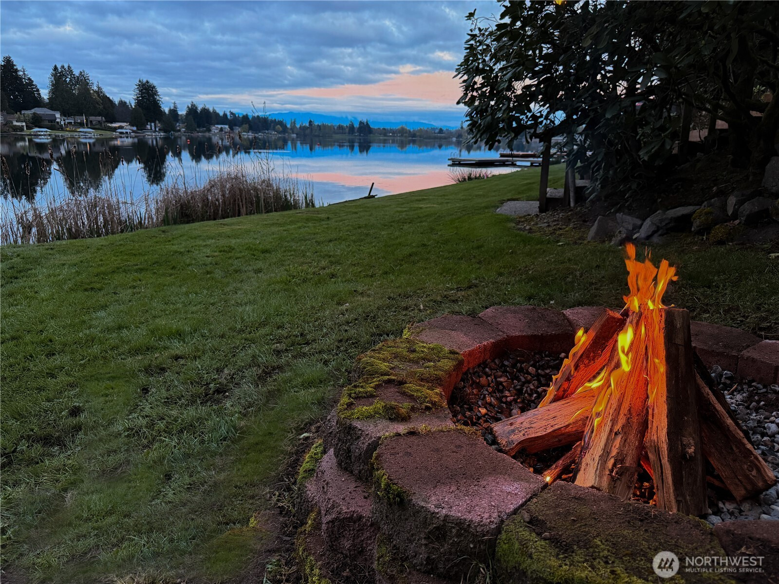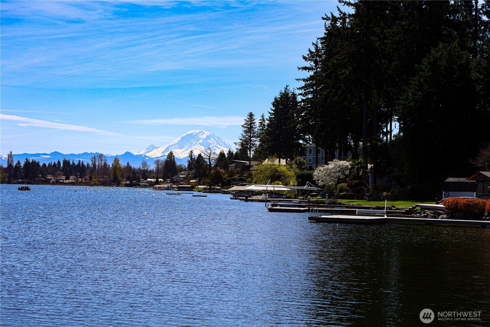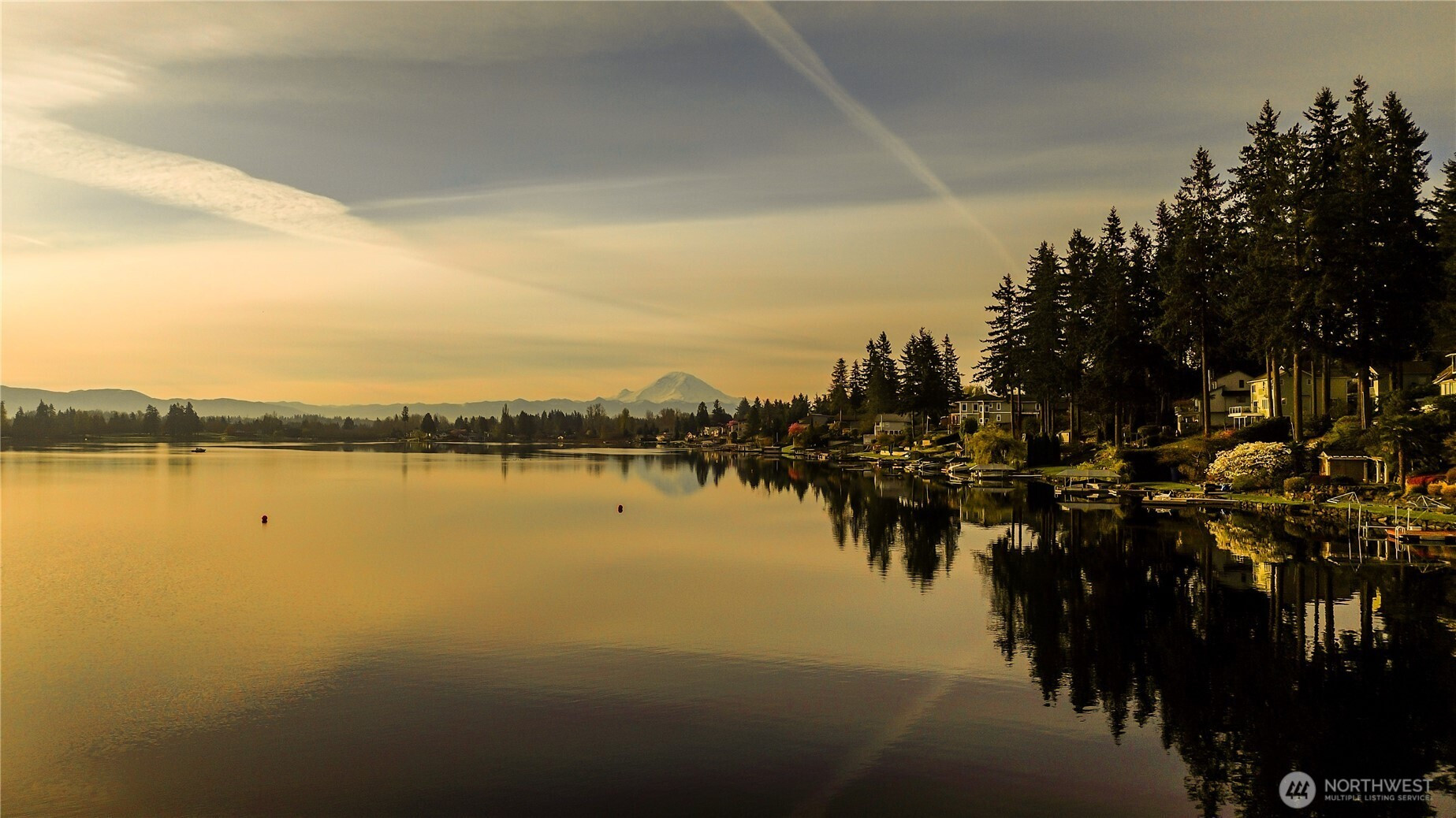 Welcome to stunning Lake Meridian, where 100' of waterfront & breathtaking views of Mt. Rainier offer an extraordinary lifestyle. Enjoy motorized boating, kayaking, fishing & abundant wildlife in your backyard. Entertaining is a dream with this property. A flat yard at lake level with both a deck, dock, & fire pit is perfect for swimming & launching watercraft, a deck off the main living room frames stunning views & visiting eagles, a covered patio below offers shelter when needed & the hot tub is pure magic day or night. Step inside to a breathtaking great room w/vaulted ceilings, tons of windows & warm wood accents. The kitchen shines with rich American cherry cabinets, quartz countertops & stainless steel appliances. Enjoy your primary suite on the main, fresh interior paint, new carpet & a concrete tile roof. The basement mother-in-law suite features a kitchenette, two potential bedrooms, a full bathroom & its own entrance, ideal for rental income. An additional 740 sf unfinished workshop space offers exciting potential (3,770 sf total). This sale includes two parcels & a two-car garage w/a large storage area. STRs are permitted, making this an exceptional investment opportunity! Centrally located between Seattle & Tacoma with quick access to Hwy 18; five blocks from restaurants, shops & fitness centers; minutes from Meridian Valley Country Club & minutes to Soos Creek Park & Trail for dog walking & biking. Don't miss this rare waterfront gem!