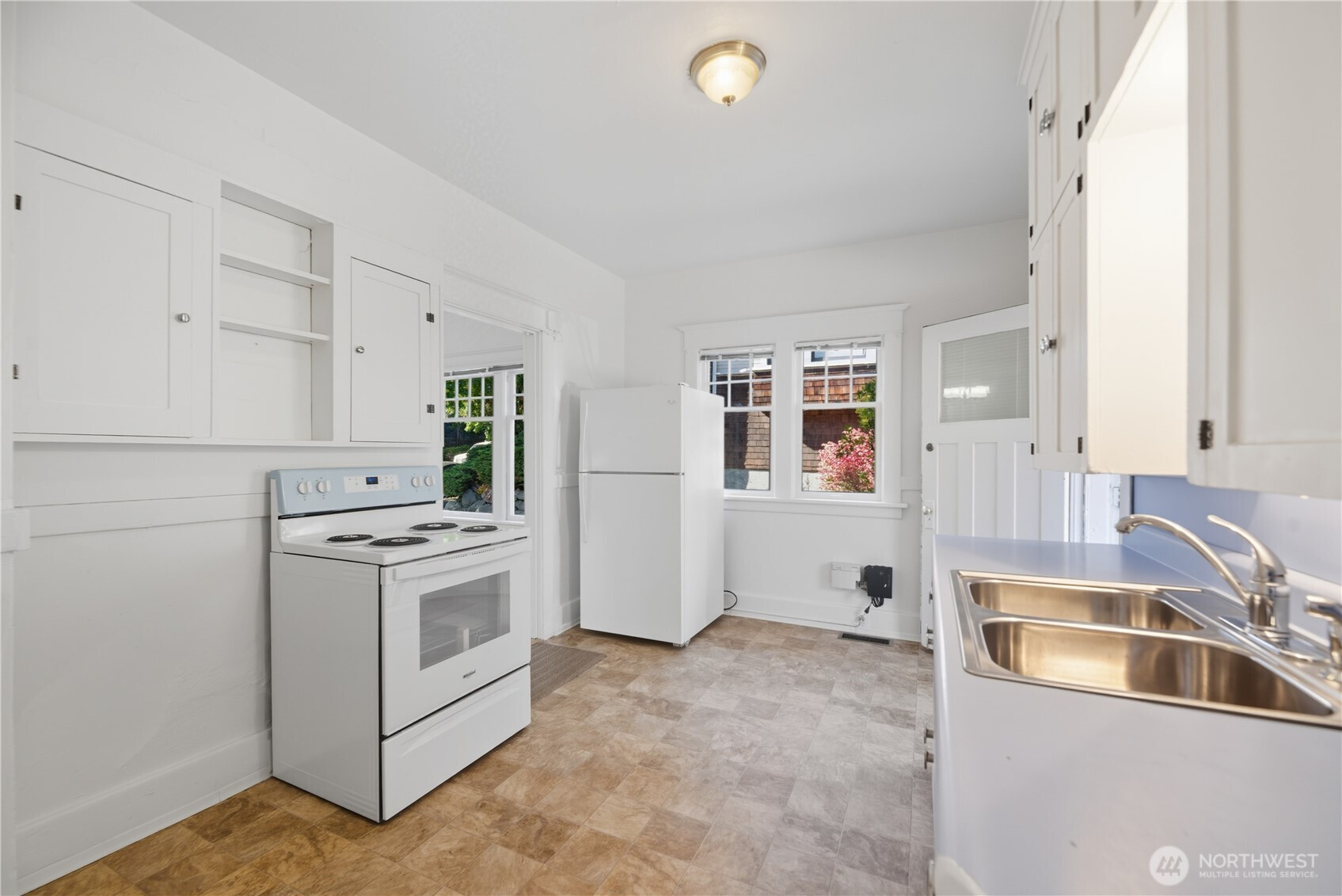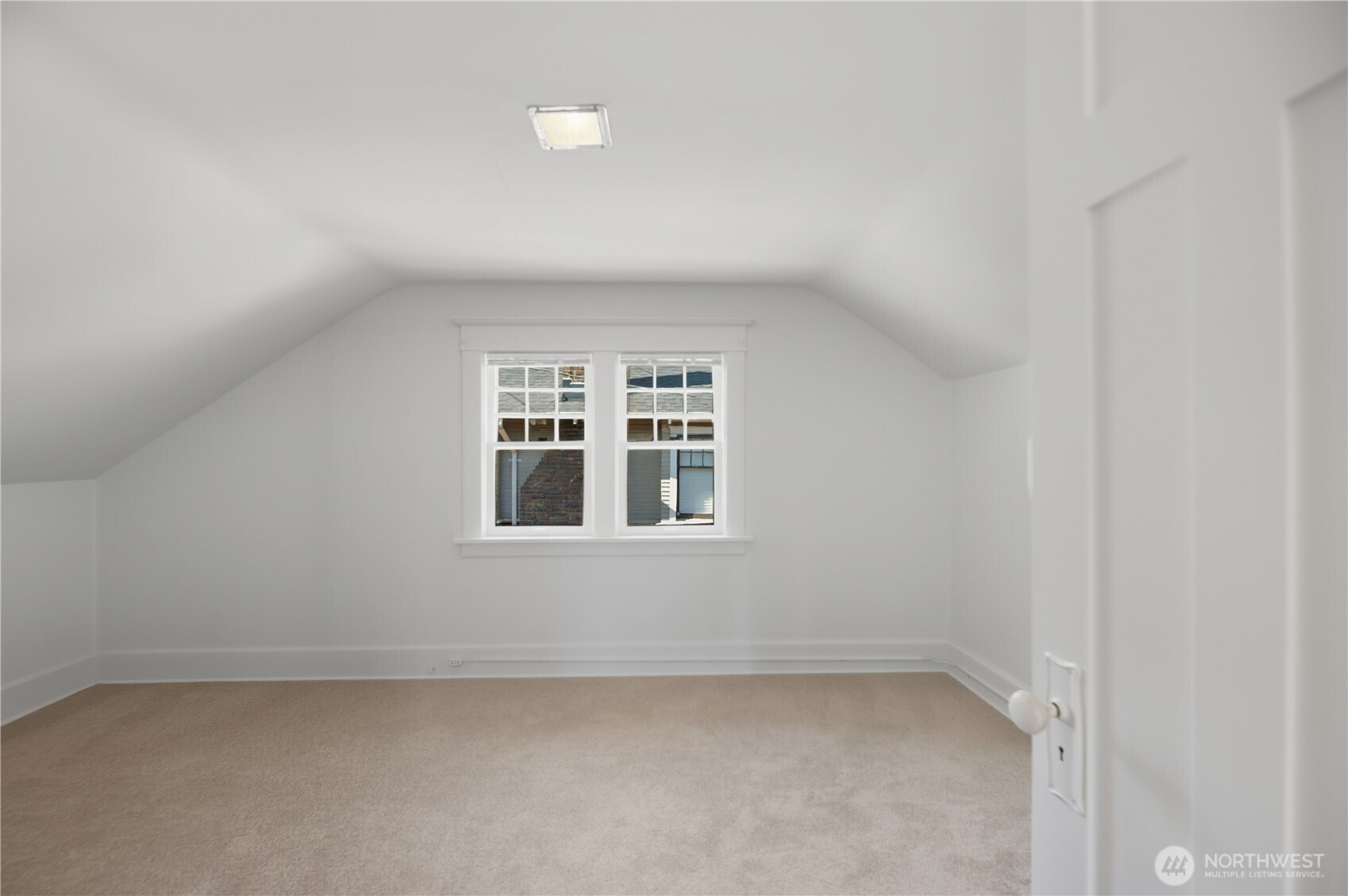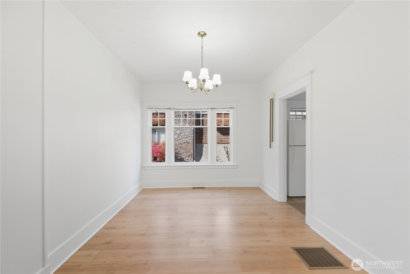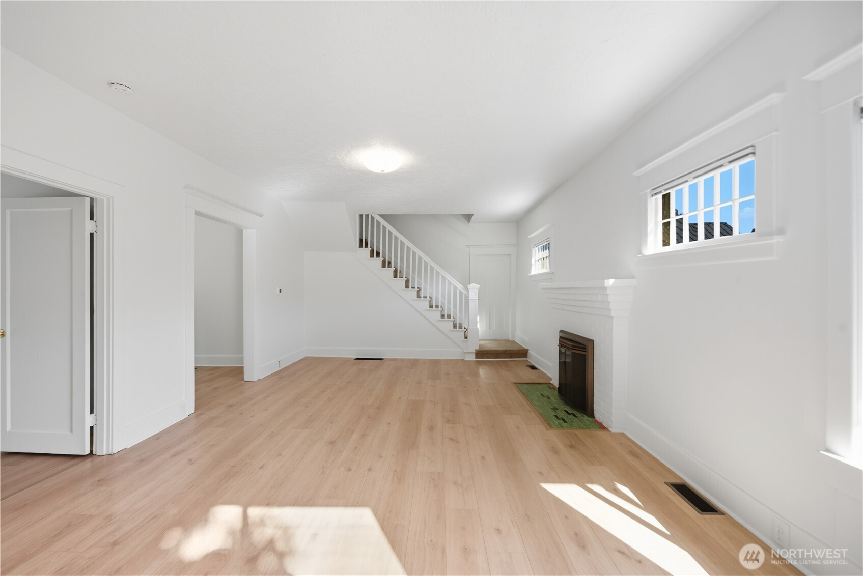 Light and bright charming craftsman home in quiet neighborhood with inviting front porch. Updated flooring, interior & exterior paint, newer roof. Generous living room with high ceilings & cozy wood-burning fireplace, dining room & Primary Bedroom with 1/2 bath. Large kitchen area with breakfast nook. Access to basement with one non-conforming finished bedroom, plenty of storage space & laundry. Newer forced air furnace. Upper floor features two bedrooms with vaulted ceilings & full-bath. Level yard with off-street parking for two cars (add a garage and ADU on top!), back porch & backyard area for entertaining with alley access. Easy walk to Madrona, Madison Valley, restaurants, shops, bus line & parks. Owned by family since 1954!