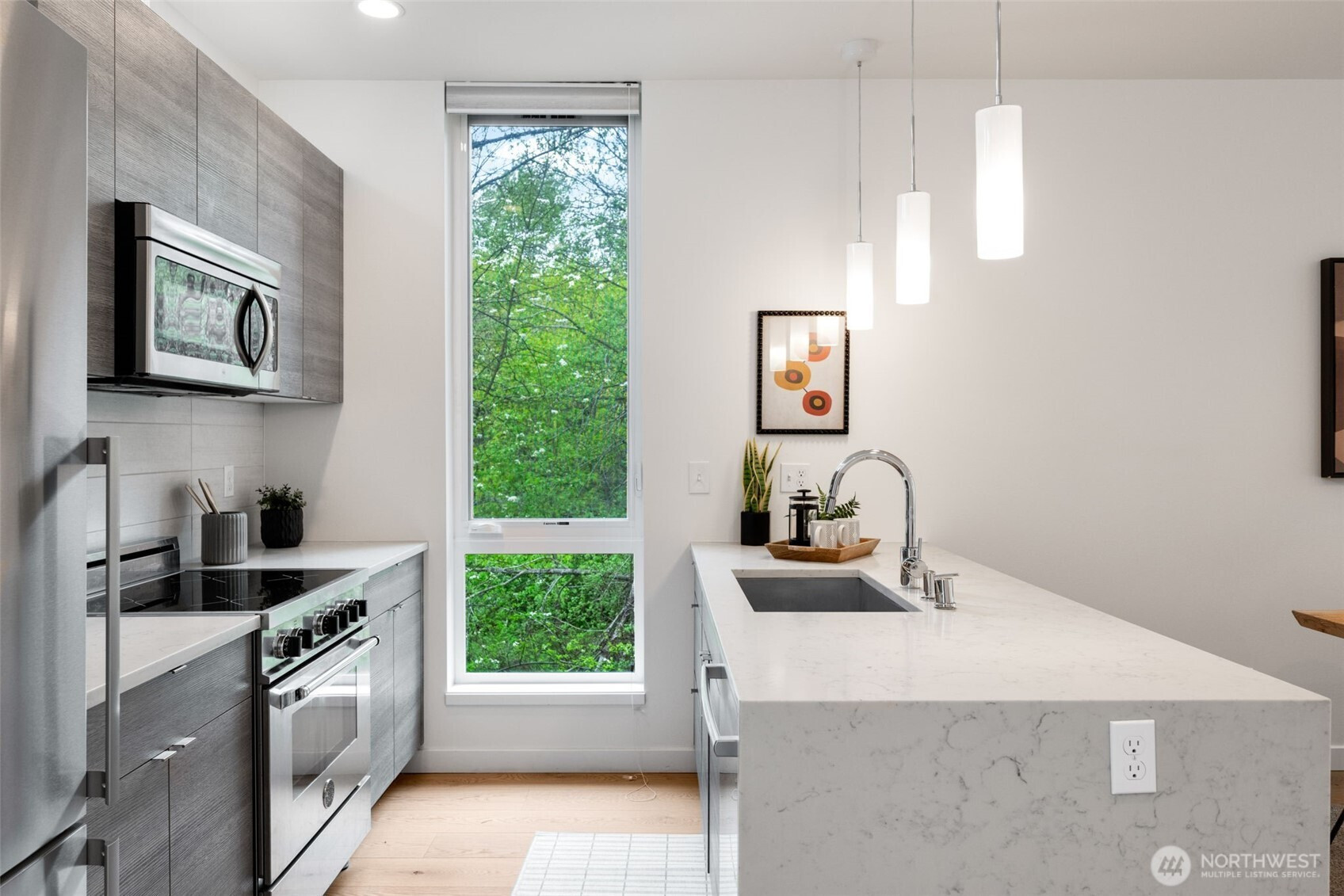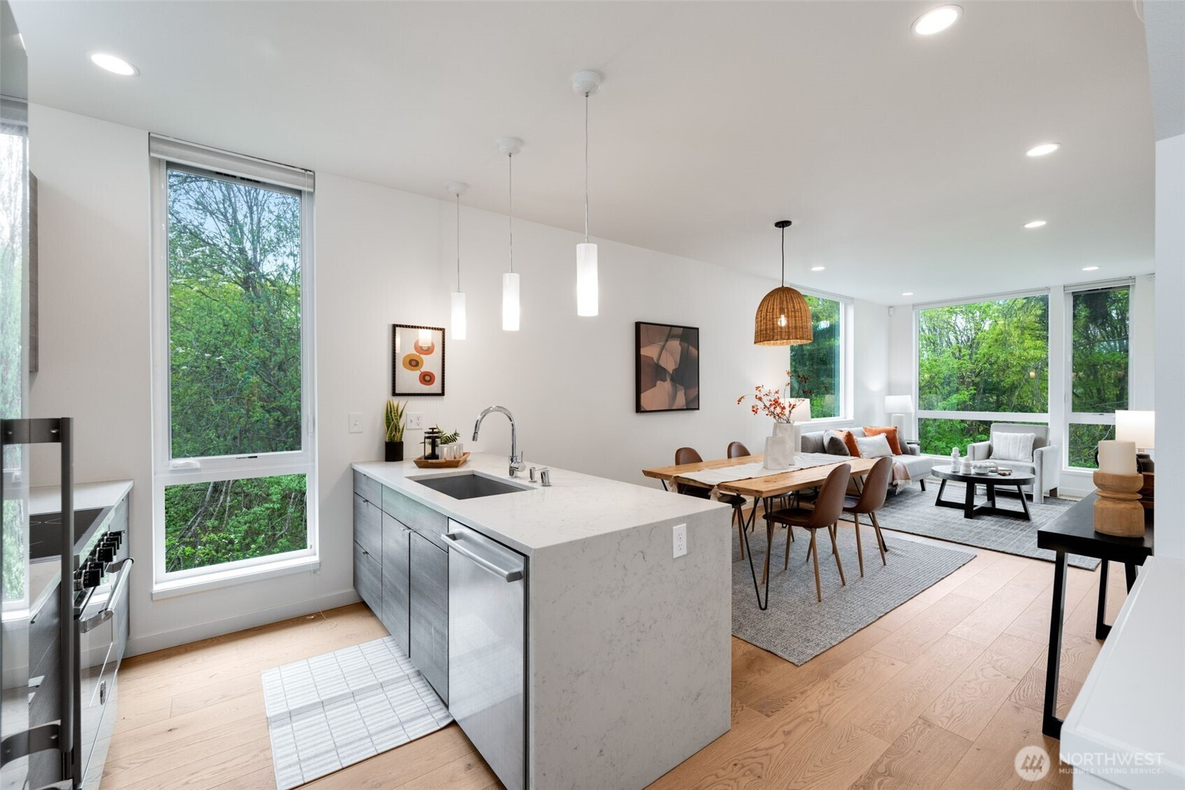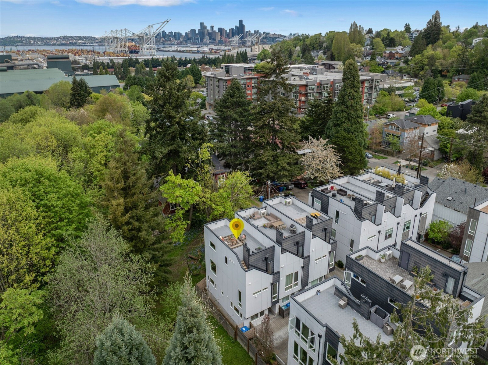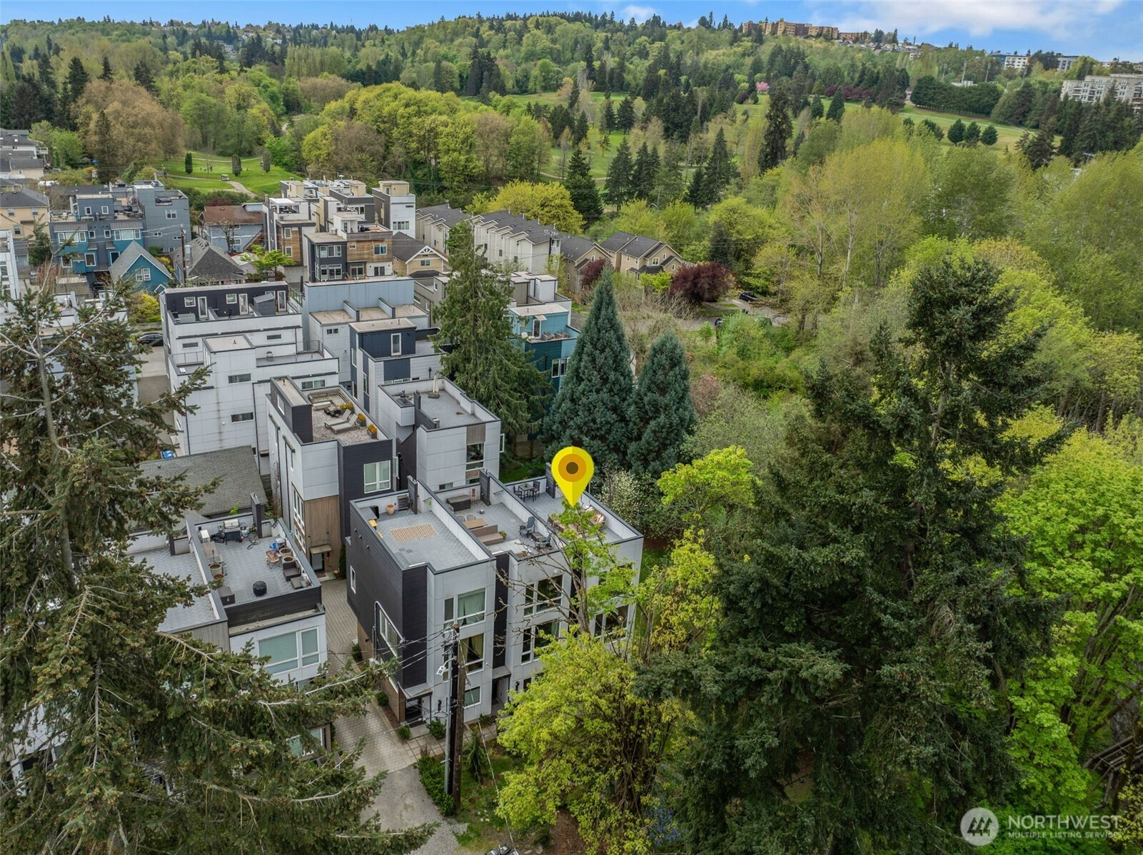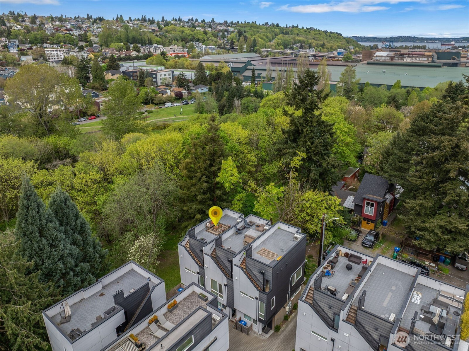 Imagine waking up to the sounds of nature while living in a modern townhome built in 2018. This nearly new end-unit townhome is tucked away along the surreal Longfellow Creek Greenspace, giving you a private retreat in Delridge that is still minutes from everything. The main level boasts an open-concept layout designed for entertaining, featuring a gourmet kitchen, room for a dining table, and a light-filled living room overlooking the greenspace. Retreat to the top floor, where you'll find a serene primary suite. The versatile lower level has two bedrooms, perfect for a home office, and provides direct access to your parking. Summer in Seattle is best spent on your private rooftop deck with sweeping views, kept cool by AC. Have a dog? A small fenced yard makes a perfect dog run. No HOA dues. Light Rail coming in 2032, you’ll be a quarter of a mile away!