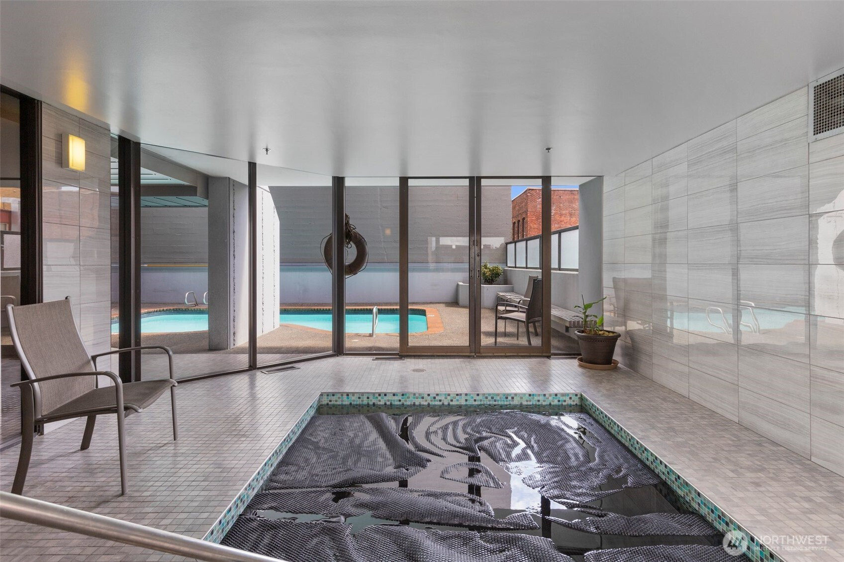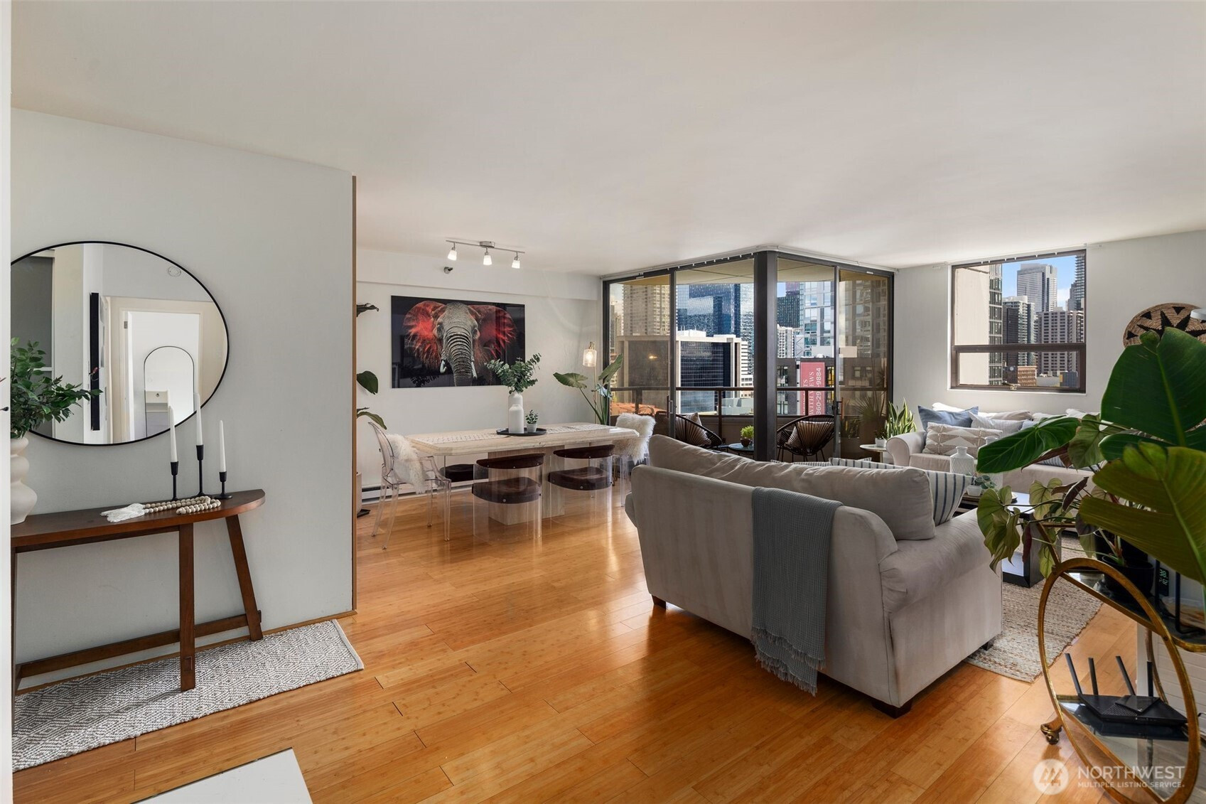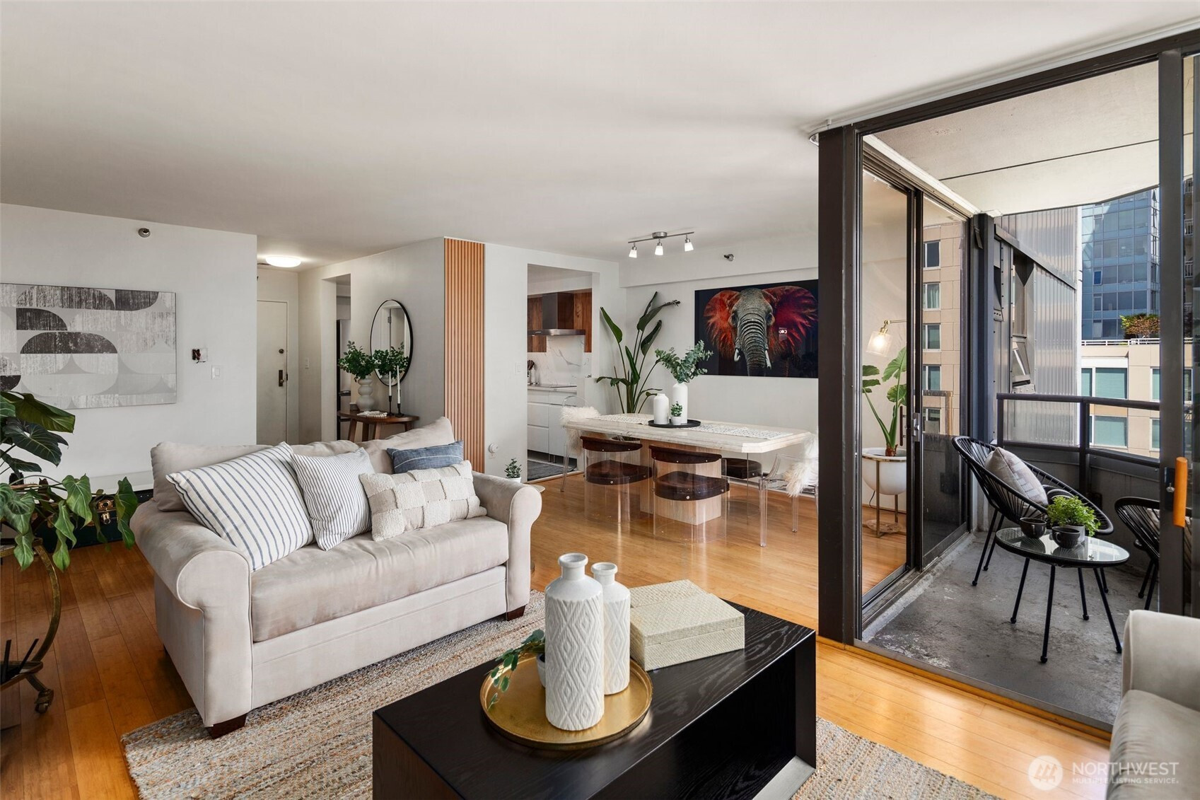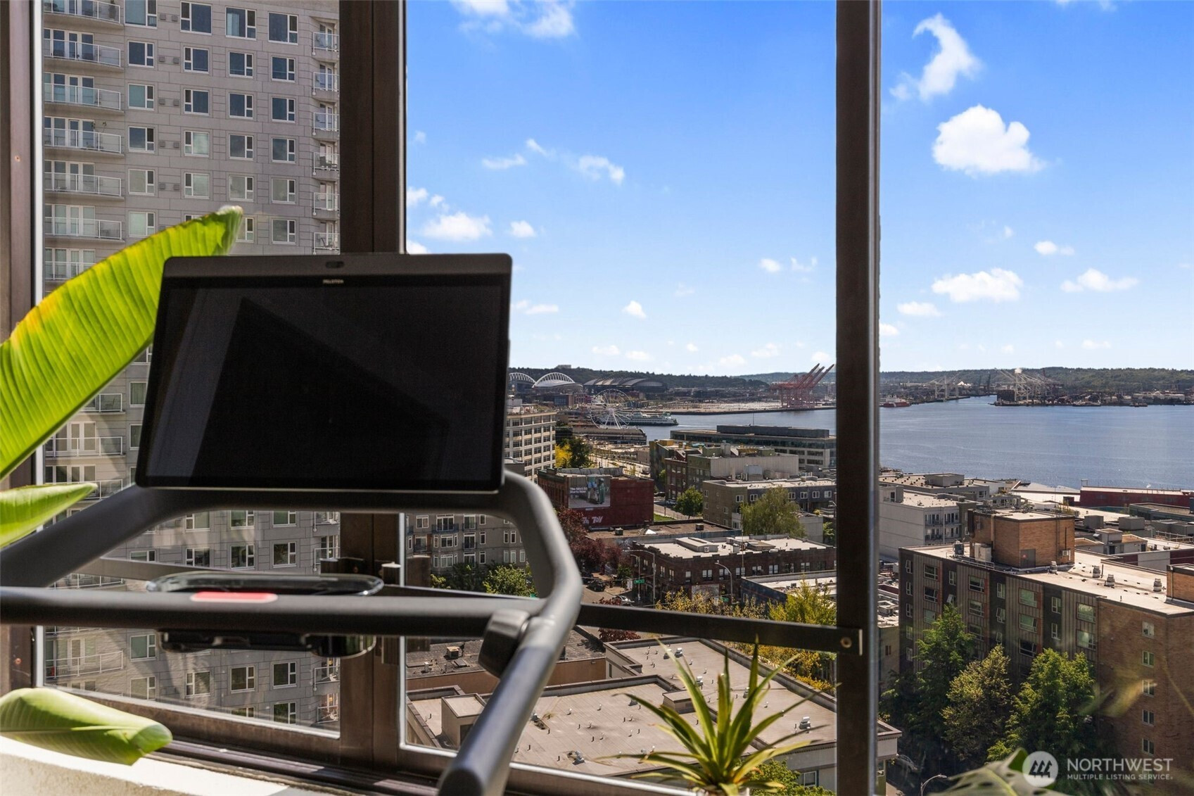 Panoramic views of the Puget Sound, Pier 51 and Mt. Rainier from this 16th floor 2 bed, 2 bath home that showcases the best of city living at Harbor Heights! Sun-filled, updated kitchen w/new appliances, counters, recessed lights, laundry room with extra storage, bamboo floors throughout. Primary suite features a custom walk-in closet organization system connecting to enclosed SW facing sunroom showcasing the stunning views. A steel and concrete building that includes fitness room, outdoor pool, spa/sauna, on-site manager, as well as party room, spectacular landscaped view rooftop garden with seating and BBQs to entertain. . One assigned parking spot. Well managed HOA.