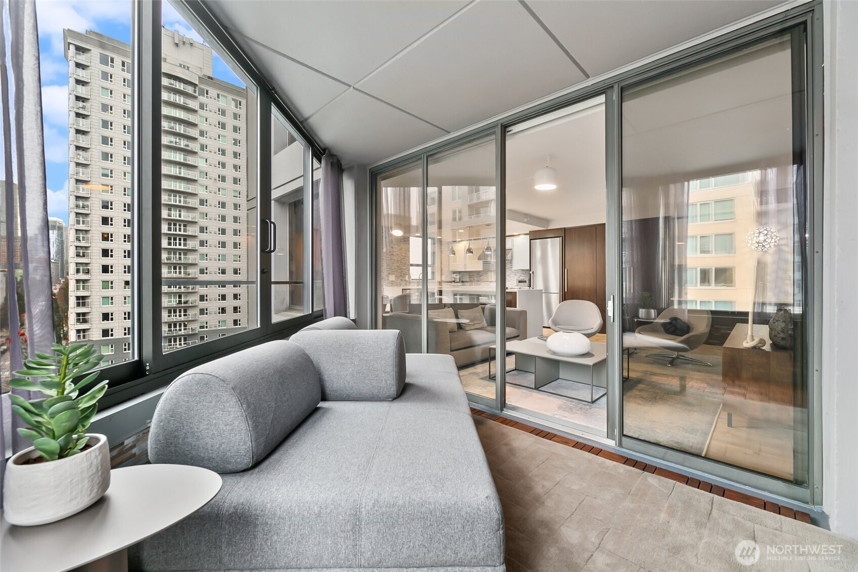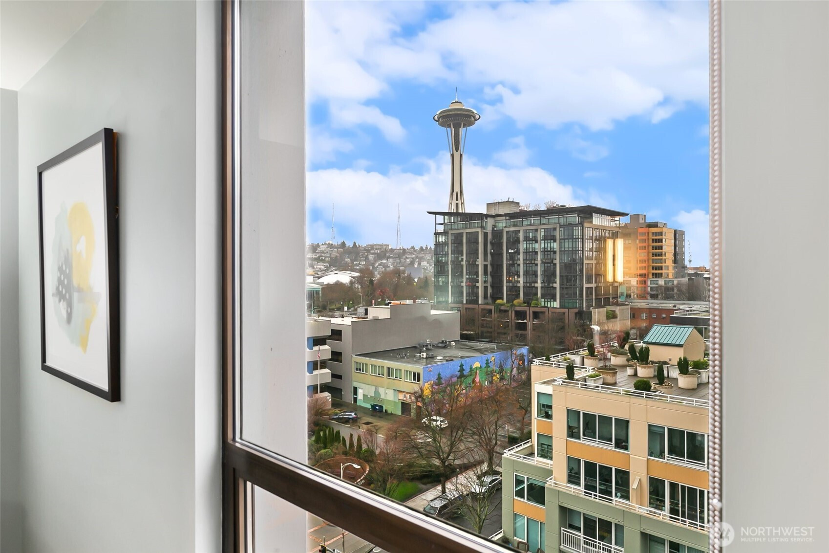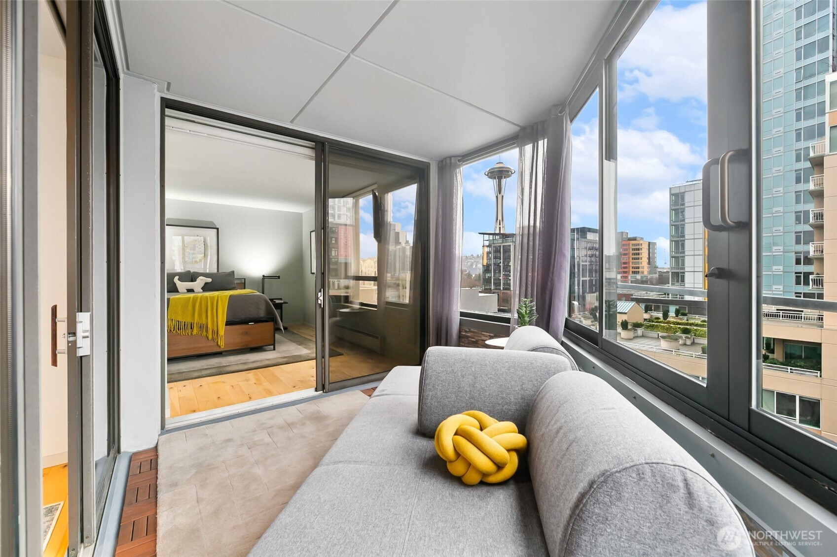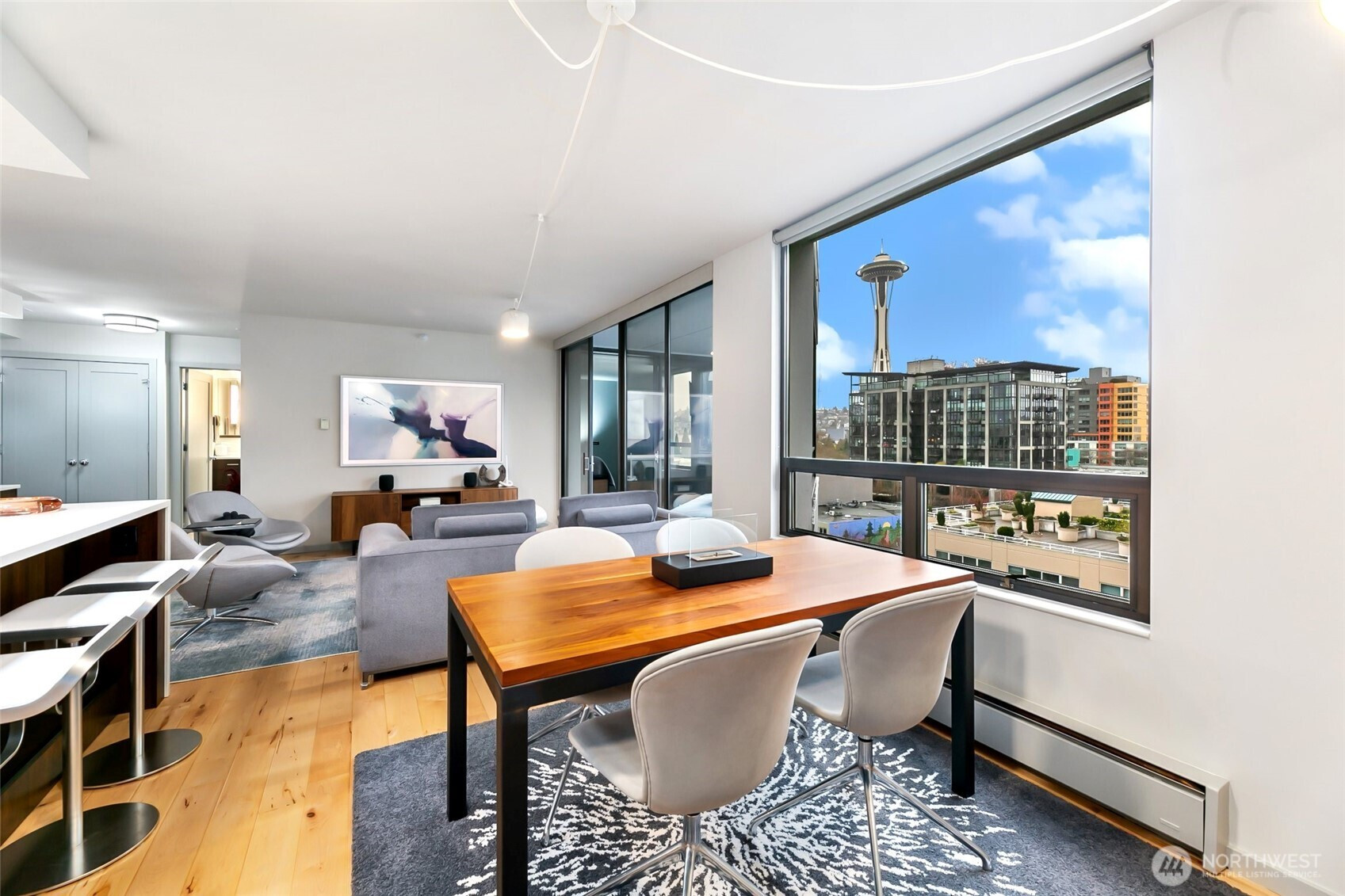 Step into this magazine-worthy urban oasis where thoughtful design and high-end finishes come together in perfect harmony. This beautifully reimagined one-bedroom condo has undergone a complete studs-out renovation, with over $150K invested to deliver a refined blend of modern elegance, comfort, and everyday functionality. The open-concept living space is filled with natural light and showcases iconic Space Needle views, creating an inspiring backdrop for daily living and entertaining. An enclosed patio extends the living area and offers a flexible retreat, while a dedicated area for a home office supports today’s lifestyle needs. Custom California Closets throughout the residence provide exceptional organization and storage. The spa-like bathroom features a heated floor accented by Ann Sacks penny tile, adding a luxurious touch to your routine. Residents enjoy a host of amenities including secure entry, garage parking, an outdoor pool, sauna, hot tub, fitness center, and a stunning rooftop deck with sweeping city and water views. Ideally located near acclaimed dining, shopping, and entertainment, this home delivers both style and convenience in one exceptional offering. A true must-see.
