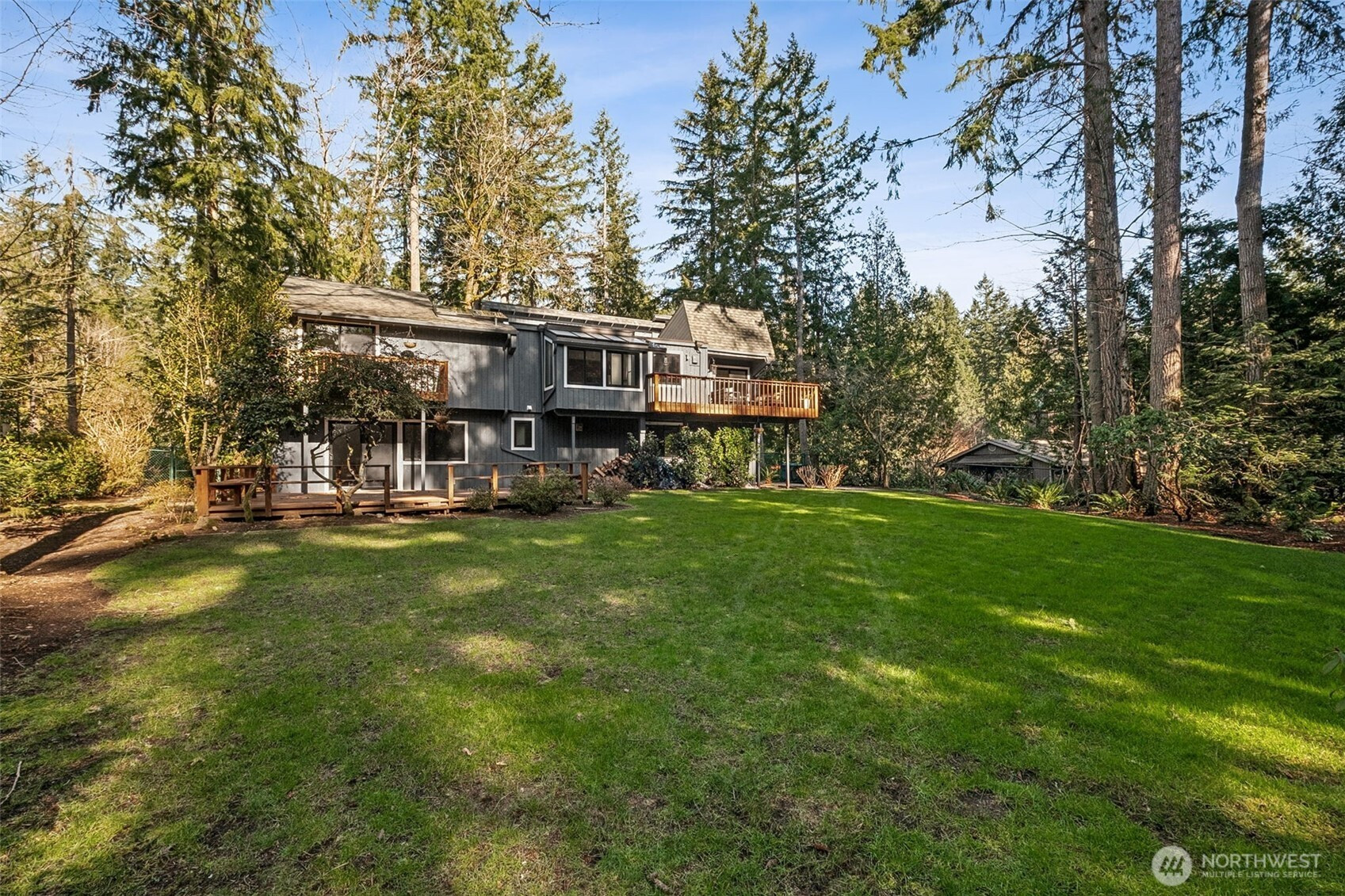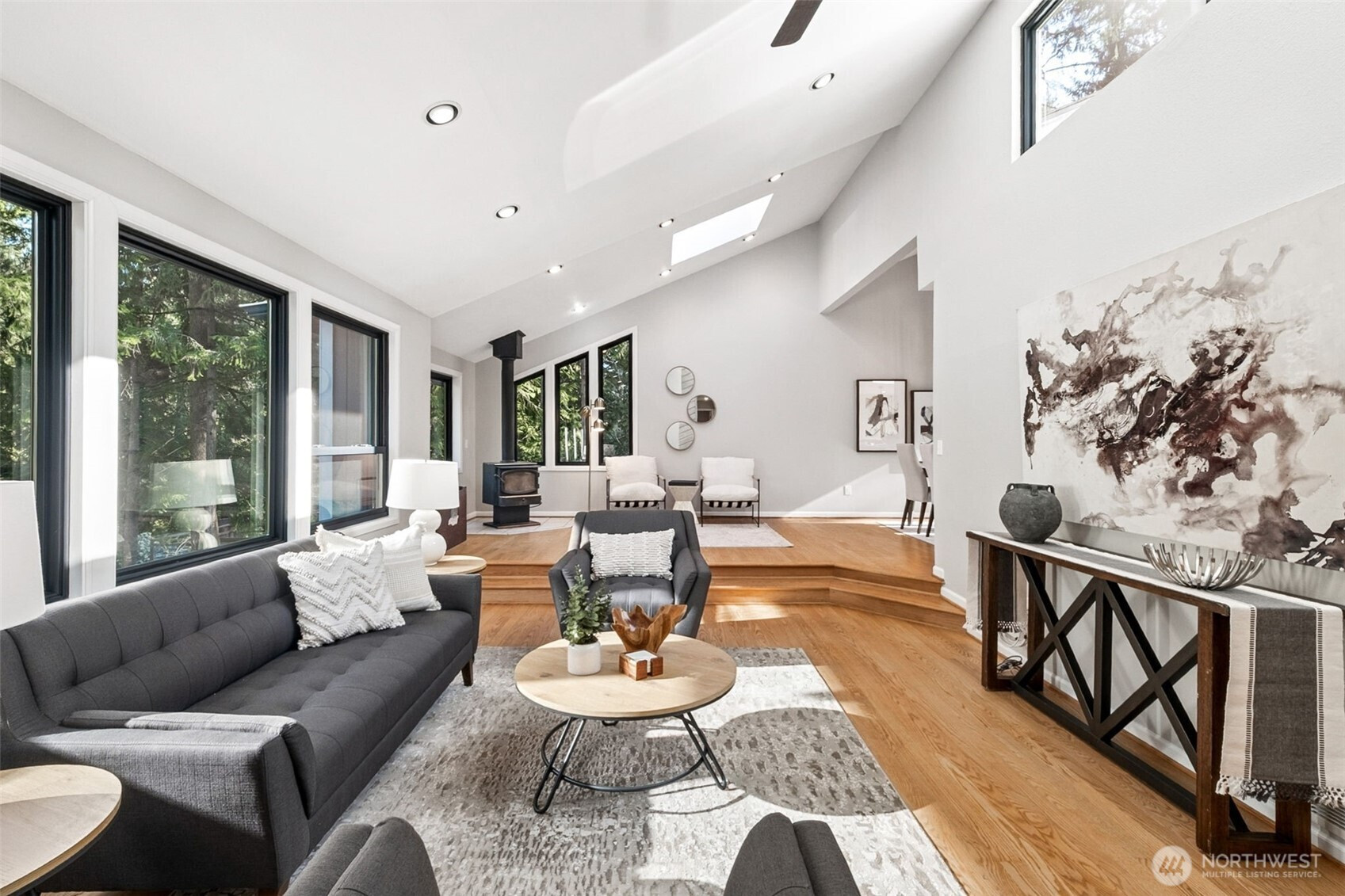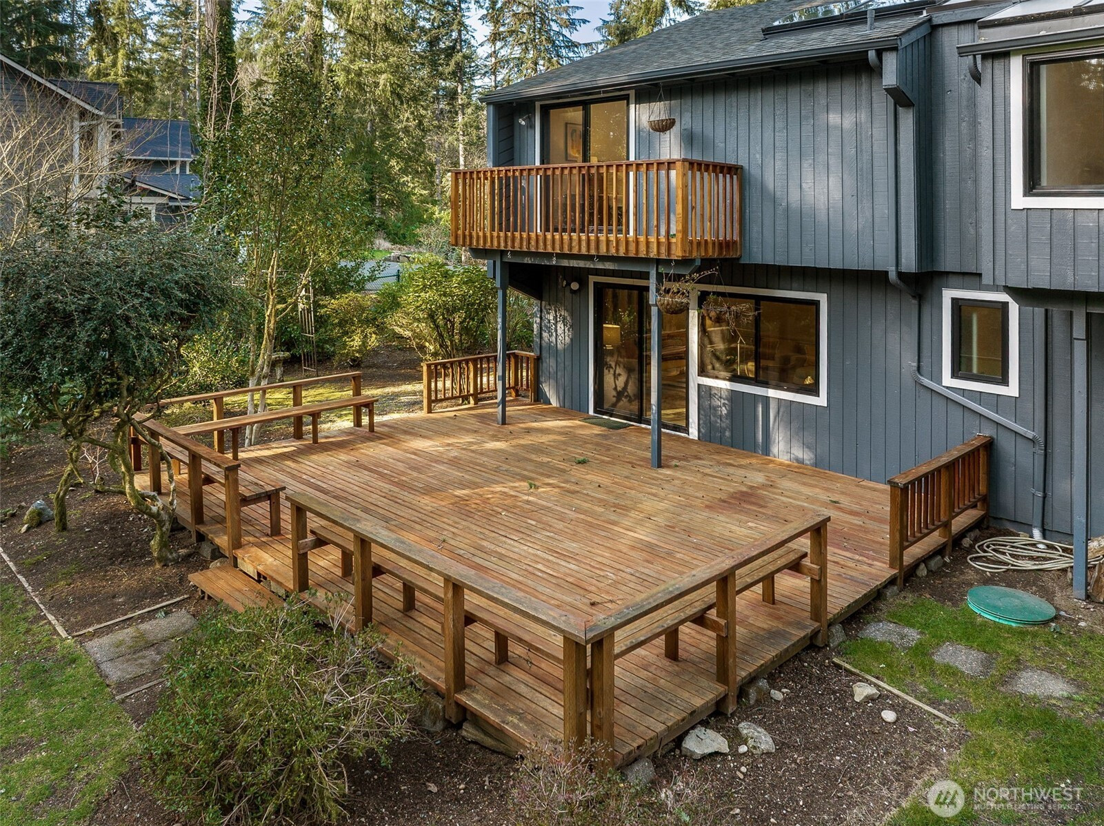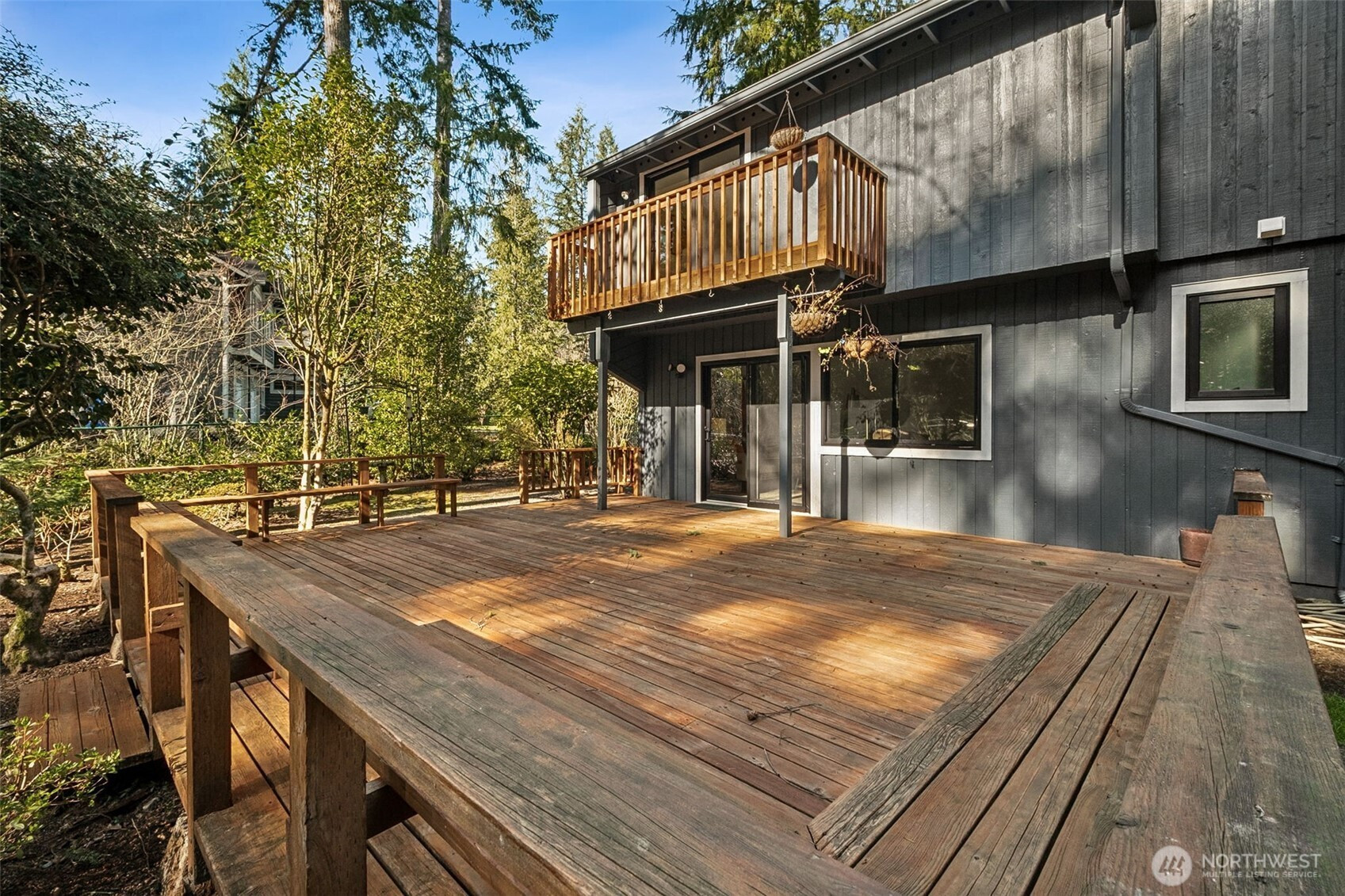 Tucked down a private cul-de-sac in the desired south Issaquah neighborhood of Mirrormont, this sun-drenched contemporary retreat offers the rare combination of elevation, privacy & a beautifully flat yard that truly sets it apart. Perched up above for added light & territorial feel, yet surrounded by usable, level grounds, this is a lifestyle opportunity buyers wait for. Step inside & immediately experience the drama of a soaring double-height entry & vaulted ceilings that carry through most of the main level. Large windows + clerestory as well, flood the home w/natural light. Interior feels both open & connected to the surrounding greenery. The remodeled kitchen is a true centerpiece, featuring rich cherry cabinetry & an entire wall of pantry-style storage to meet every organizational need, along w/peninsula island offering casual breakfast seating. Additional space for breakfast table, reading nook, or relaxed lounge area, perfect for morning coffee or evening wine. Main-level primary suite is a peaceful retreat w/vaulted ceiling & expansive windows + remodeled bath w/spacious walk-in shower. 2 additional bdrms—or home office option. The LL expands the home’s functionality w/generous family room perfect for media, play, or gathering + huge walk out deck! 2 additional bdrms or flex rooms + 3/4 bath enhances potential for guest or MIL living. Flat lot has room to run, garden, entertain, & play, w/athletic court & storage shed. Mirrormont has optional community amenities!