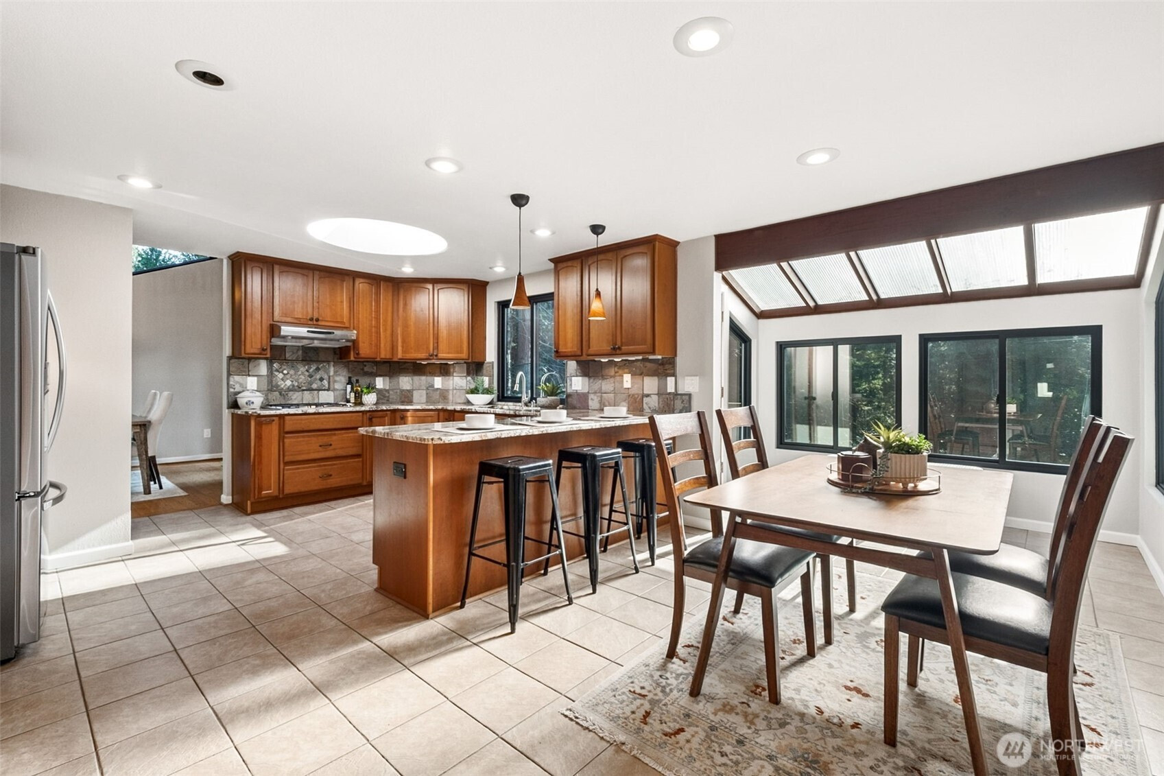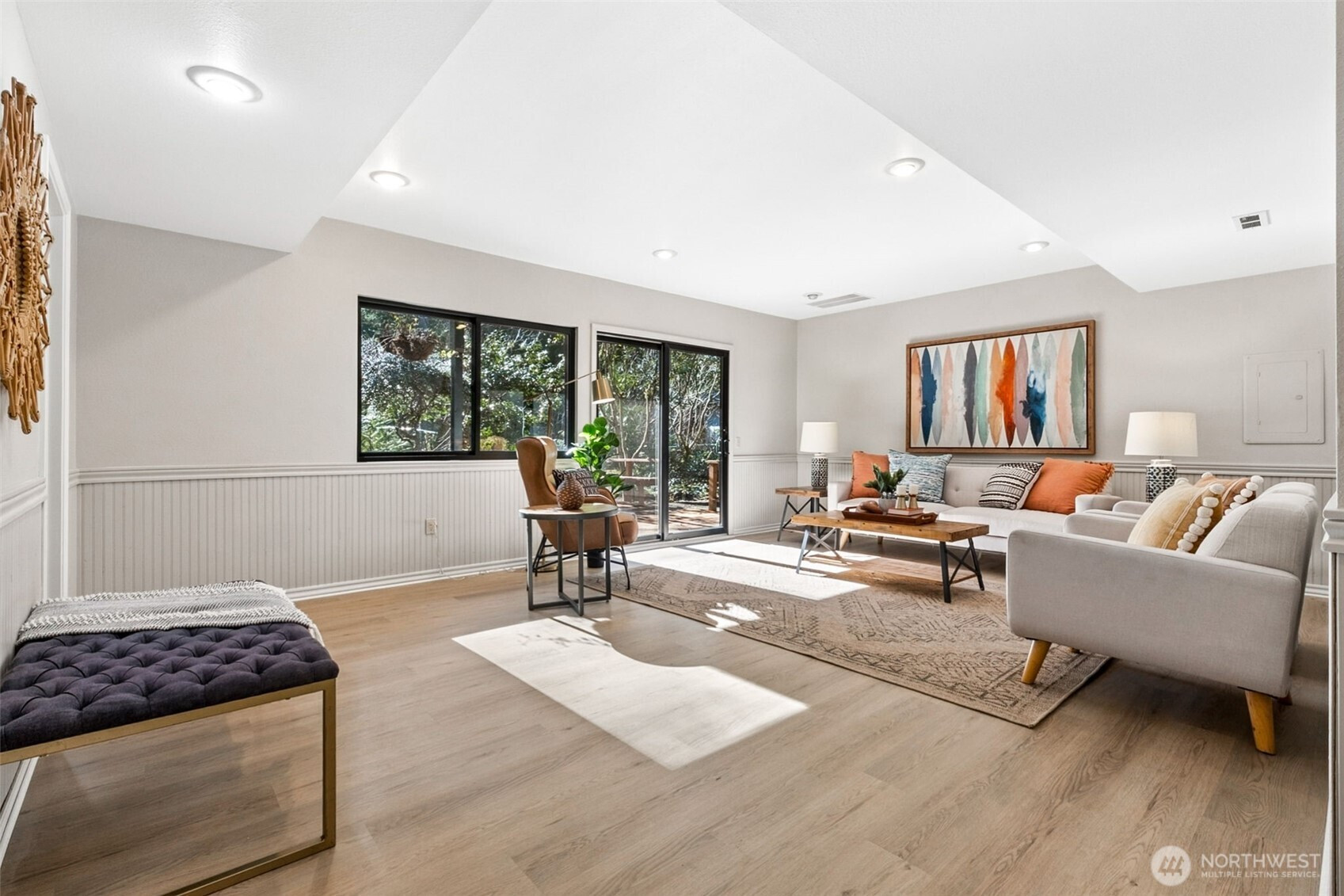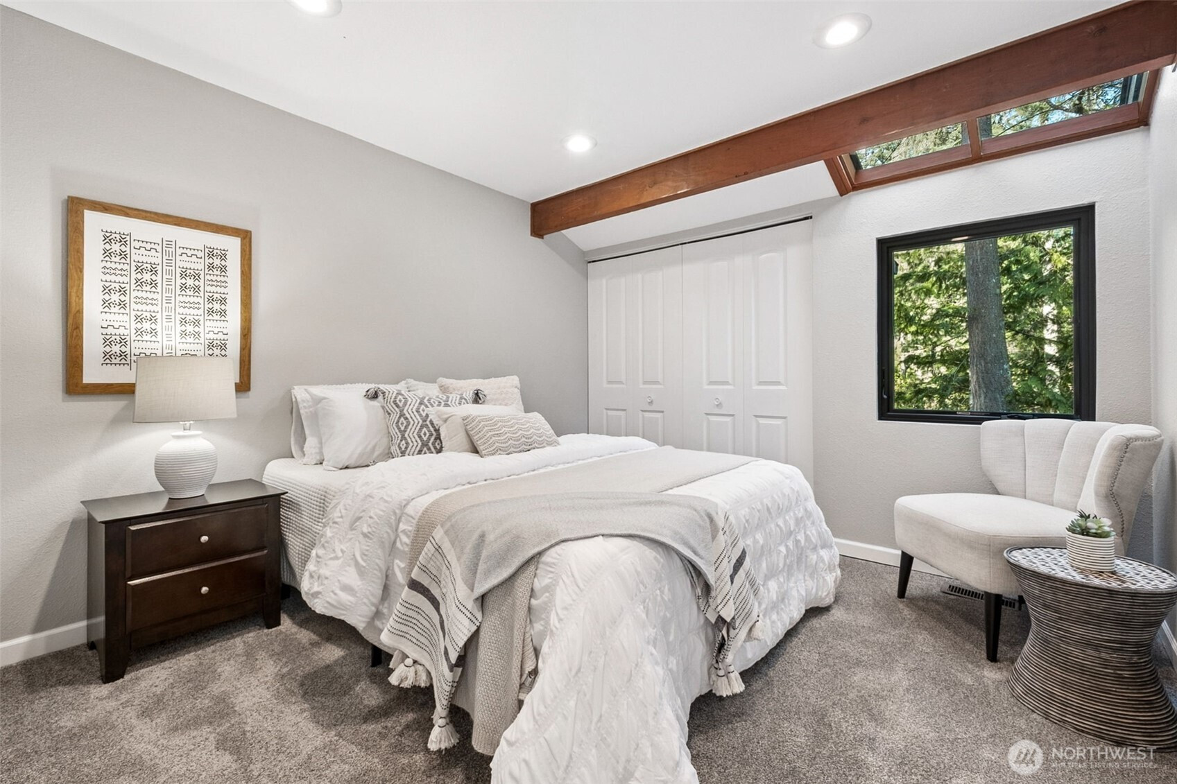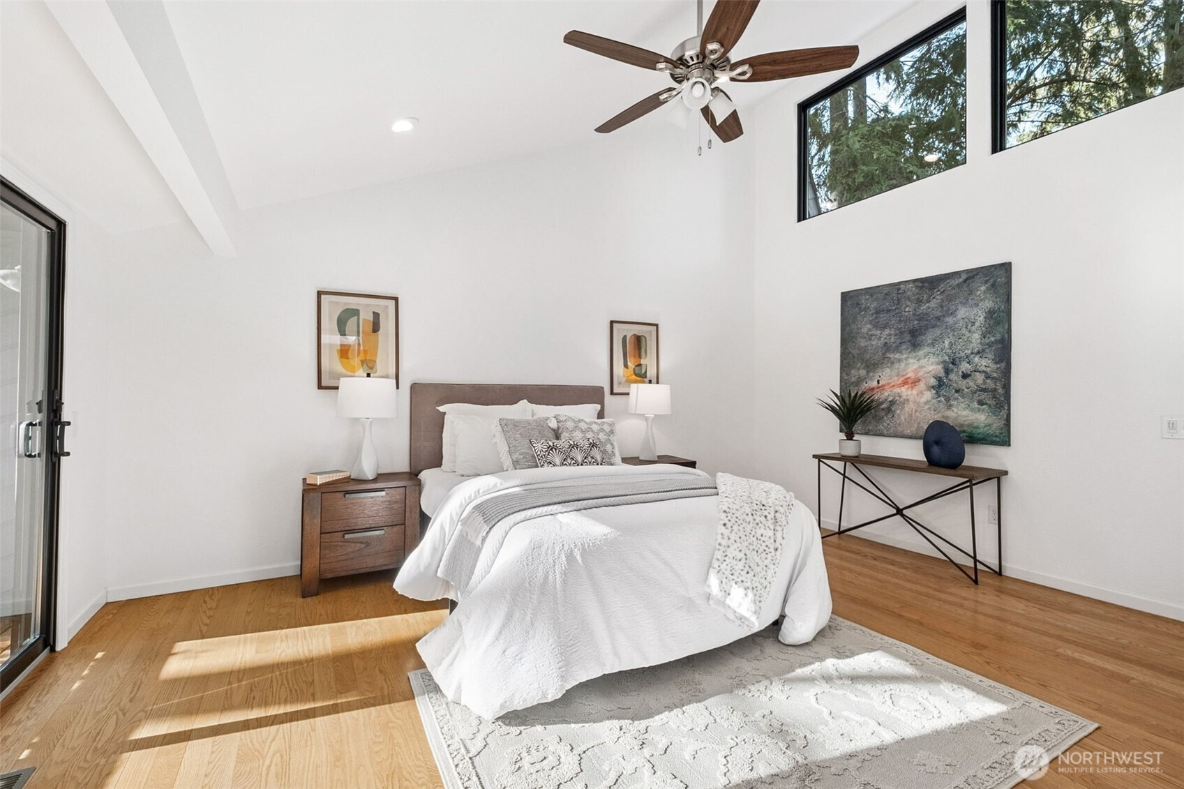 Tucked down a private cul-de-sac in the desired south Issaquah neighborhood of Mirrormont, this sun-drenched contemporary retreat offers the rare combination of elevation, privacy & a beautifully flat yard that truly sets it apart. Perched up above for added light & territorial feel, yet surrounded by usable, level grounds, this is a lifestyle opportunity buyers wait for. Step inside & immediately experience the drama of a soaring double-height entry & vaulted ceilings that carry through most of the main level. Large windows + clerestory as well, flood the home w/natural light. Interior feels both open & connected to the surrounding greenery. The remodeled kitchen is a true centerpiece, featuring rich cherry cabinetry & an entire wall of pantry-style storage to meet every organizational need, along w/peninsula island offering casual breakfast seating. Additional space for breakfast table, reading nook, or relaxed lounge area, perfect for morning coffee or evening wine. Main-level primary suite is a peaceful retreat w/vaulted ceiling & expansive windows + remodeled bath w/spacious walk-in shower. 2 additional bdrms—or home office option. The LL expands the home’s functionality w/generous family room perfect for media, play, or gathering + huge walk out deck! 2 additional bdrms or flex rooms + 3/4 bath enhances potential for guest or MIL living. Flat lot has room to run, garden, entertain, & play, w/athletic court & storage shed. Mirrormont has optional community amenities!